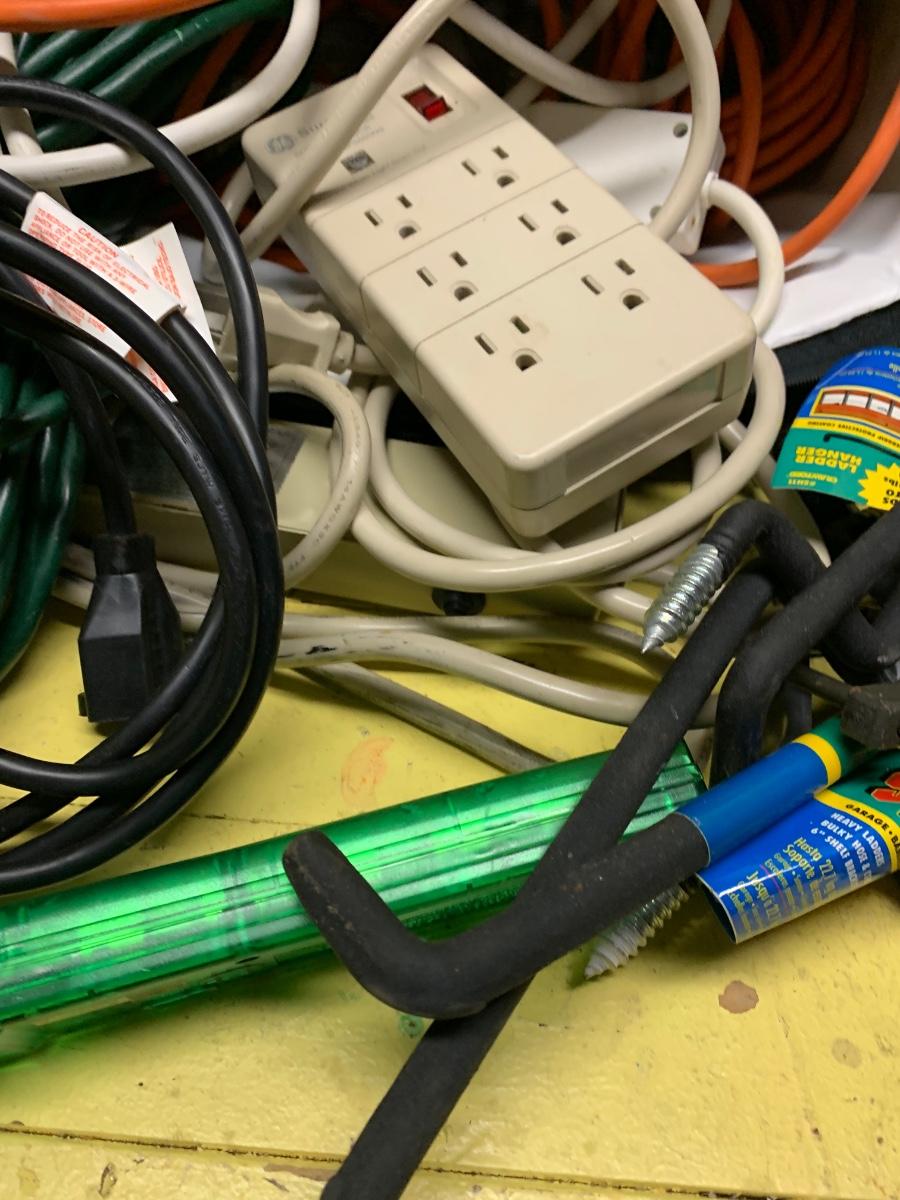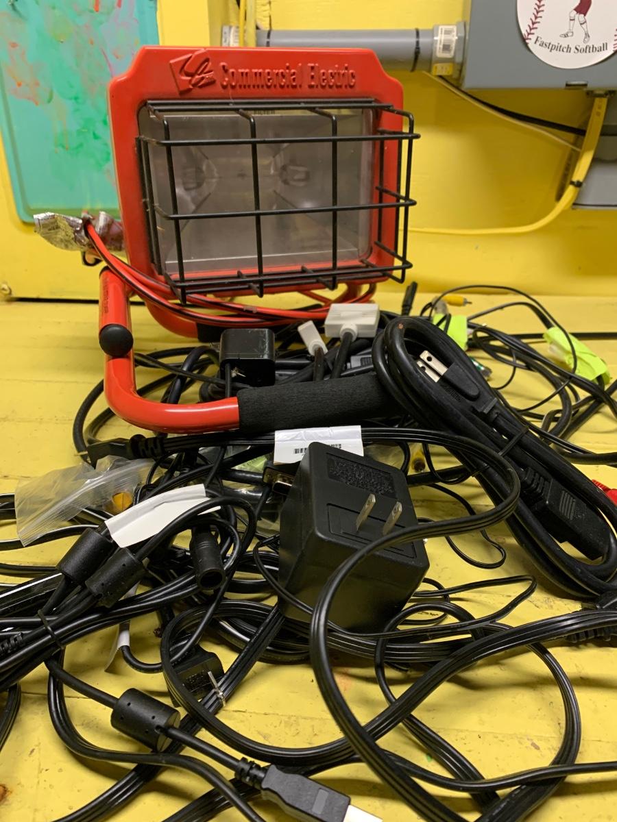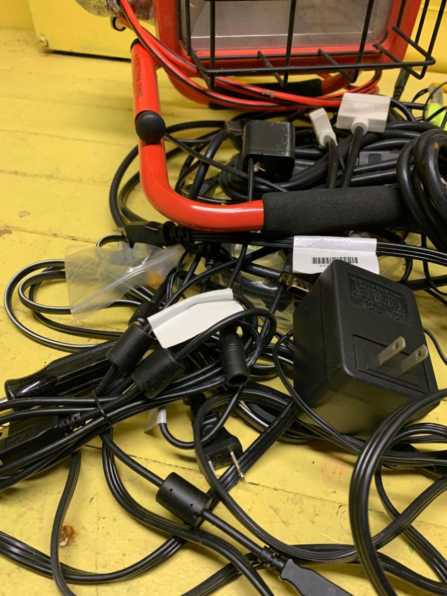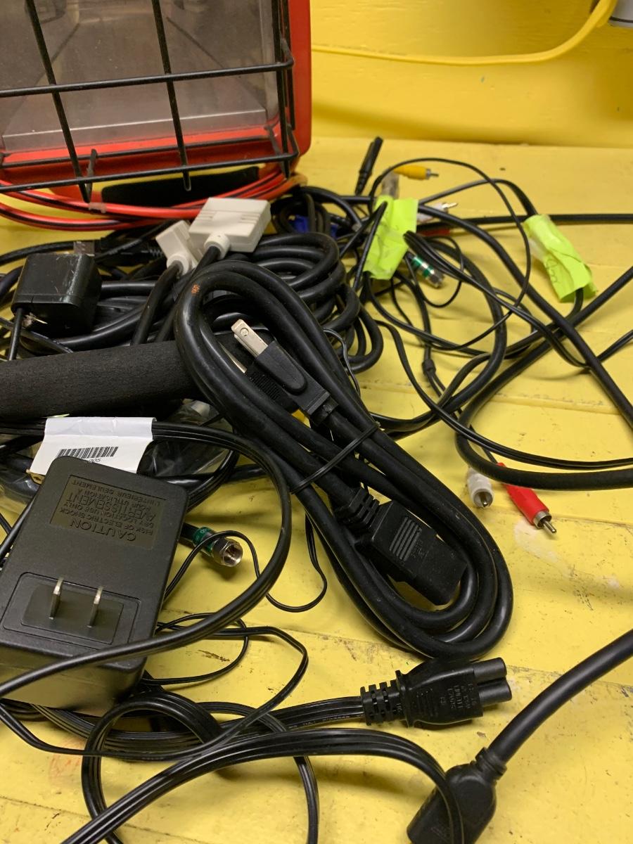 Various cords and cables. Extension cords and mixed in computer wires. Lamp is untested Some clamps and other tools