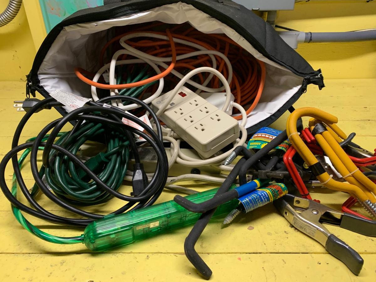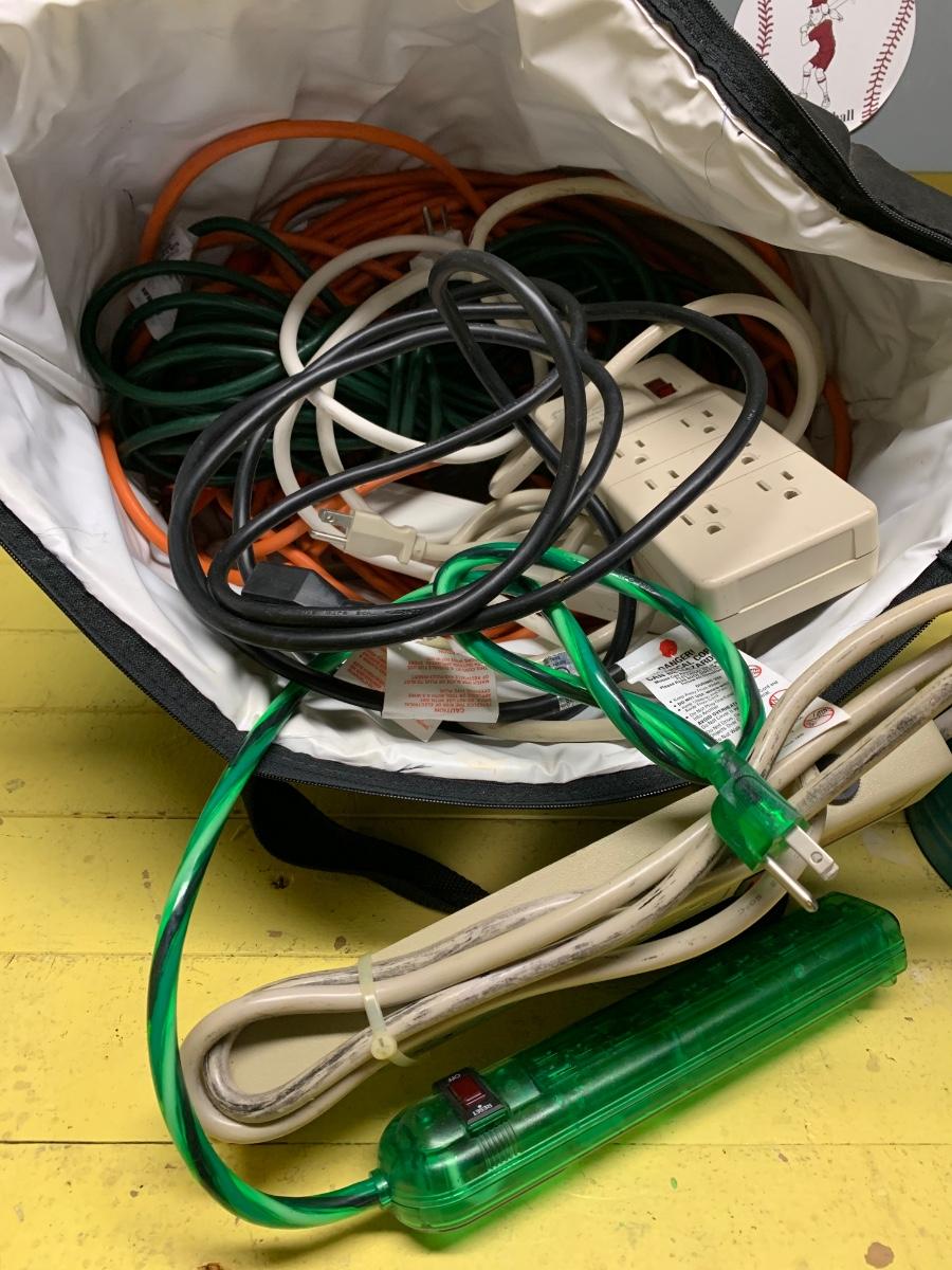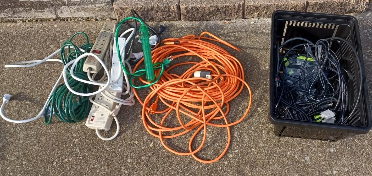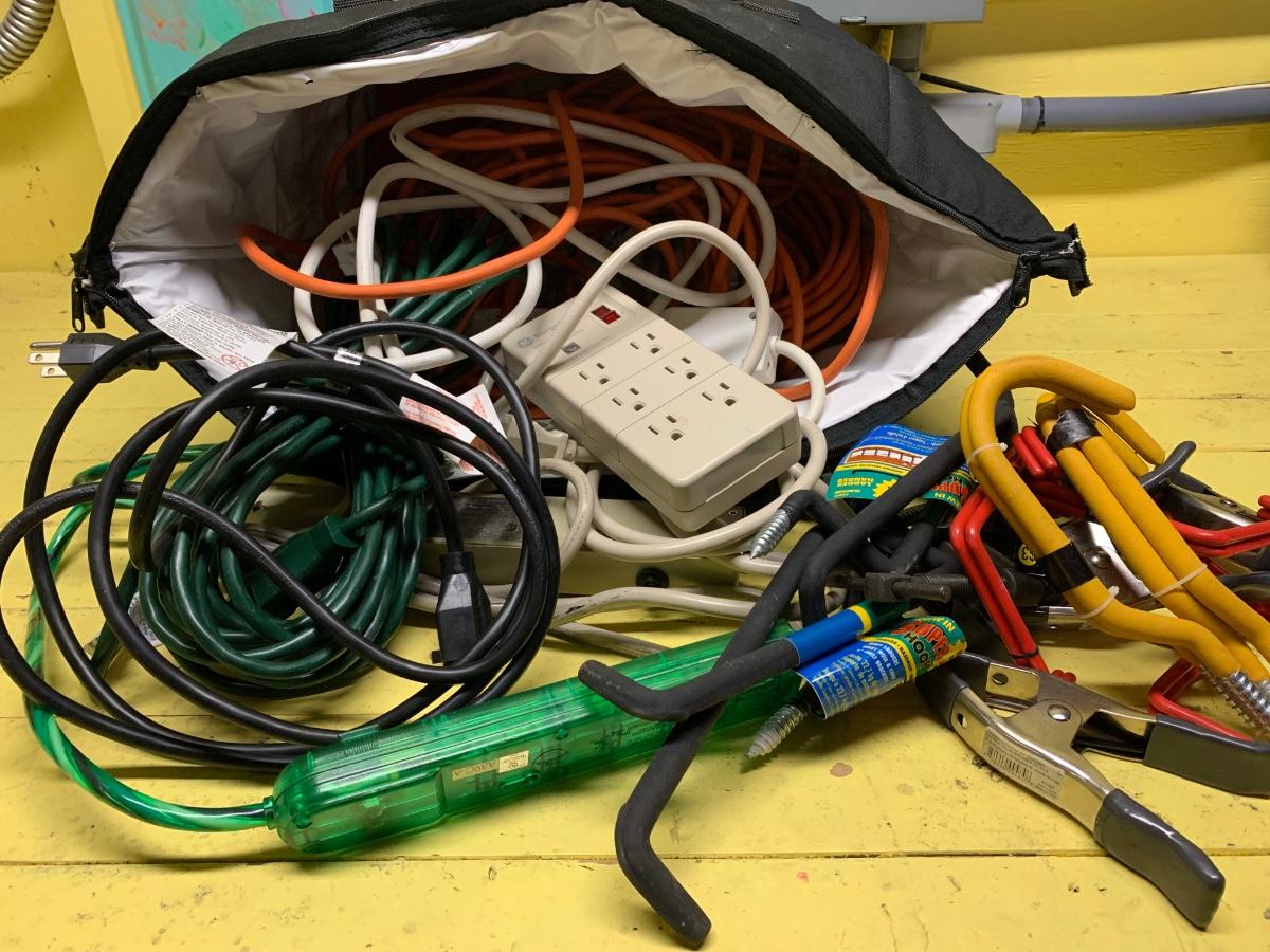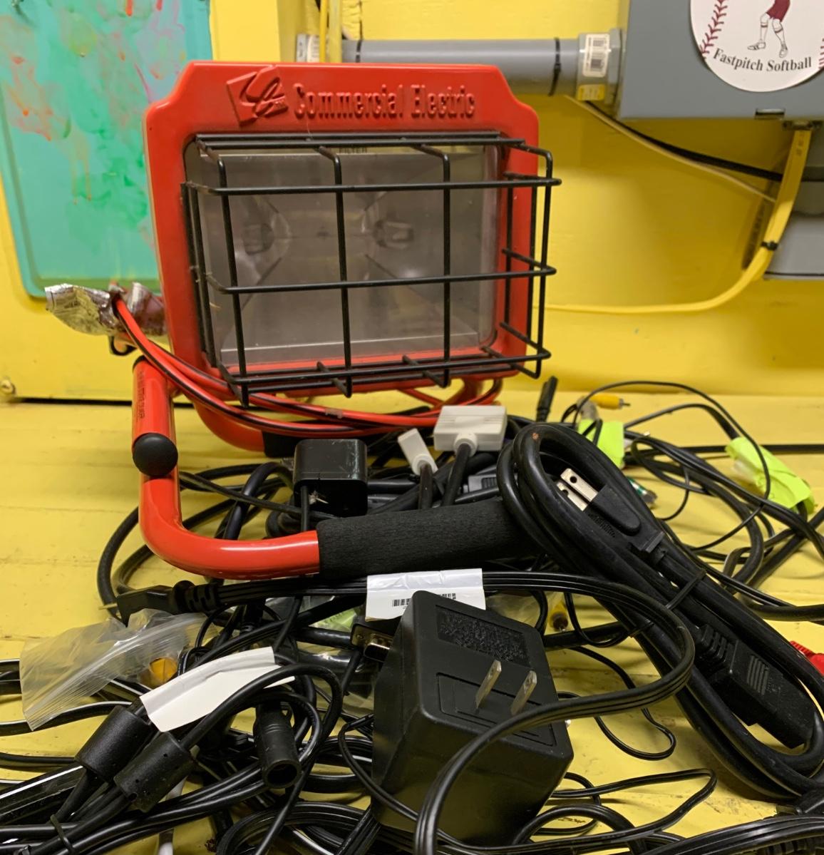 Various cords and cables. Extension cords and mixed in computer wires. Lamp is untested Some clamps and other tools