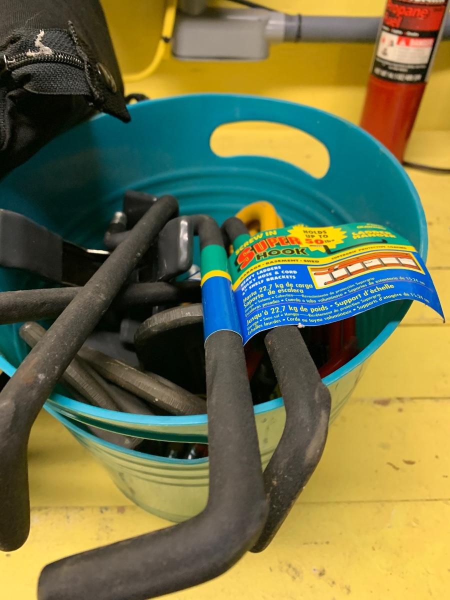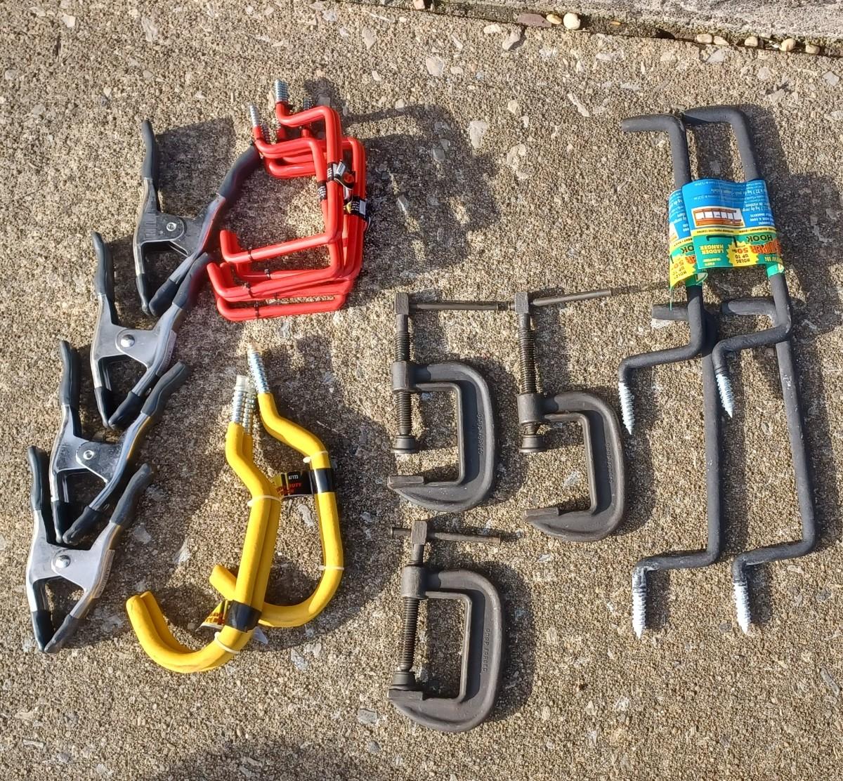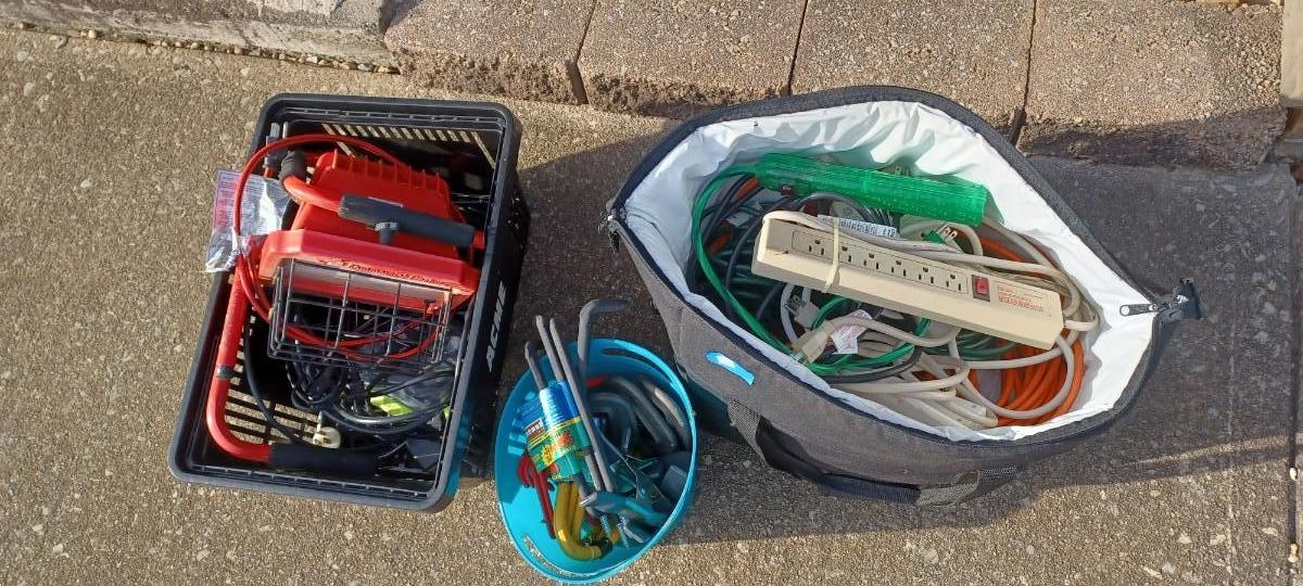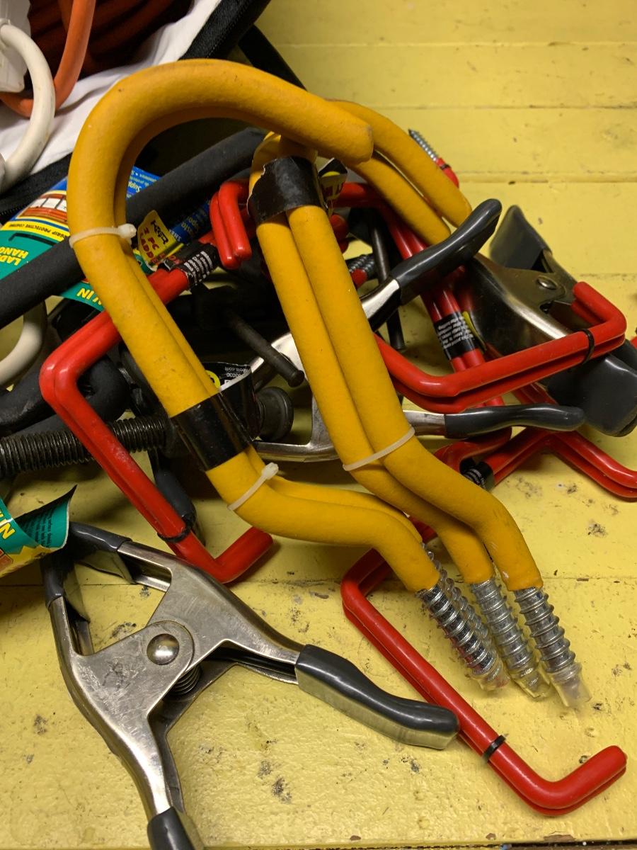 Various cords and cables. Extension cords and mixed in computer wires. Lamp is untested Some clamps and other tools