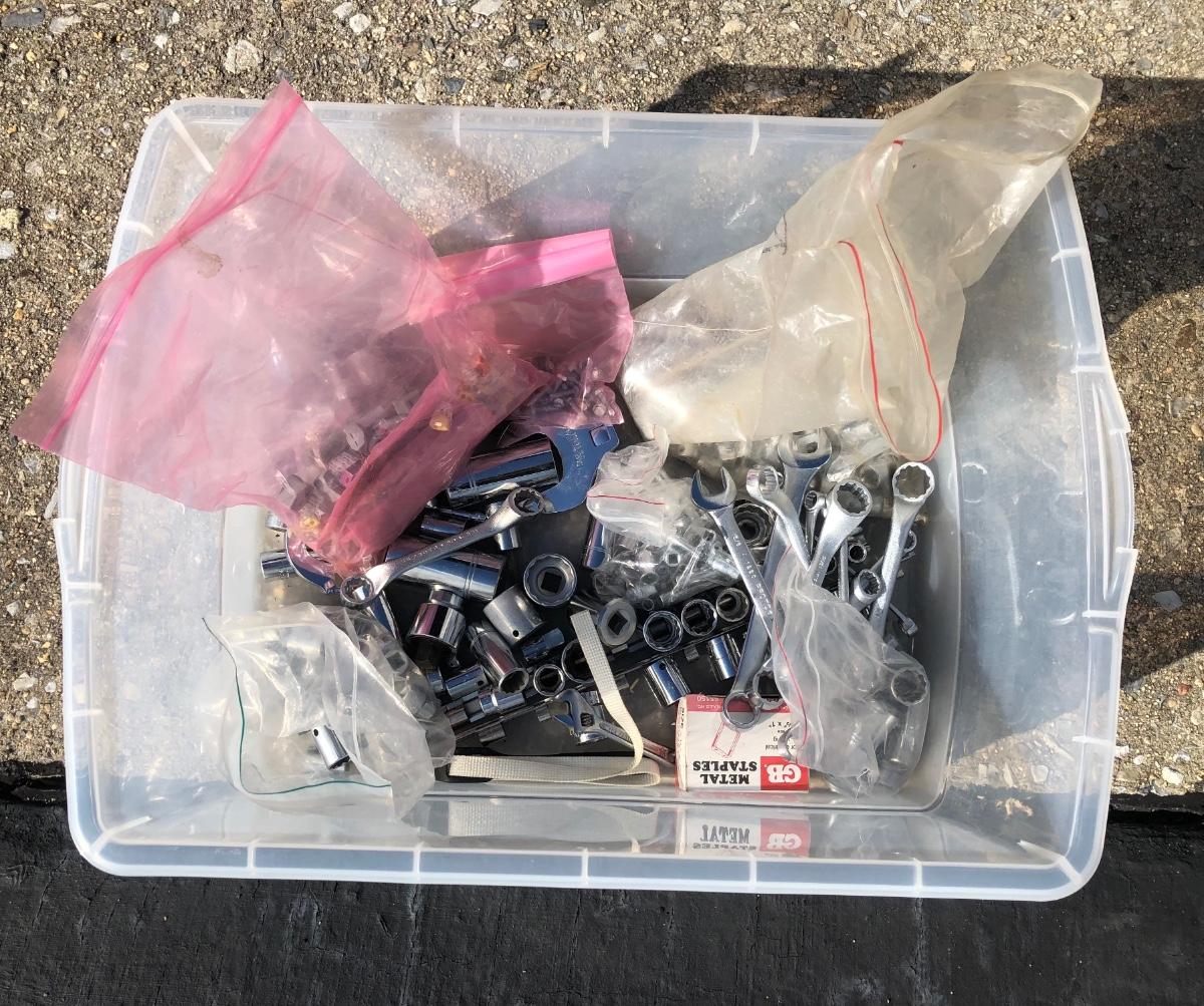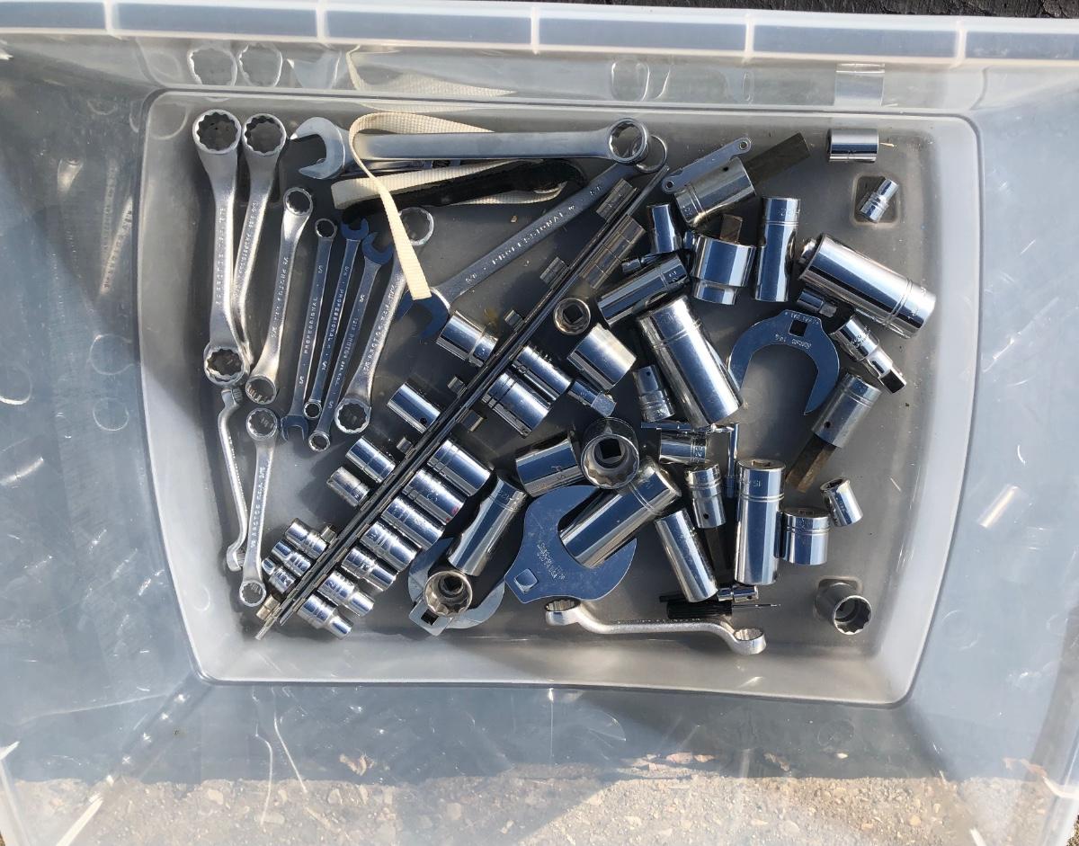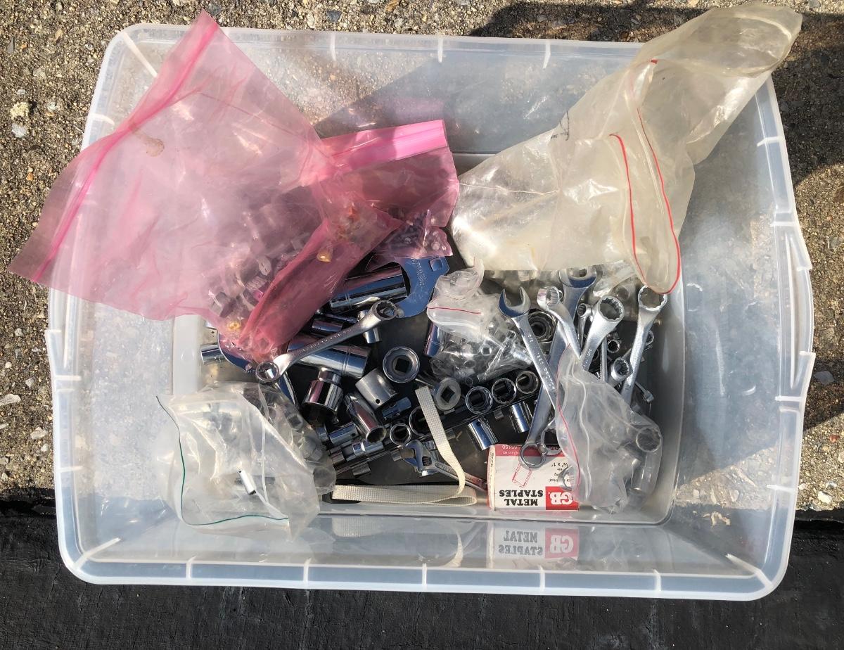 LOT132M: Tote of Tools Lot: Wrenches, Sockets, Fuses and More