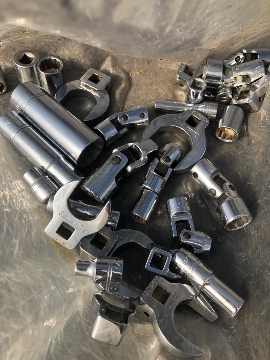 Tote with a variety of sockets, wrenches, fuses. and more.