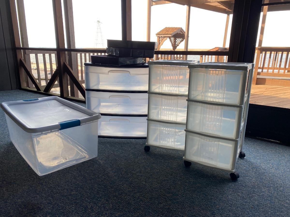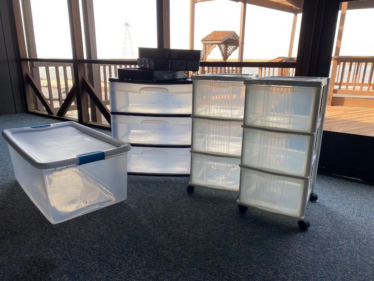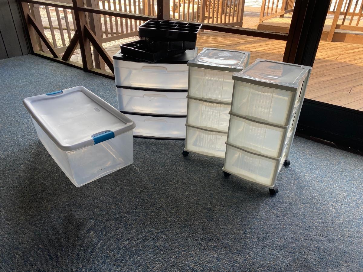 Three rolling three-drawer storage bins, a clear tote with lid, and two drawer organizers.