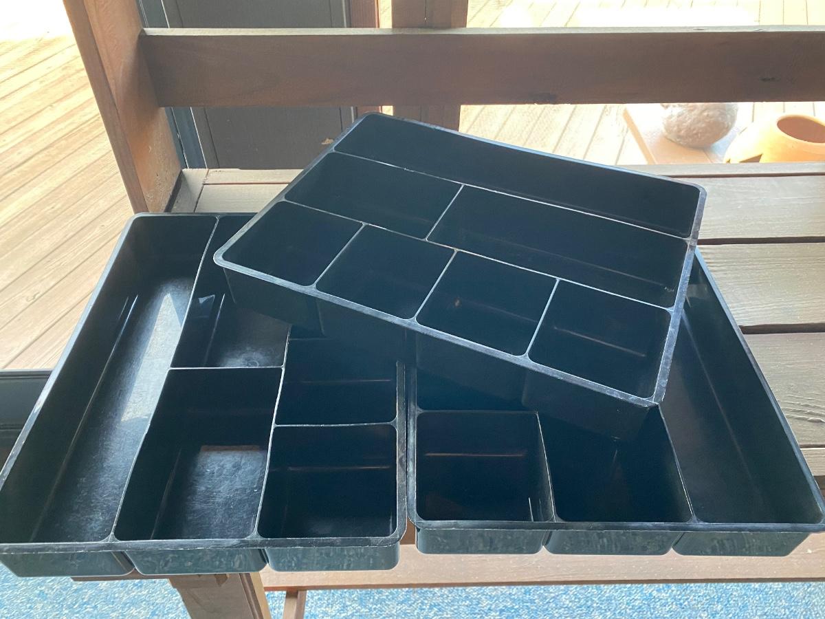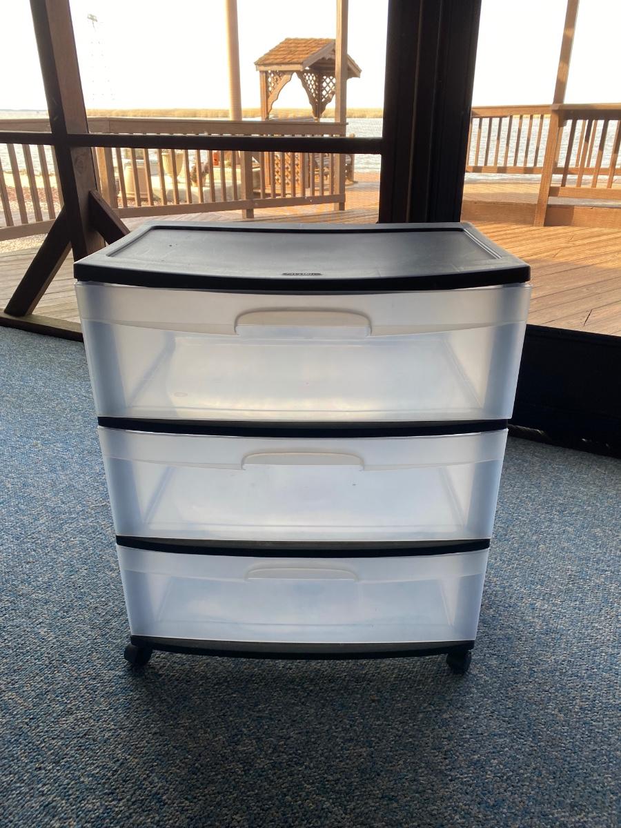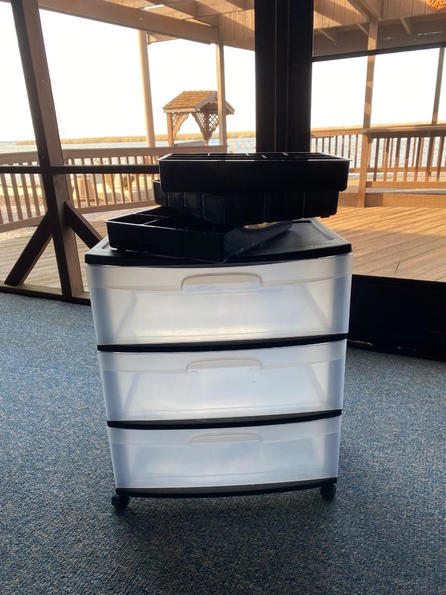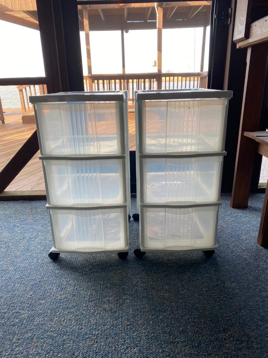 Three rolling three-drawer storage bins, a clear tote with lid, and two drawer organizers.