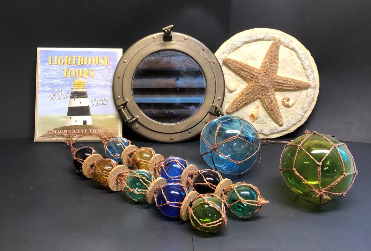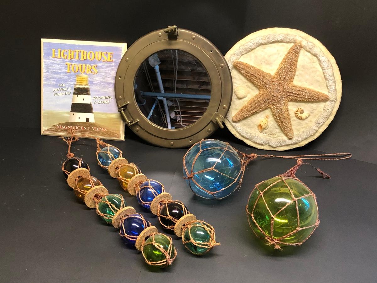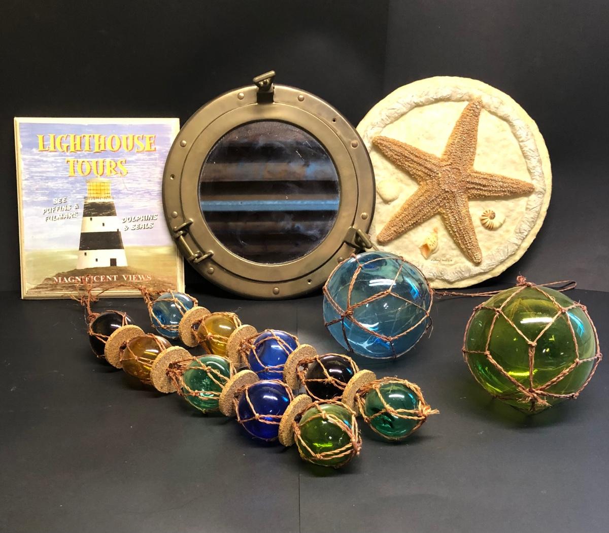 LOT 149: Glass Fishing Floats/Fish Net Buoy Ball, Porthole Mirror, Lighthouse & Starfish Deco