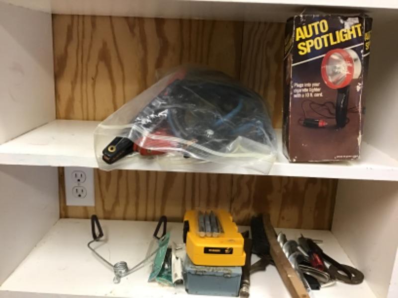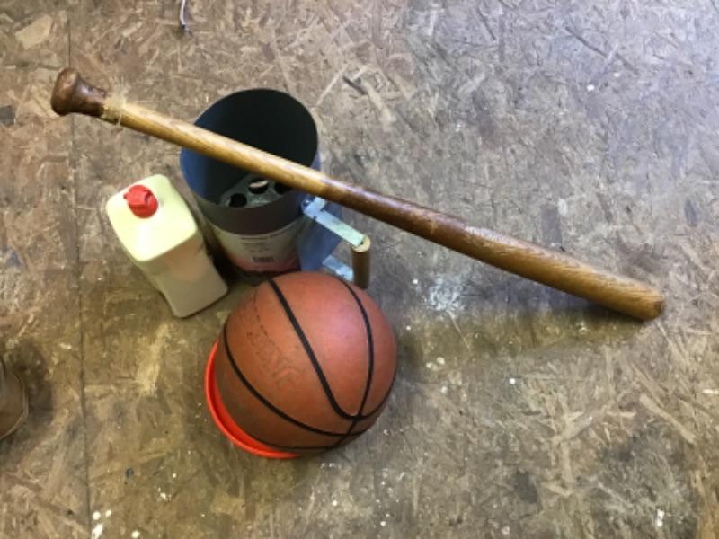 BASEBALL BAT, BASKETBALL, FRISBEE, UNIQUE CHARCOAL-LIGHTING TOOL, LIGHTER FLUID, MISCELLANEOUS SMALL TOOLS