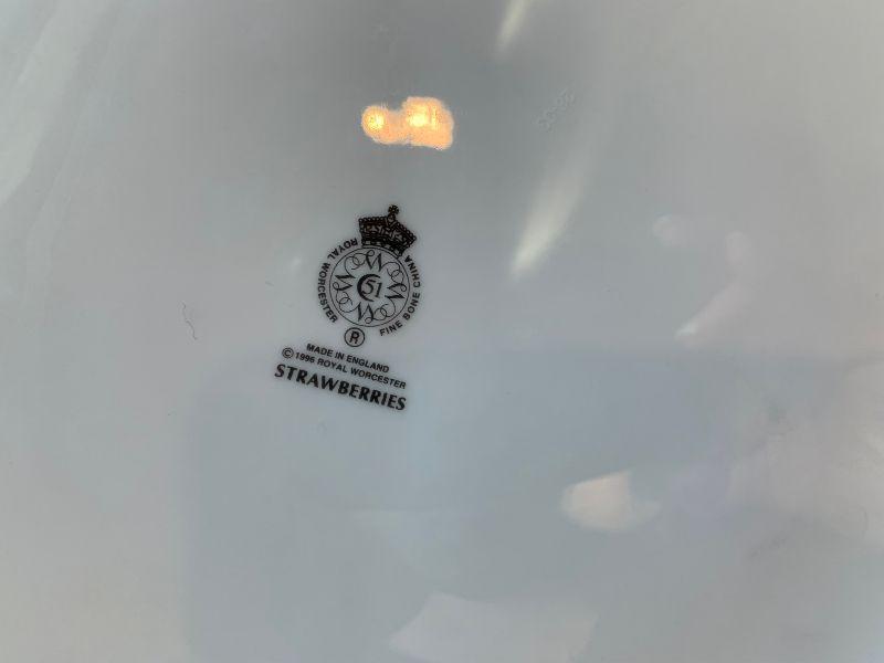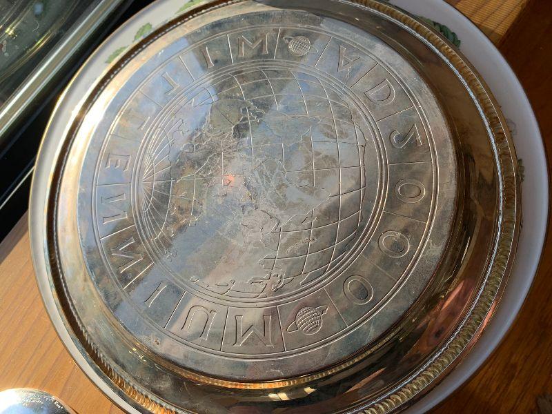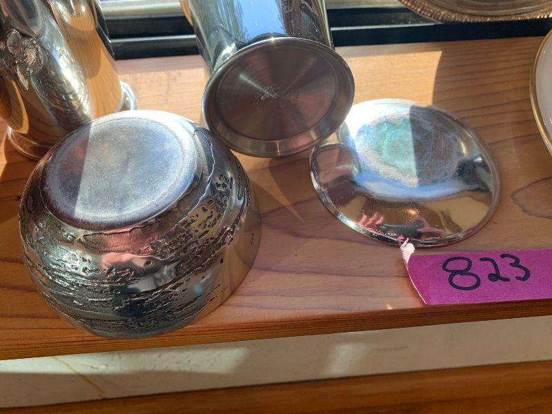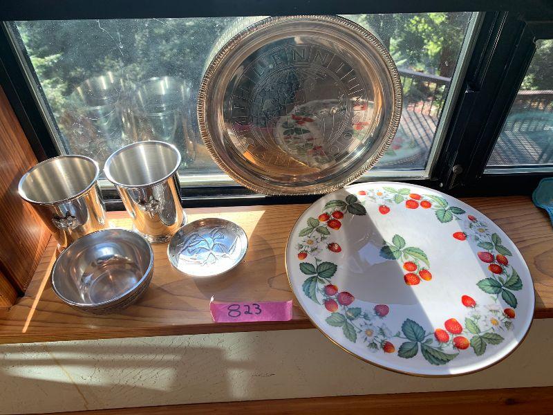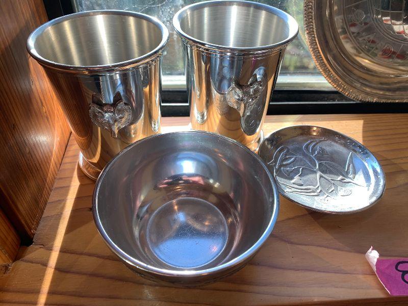 Strawberry plate, silver plated round tray, 1 bowl, 1 small round dish, 2 woodbury pewter cups with wolf heads on the front