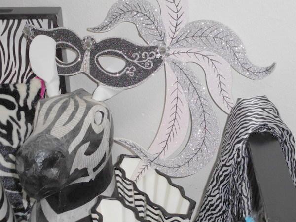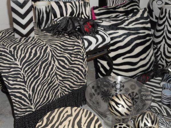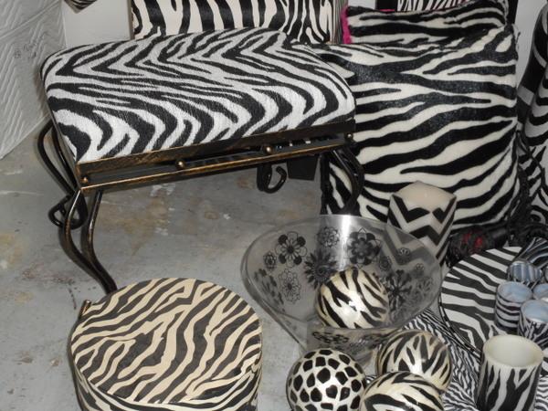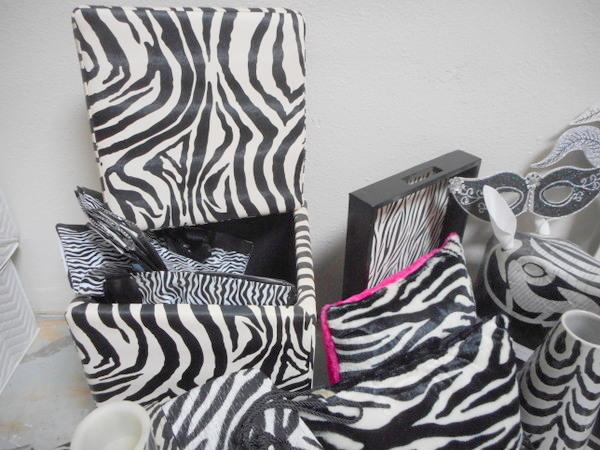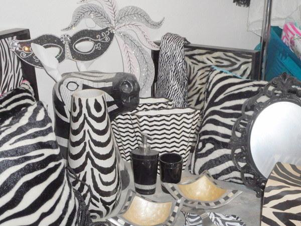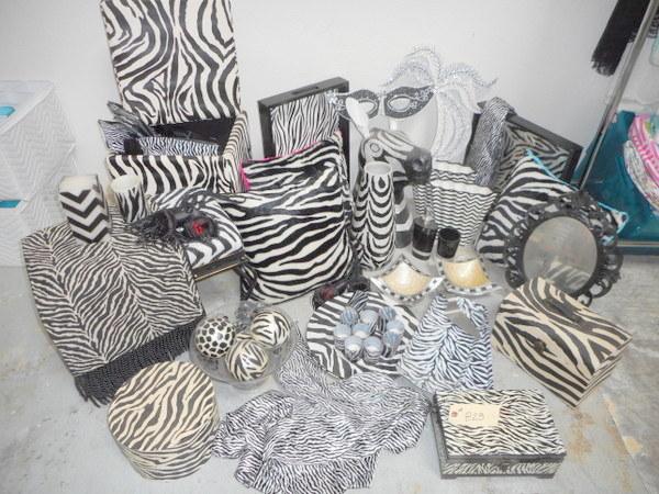 Massive themed lot with mirror, cube containers, shopping bags, wooden trays, scarves, pillows and much more - all zebra print