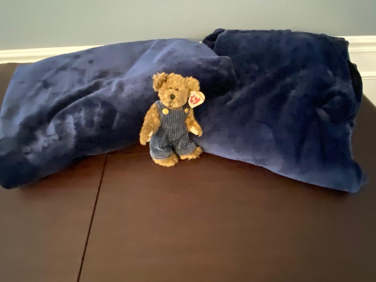 LOT 37C: Pillows, Blankets, Bear and Frame