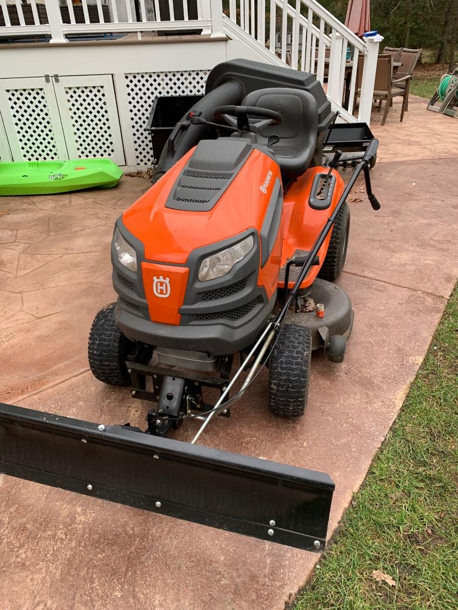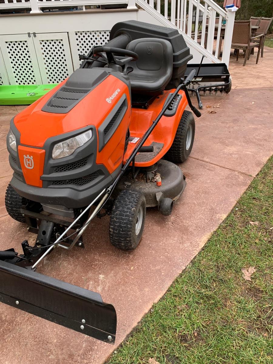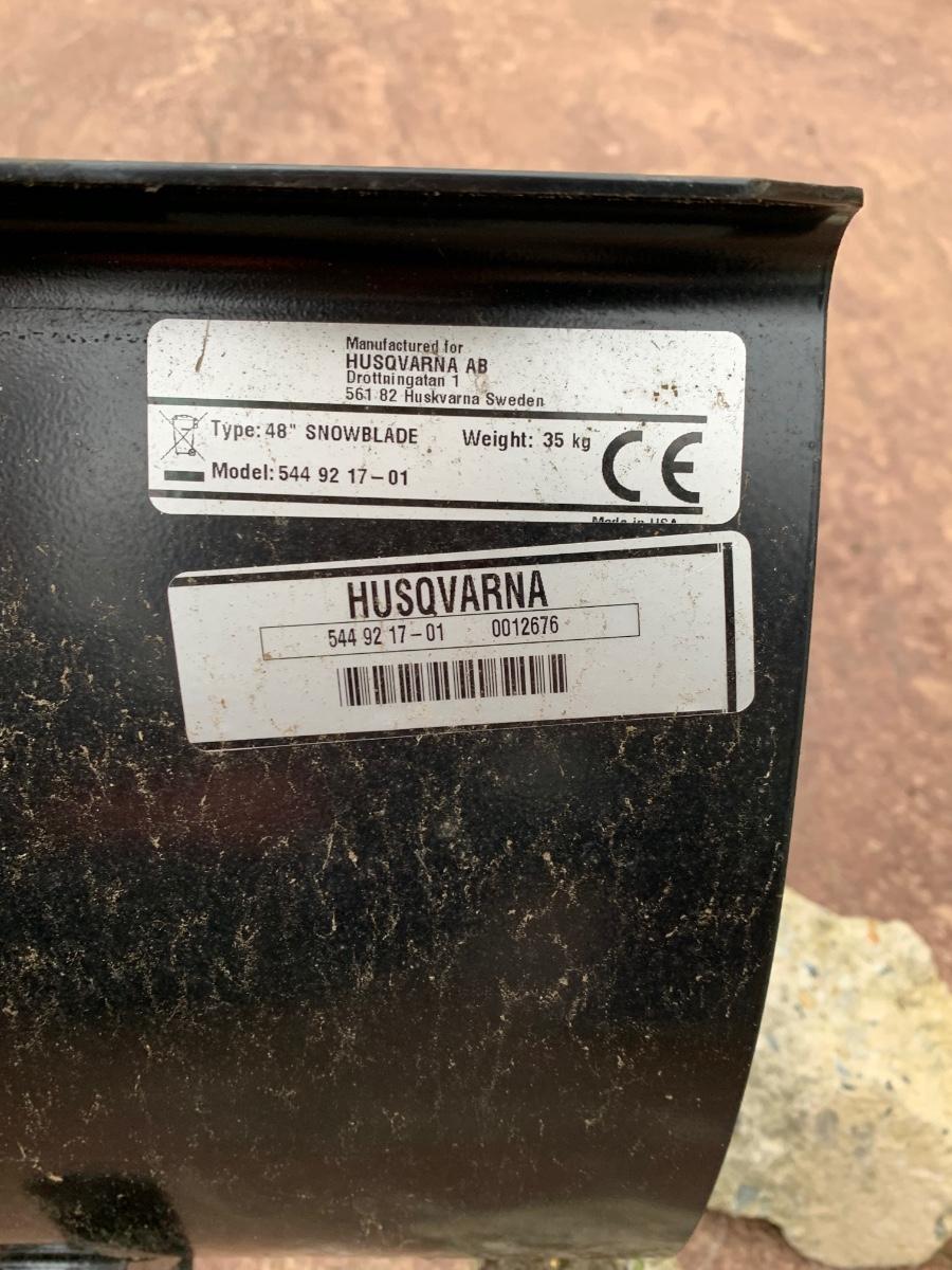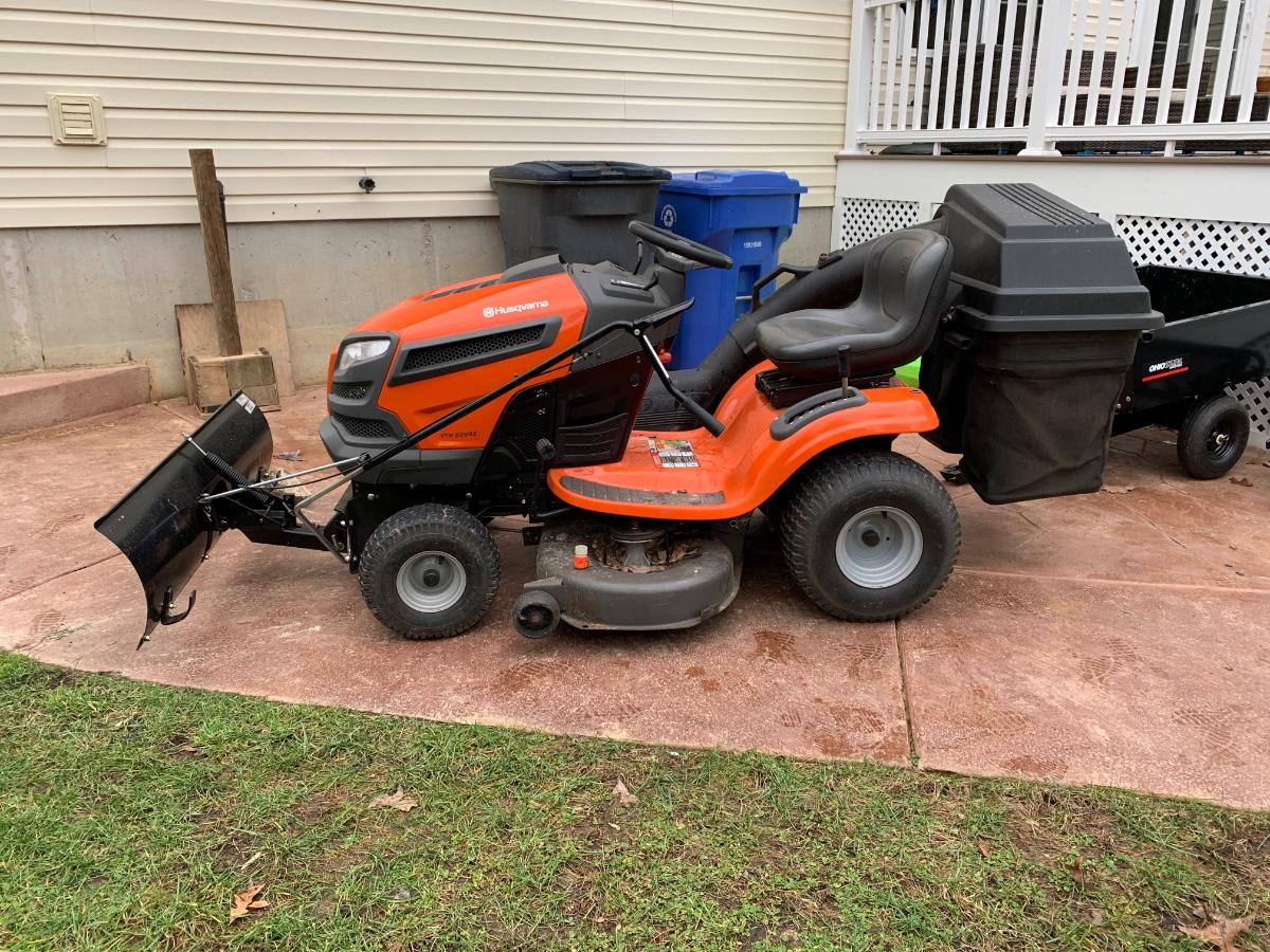 Includes riding mower with a Husqvarna 48" snowblade model 544 97 17-01, Brinley-Hardy plow model A8-405H and Ohio Steel cart attachments.