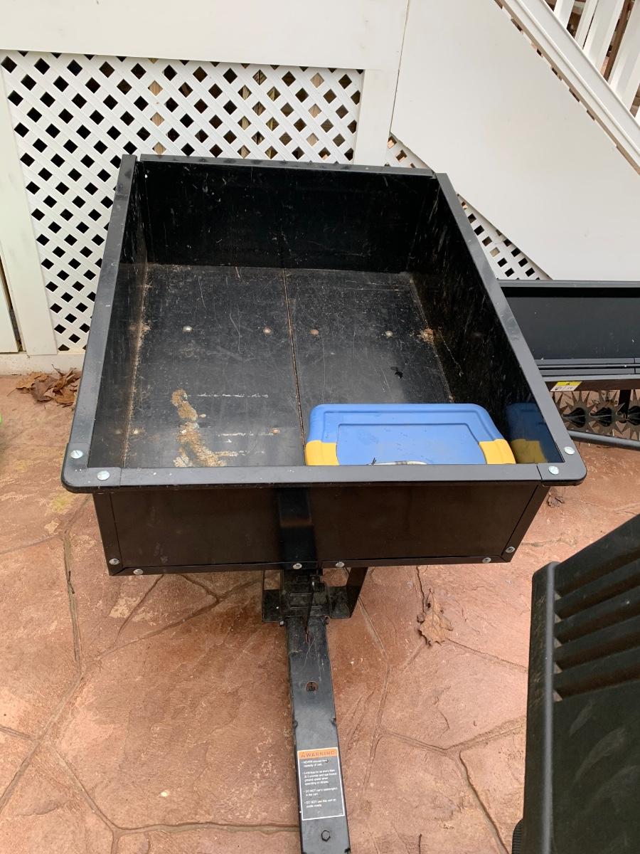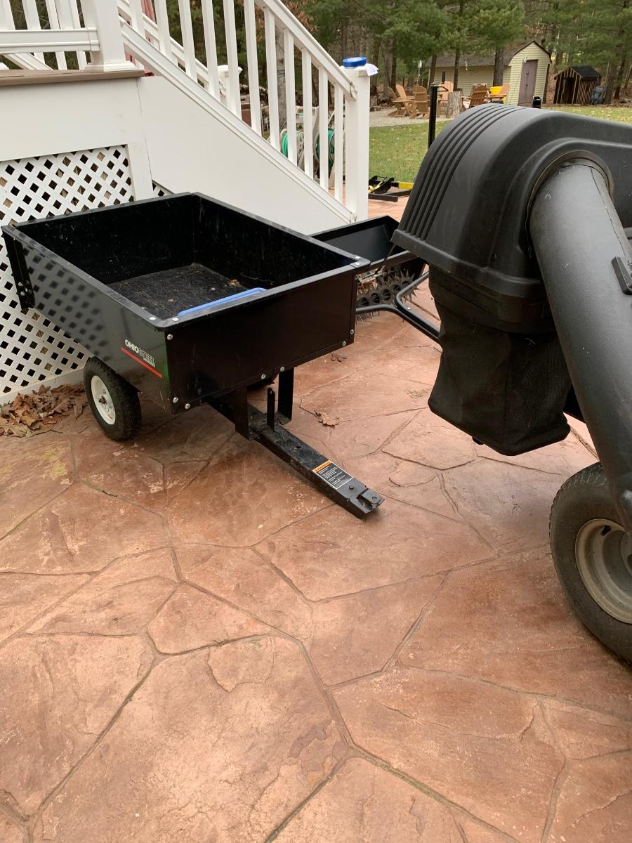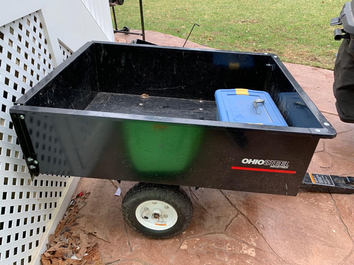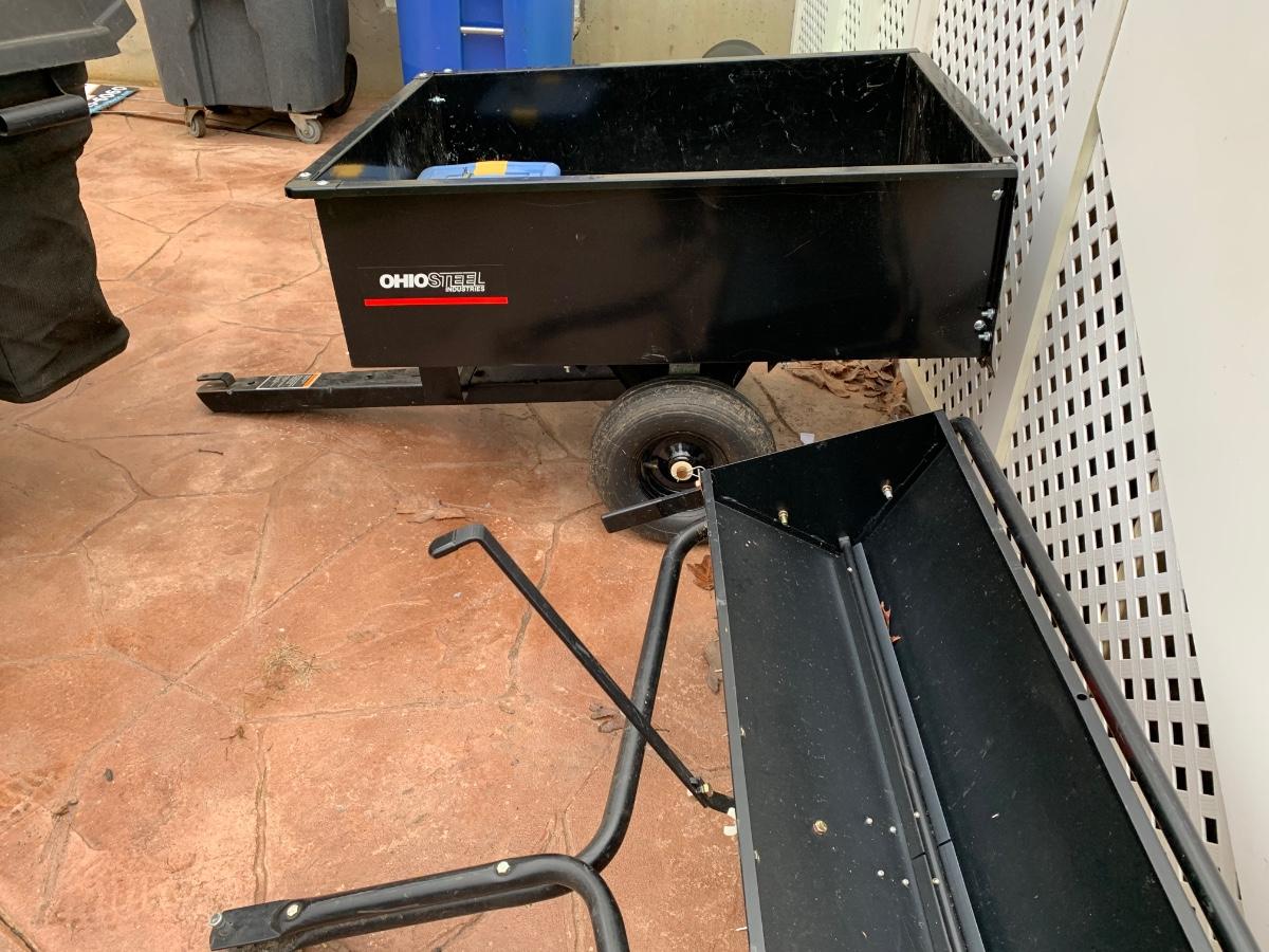 Includes riding mower with a Husqvarna 48" snowblade model 544 97 17-01, Brinley-Hardy plow model A8-405H and Ohio Steel cart attachments.