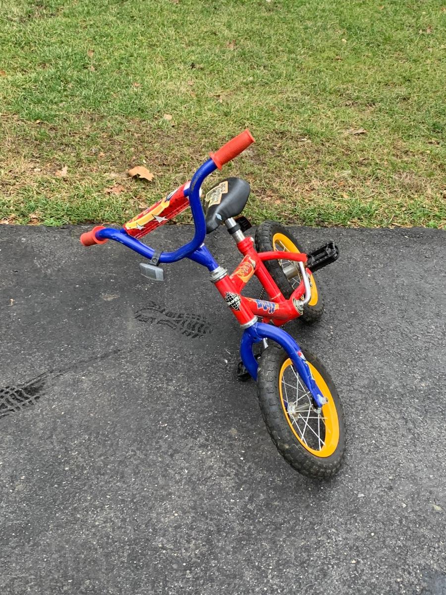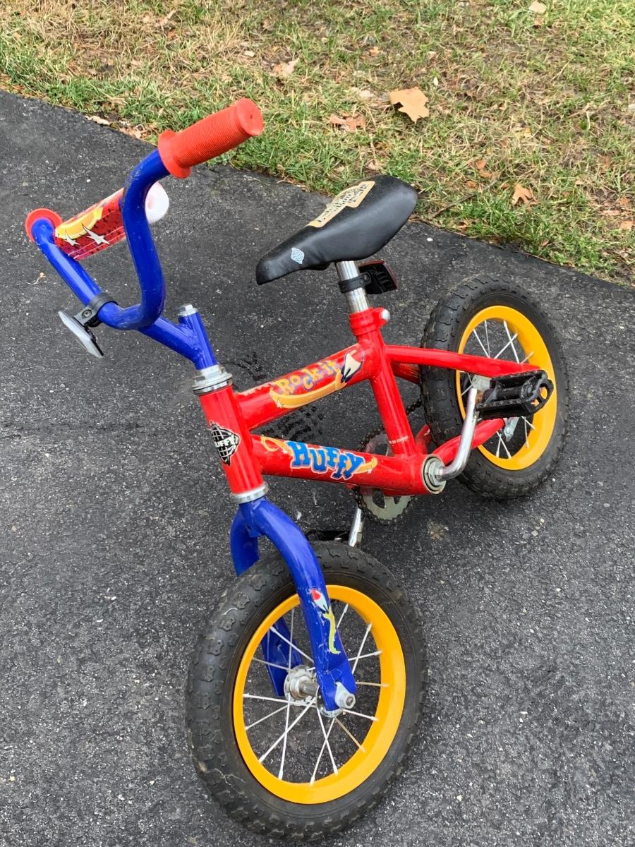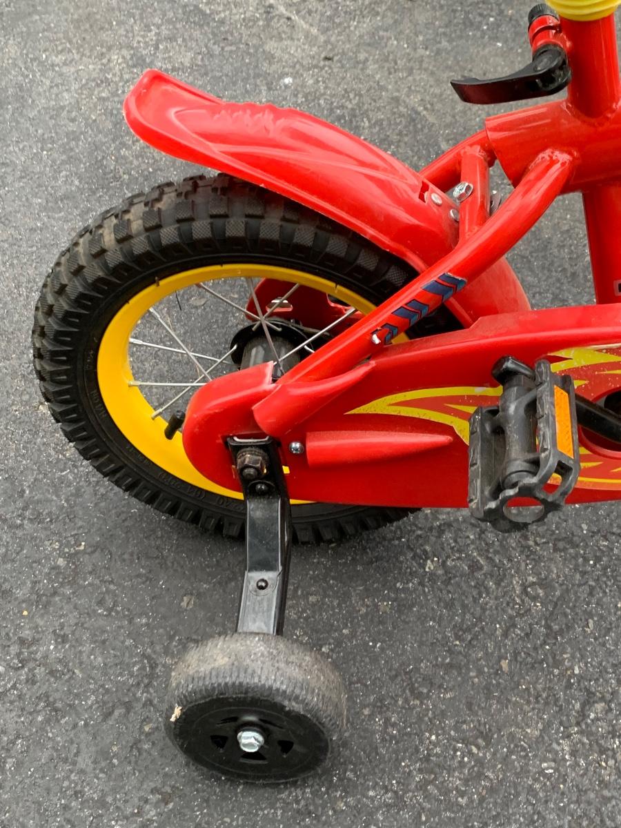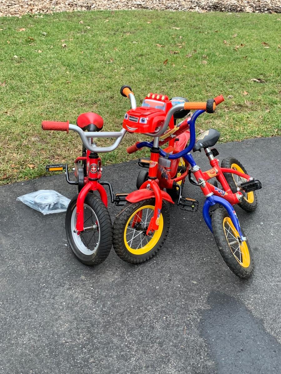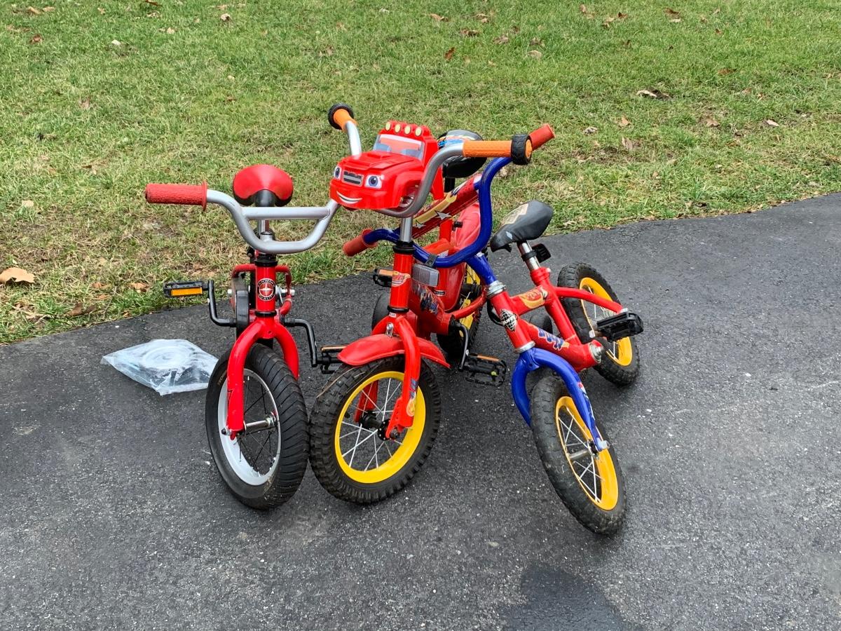 Includes three children's bikes and training wheels. The Blaze bike has training wheels on it as well.