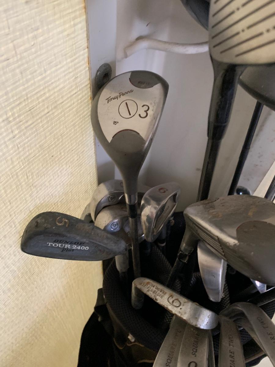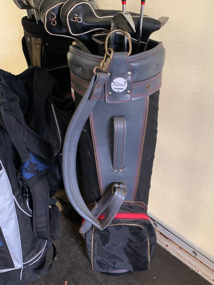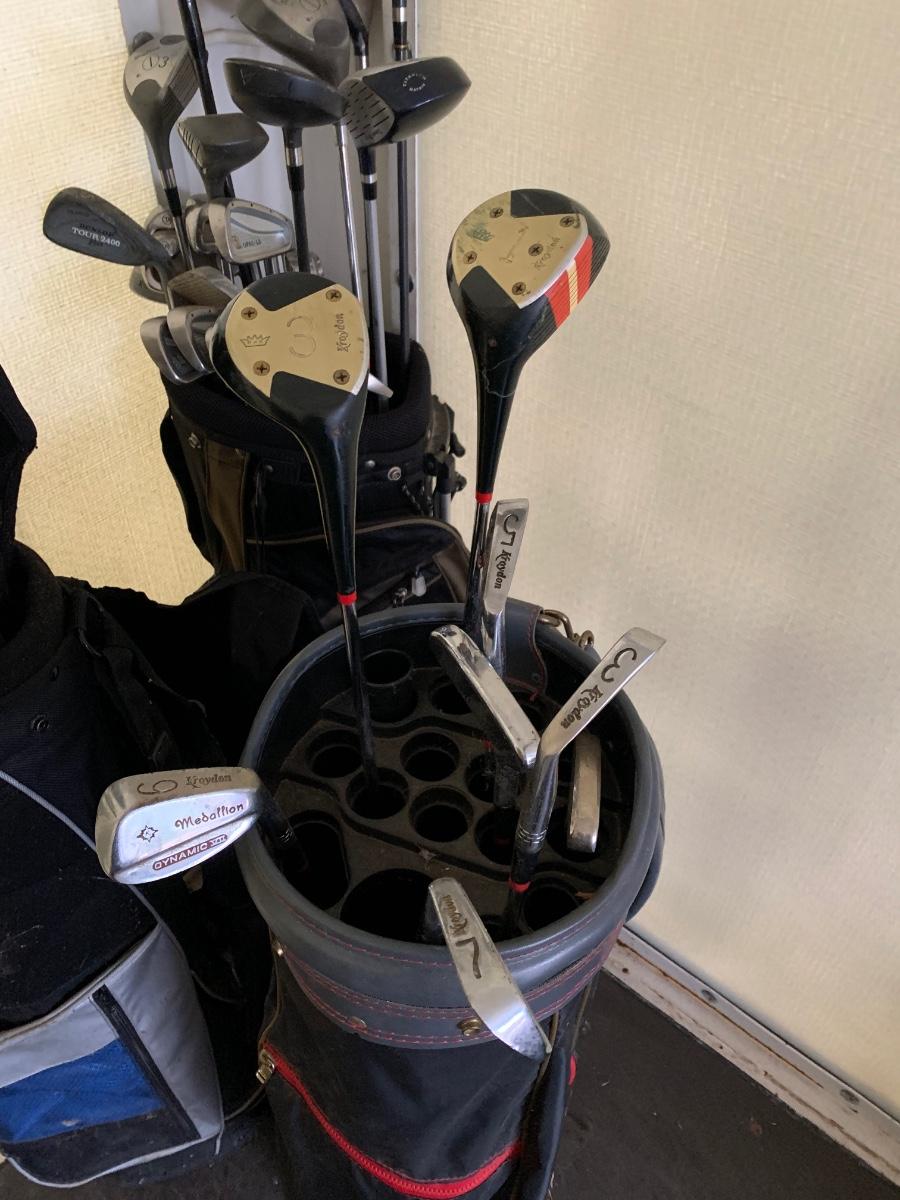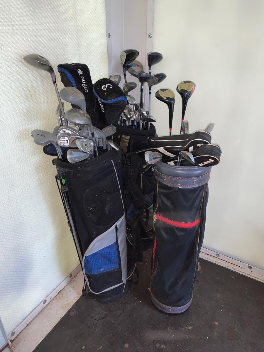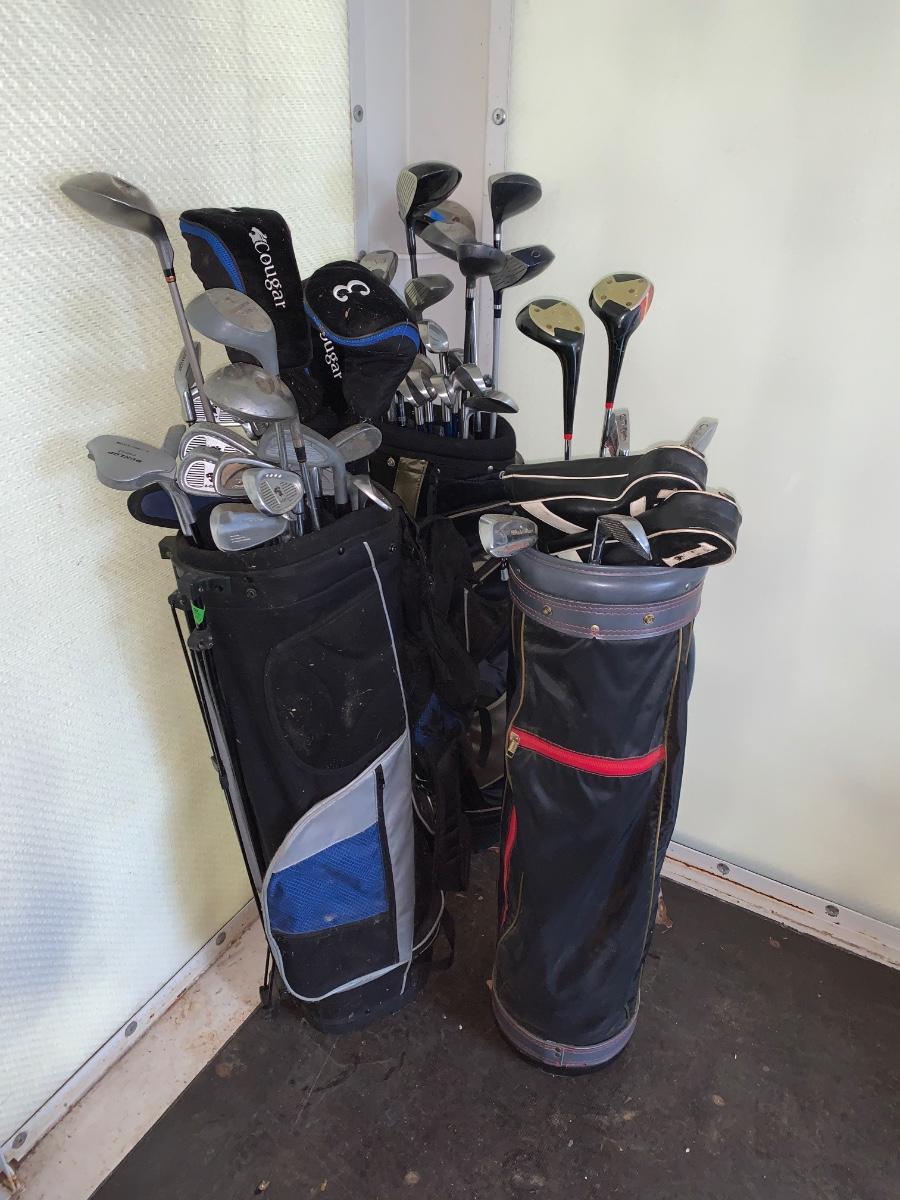 Large collection of various used golf clubs by different makers and 3 golf bags.