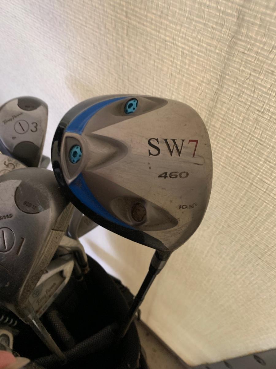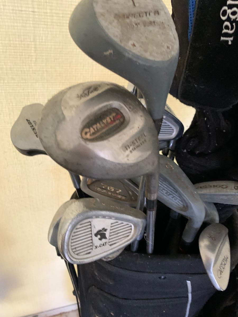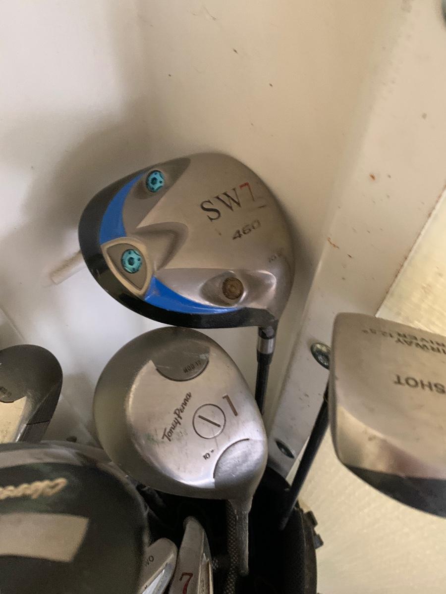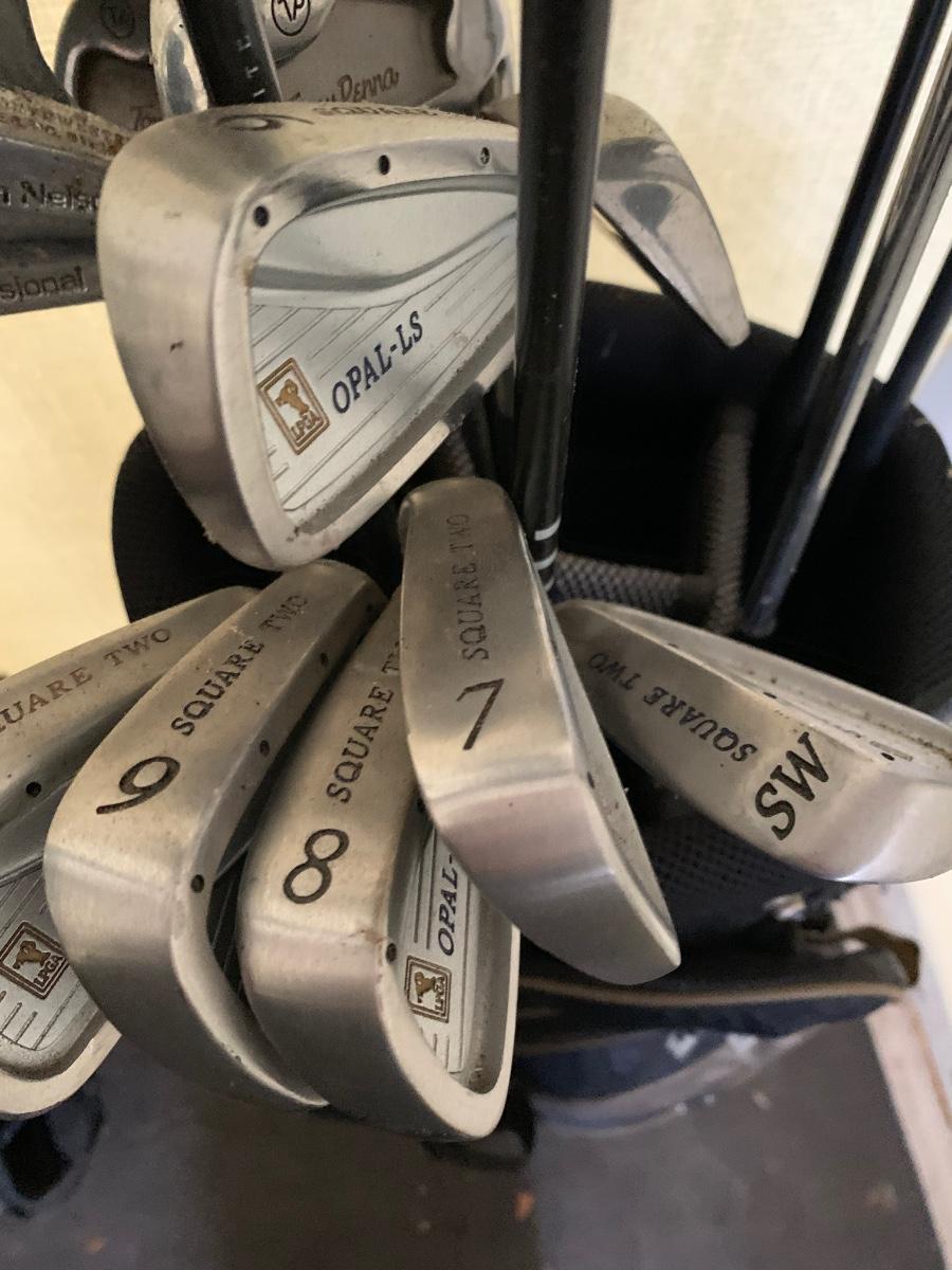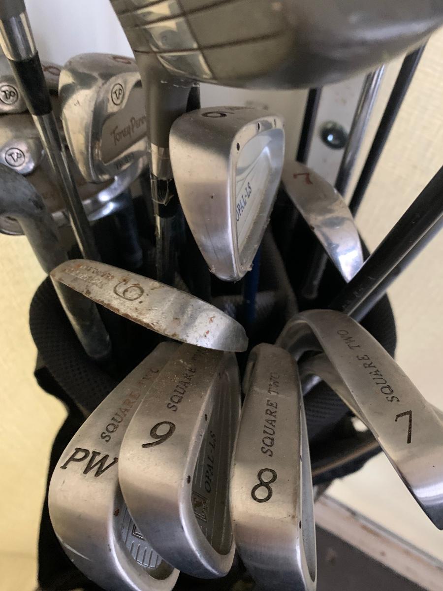 Large collection of various used golf clubs by different makers and 3 golf bags.