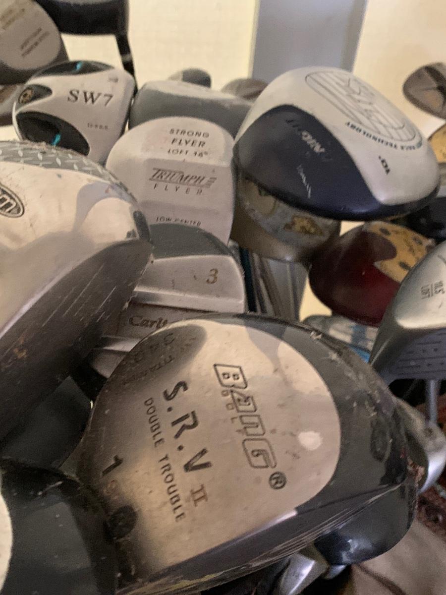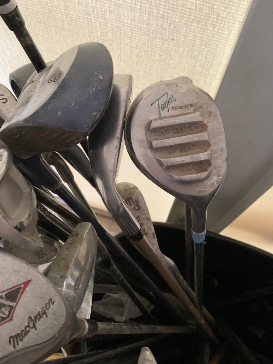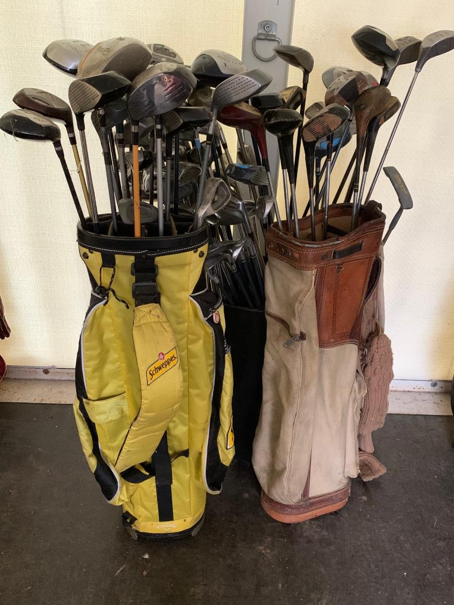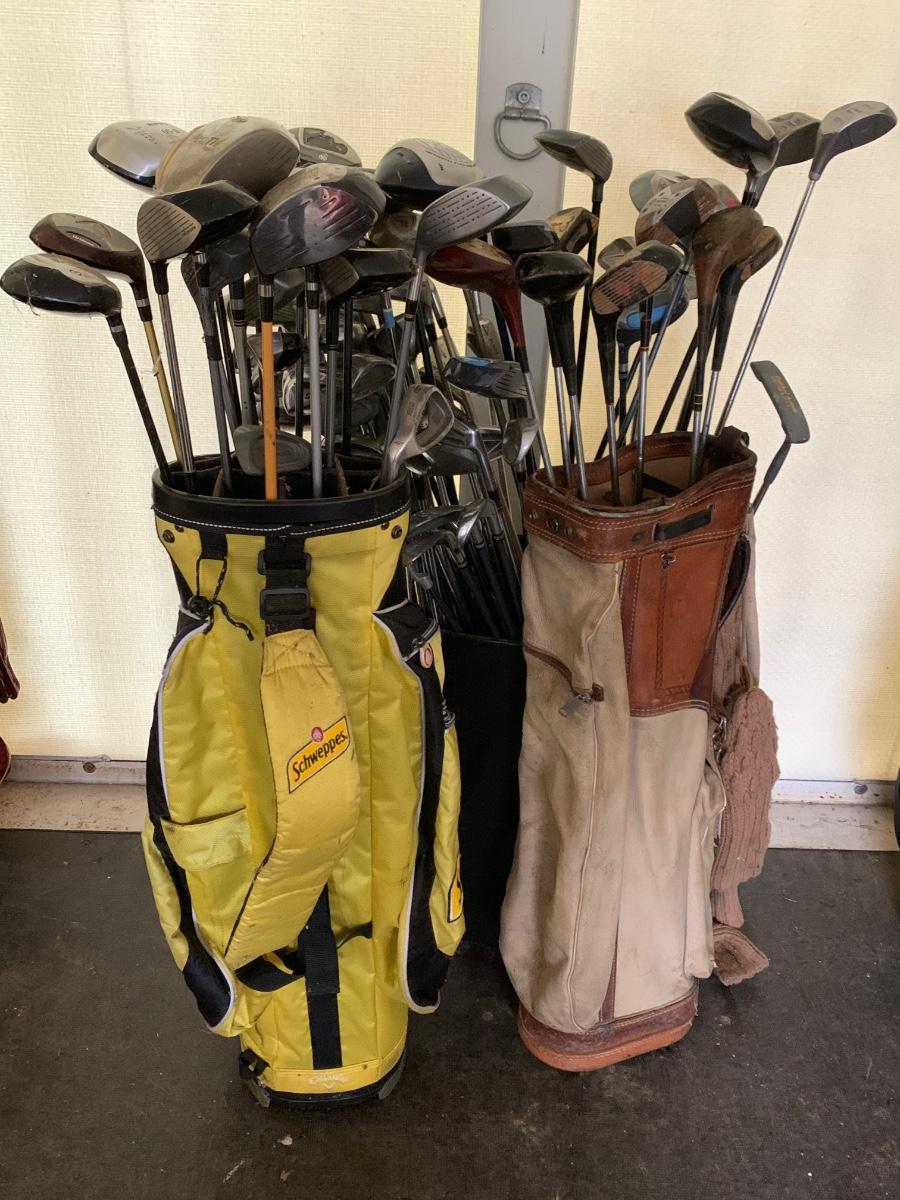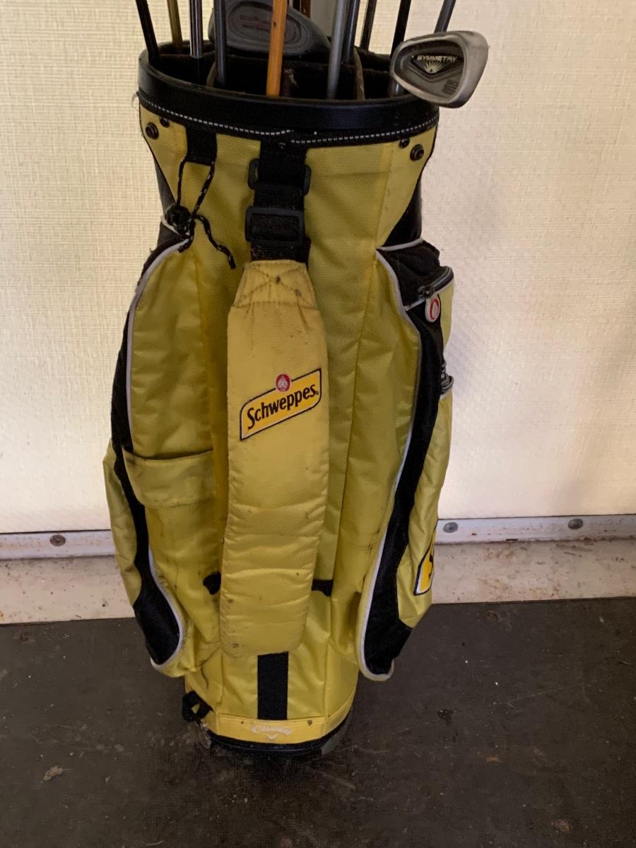 Includes a Callaway Schweppes bag, a tan vintage bag, and a black bin filled with clubs.