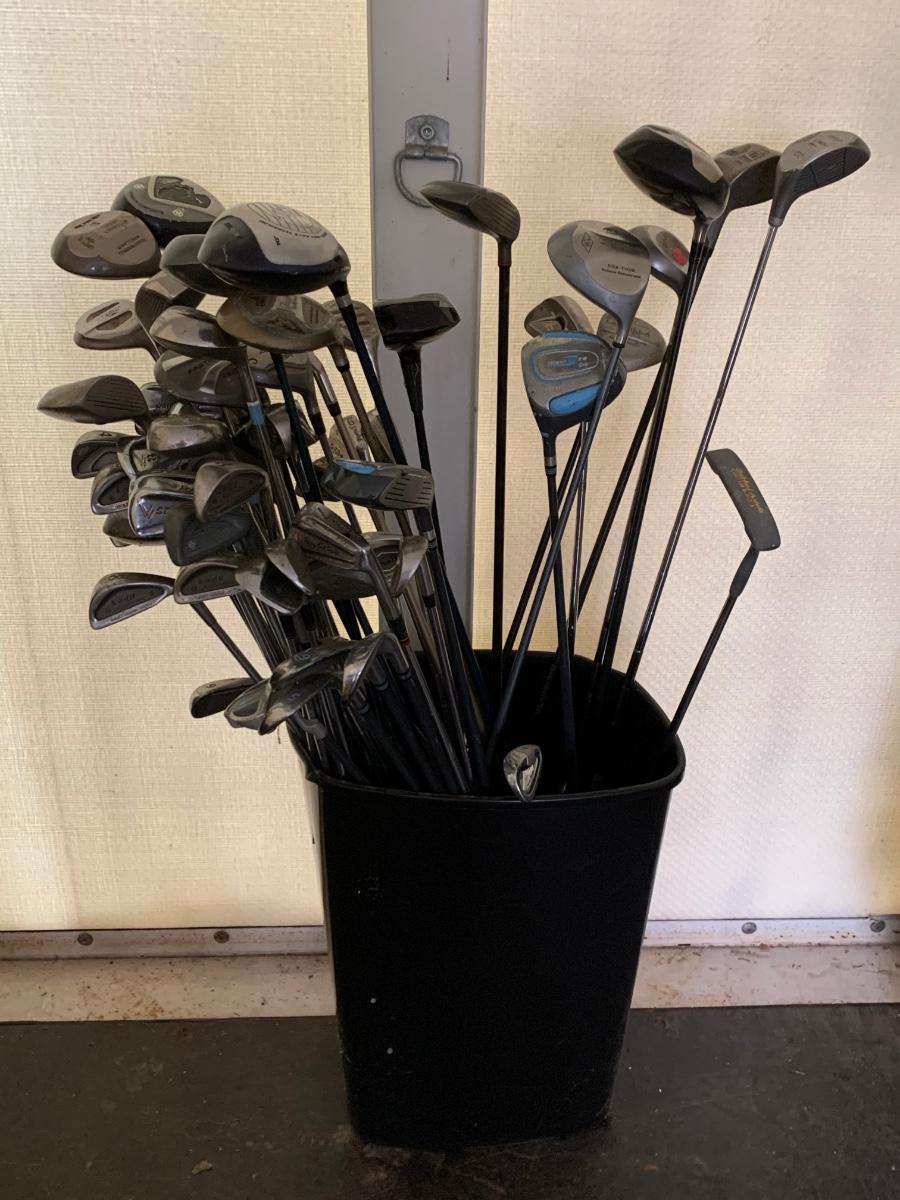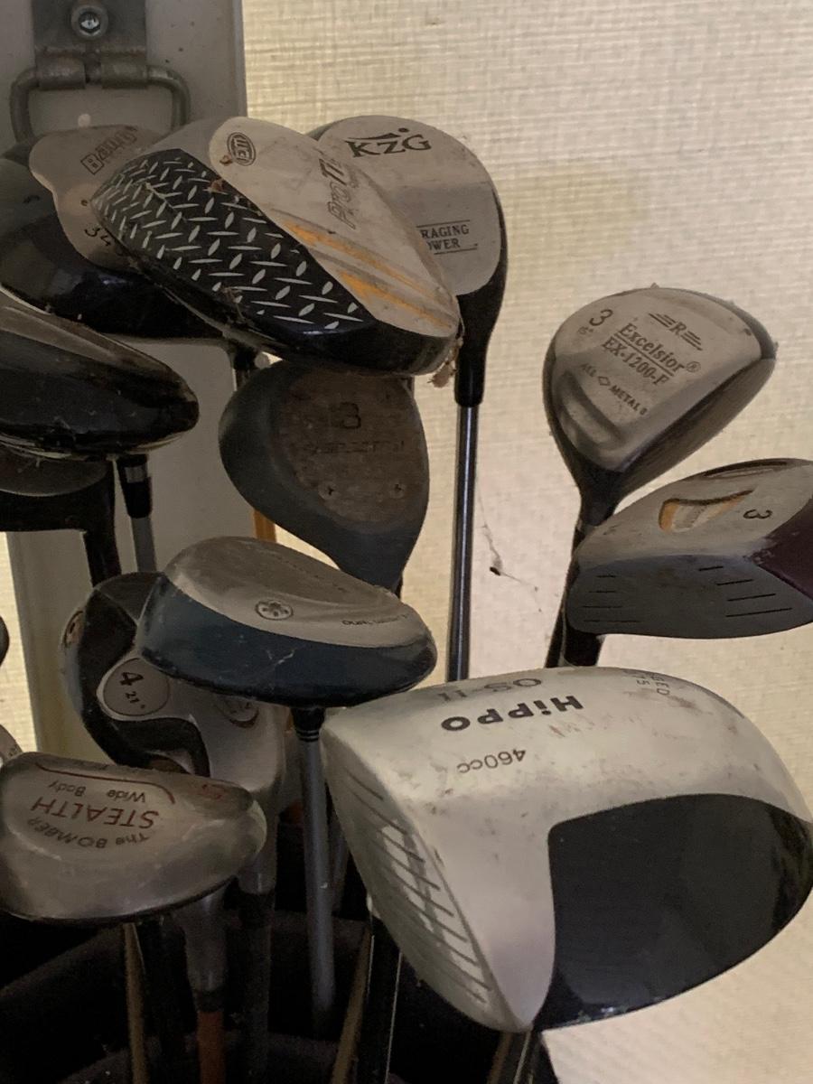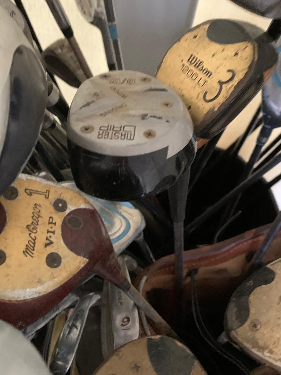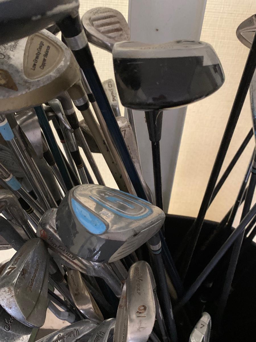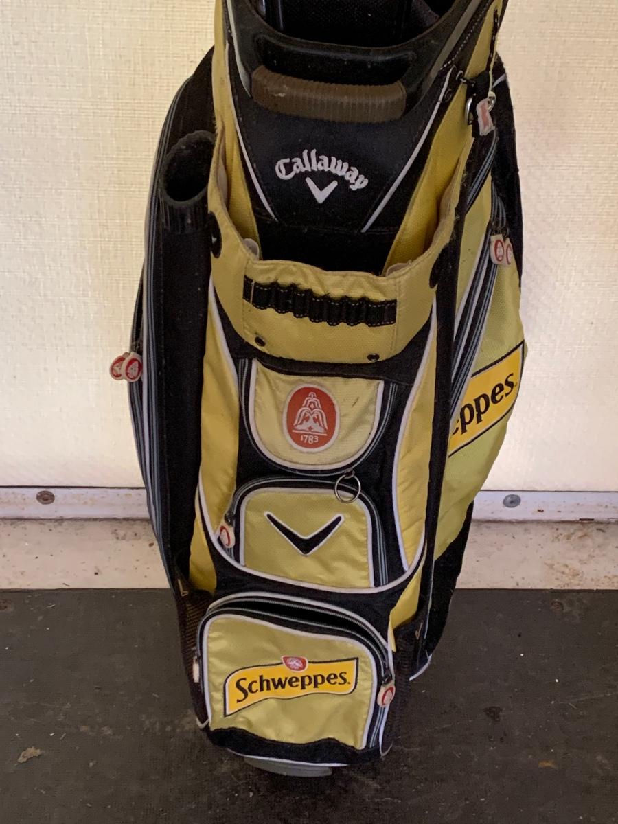 Includes a Callaway Schweppes bag, a tan vintage bag, and a black bin filled with clubs.