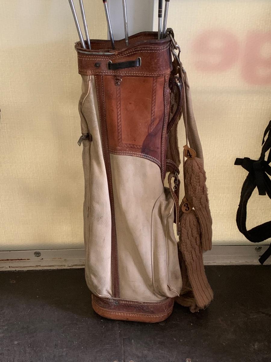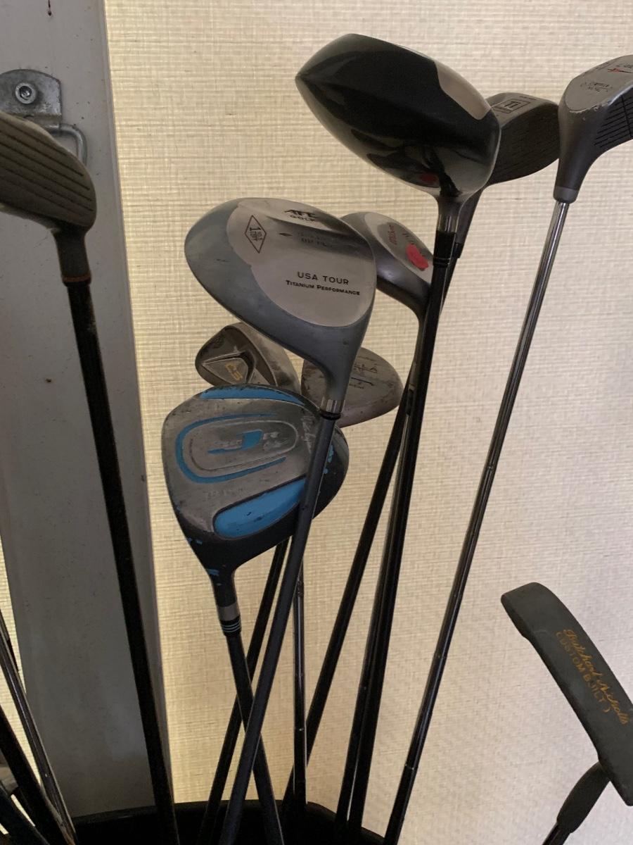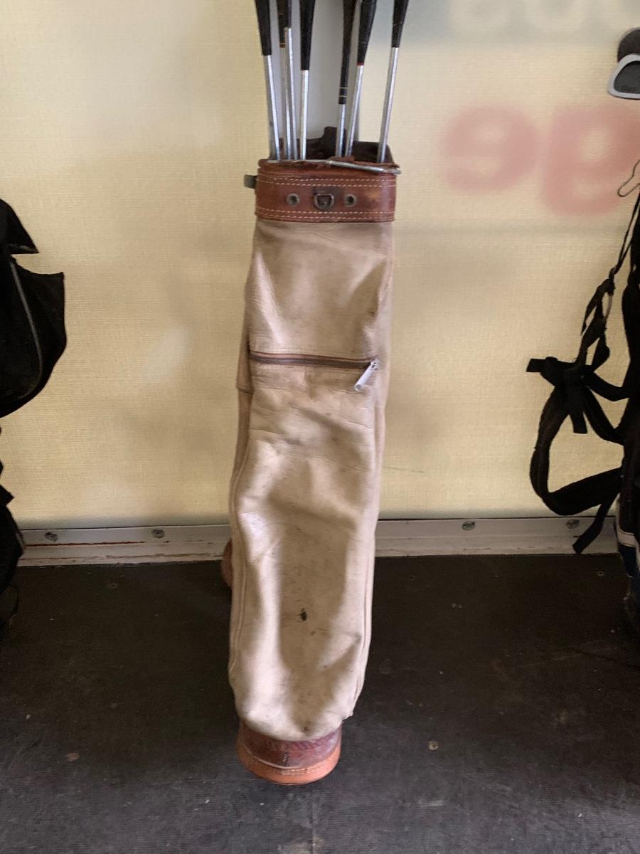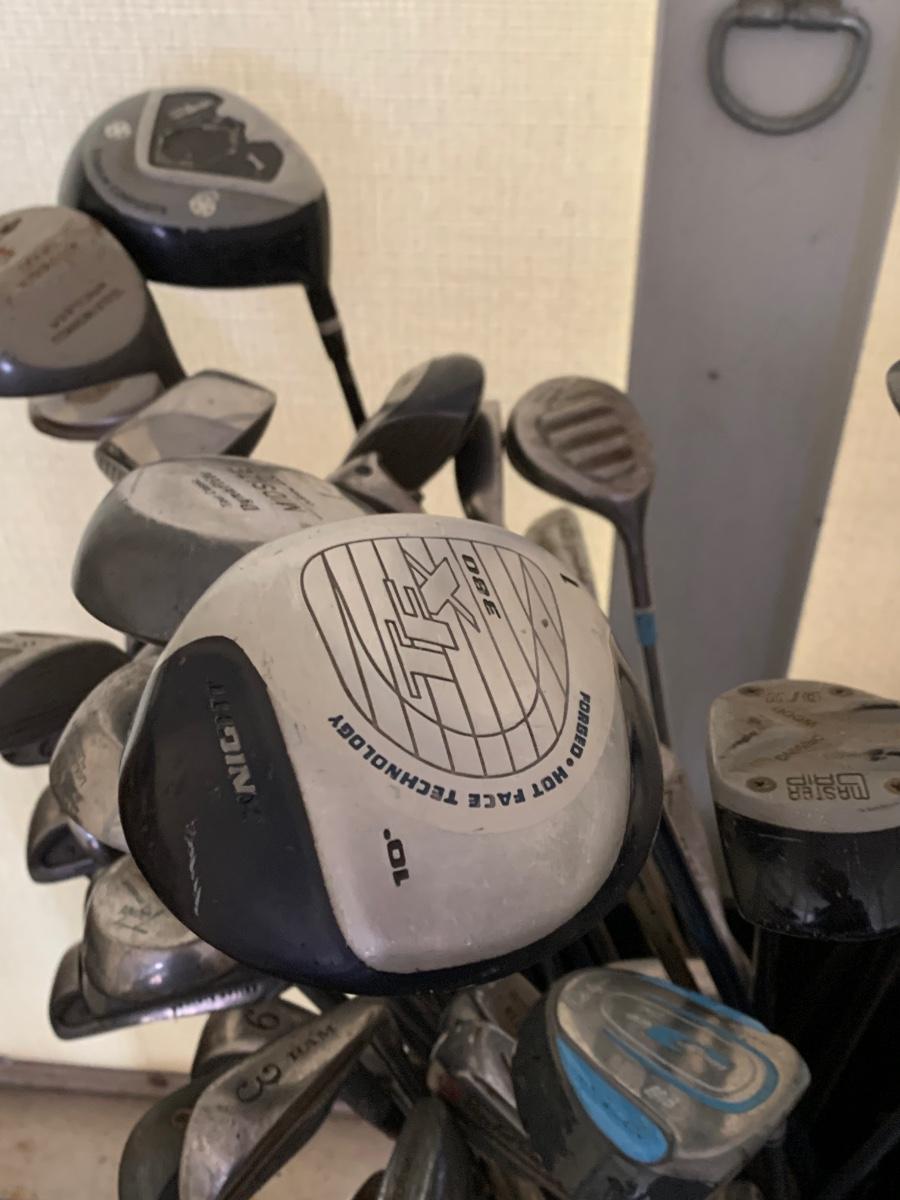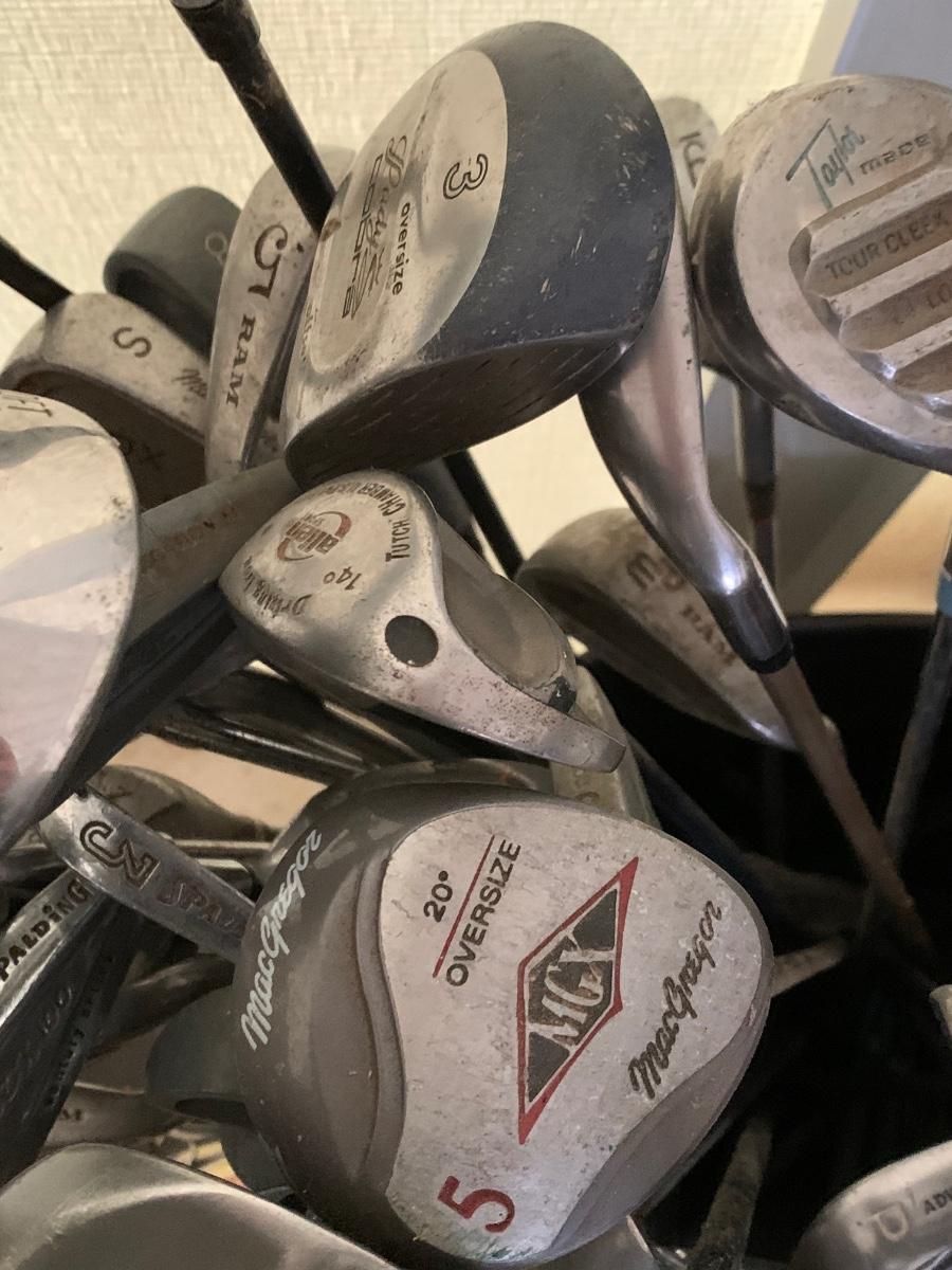 Includes a Callaway Schweppes bag, a tan vintage bag, and a black bin filled with clubs.