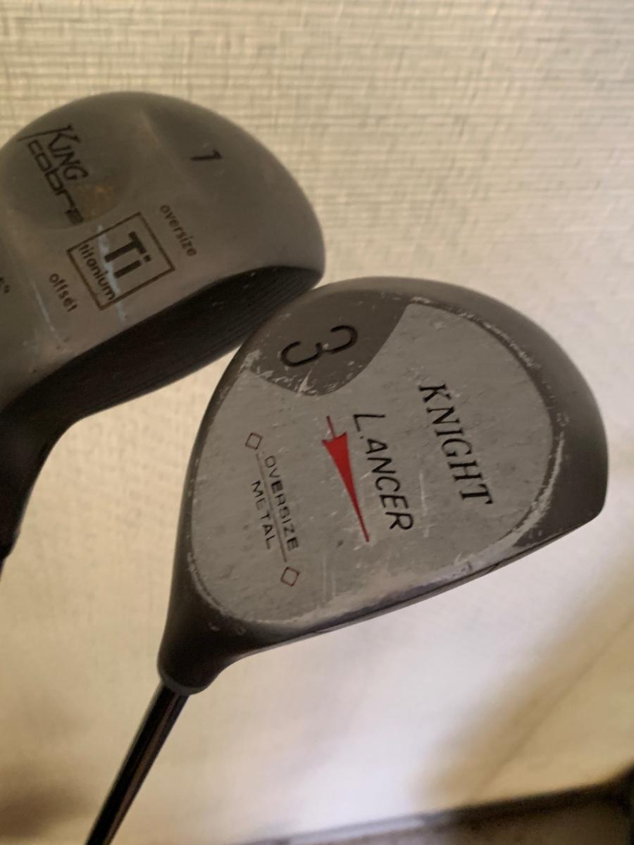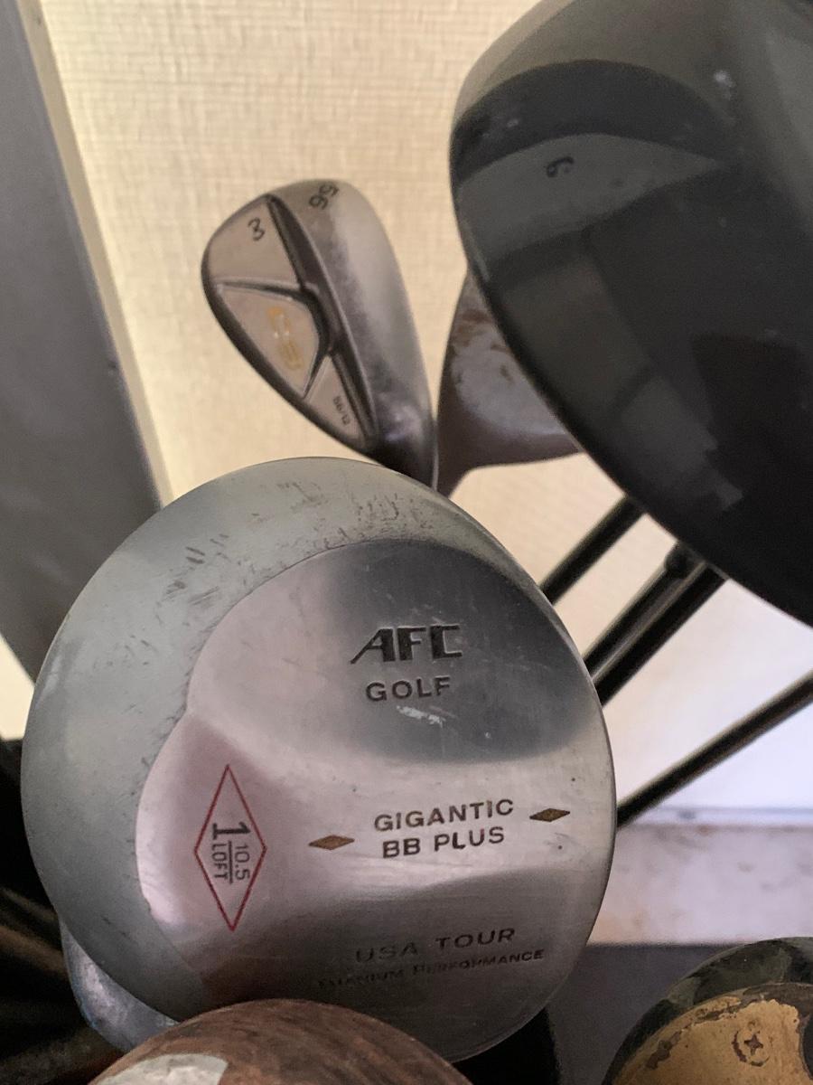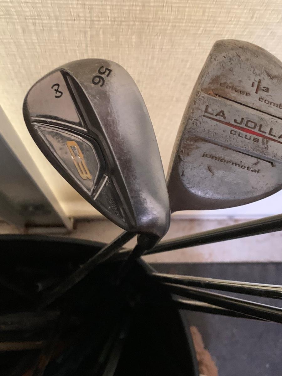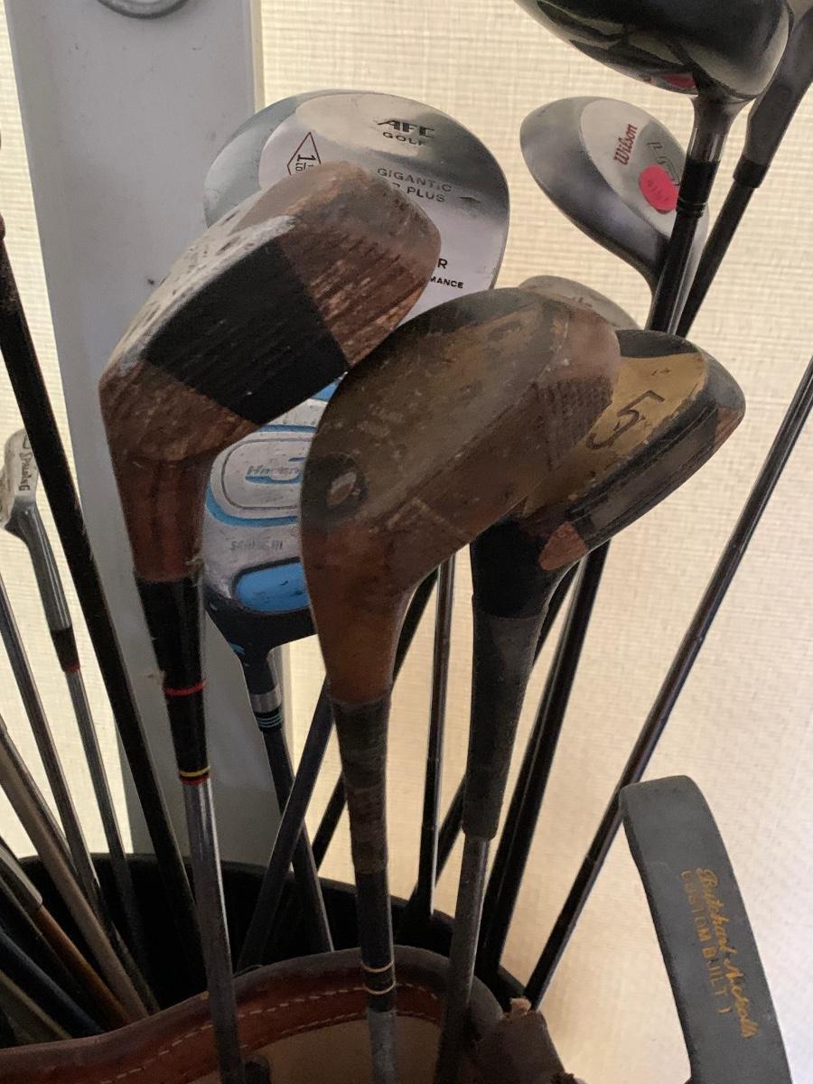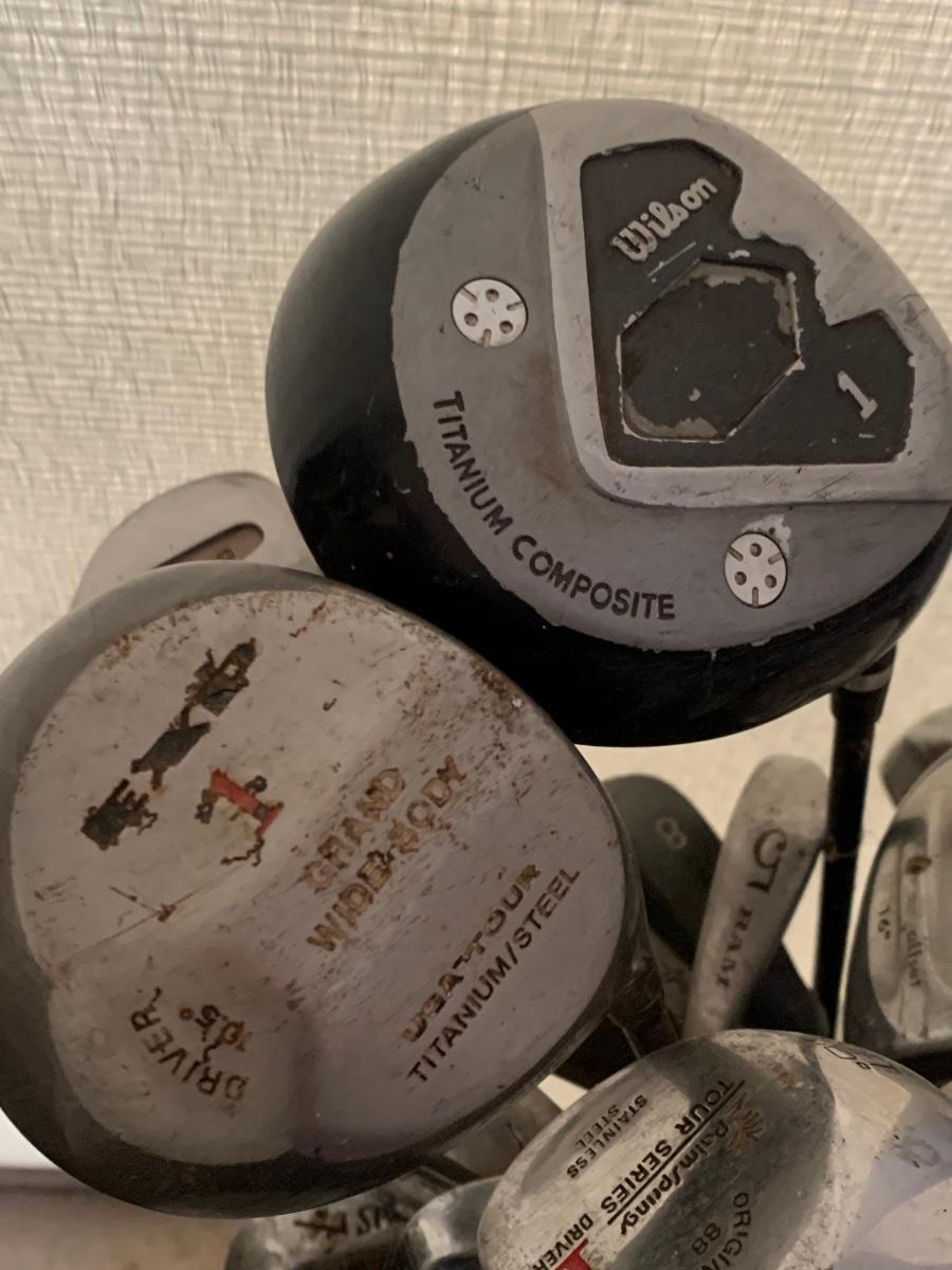 Includes a Callaway Schweppes bag, a tan vintage bag, and a black bin filled with clubs.