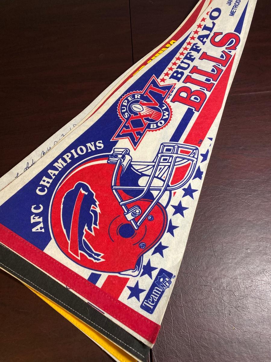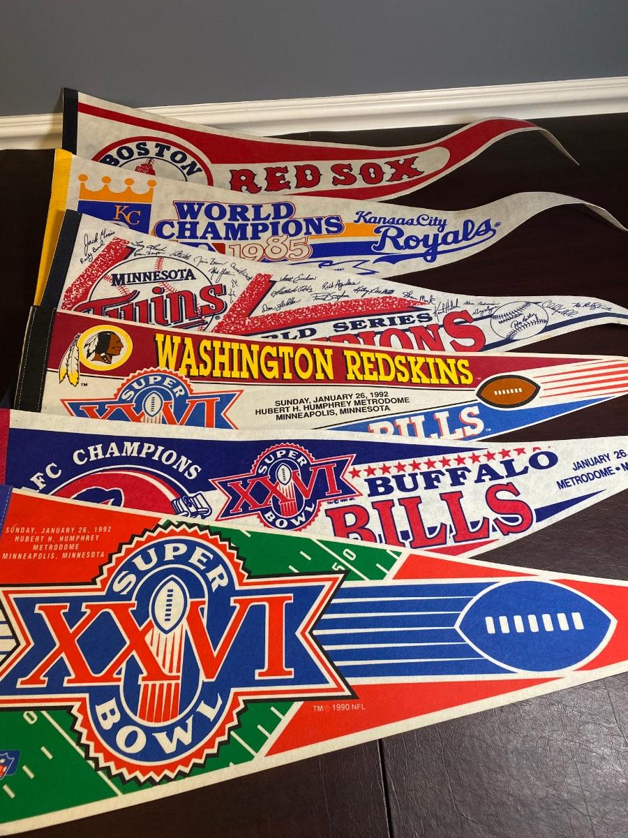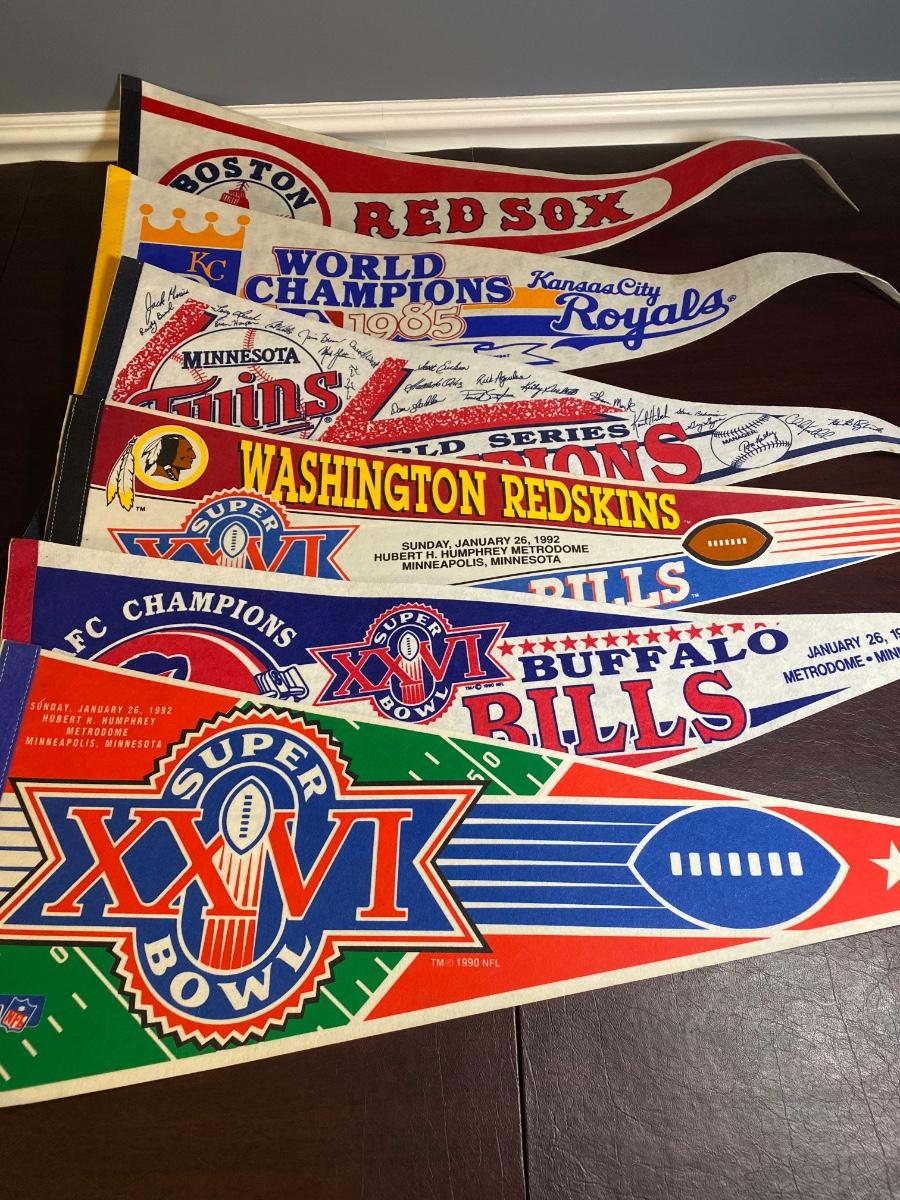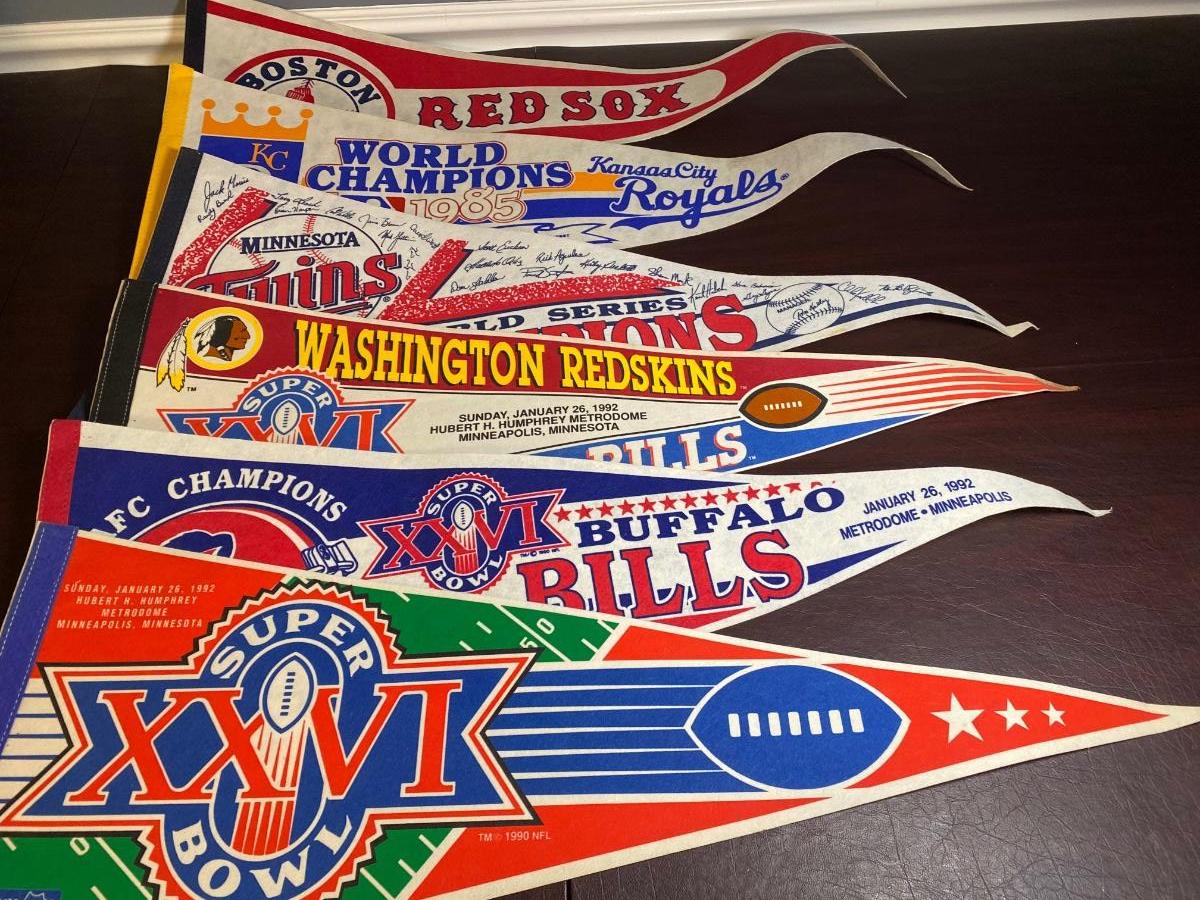 Includes pennants from the Boston Red Sox, World Series 1985 Champions Kansas City Royals, World Series 1991 Champions Minnesota Twins, Super Bowl XXXI Redskins vs. Bills, NFC Champions Super Bowl XXVI Buffalo Bills, and a generic Super Bowl XXVI pennant.