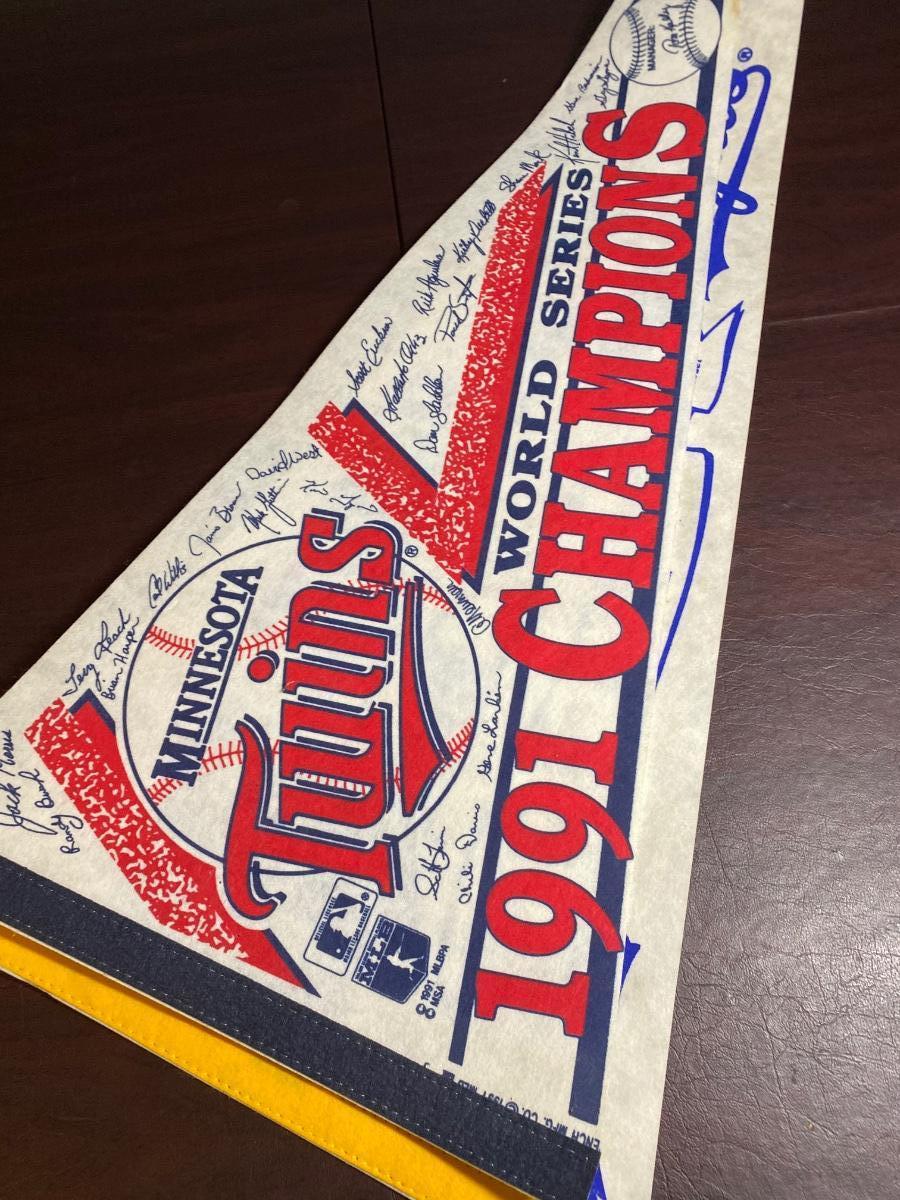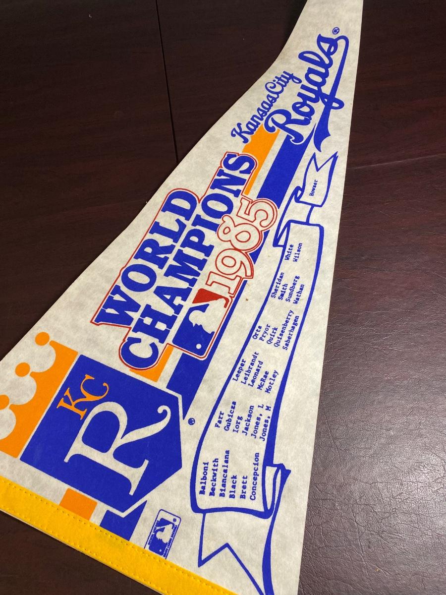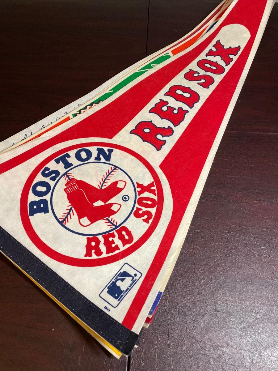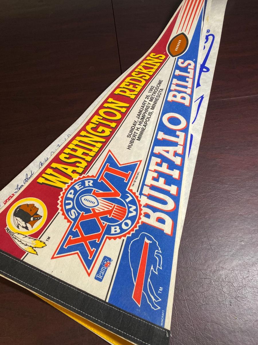 Includes pennants from the Boston Red Sox, World Series 1985 Champions Kansas City Royals, World Series 1991 Champions Minnesota Twins, Super Bowl XXXI Redskins vs. Bills, NFC Champions Super Bowl XXVI Buffalo Bills, and a generic Super Bowl XXVI pennant.