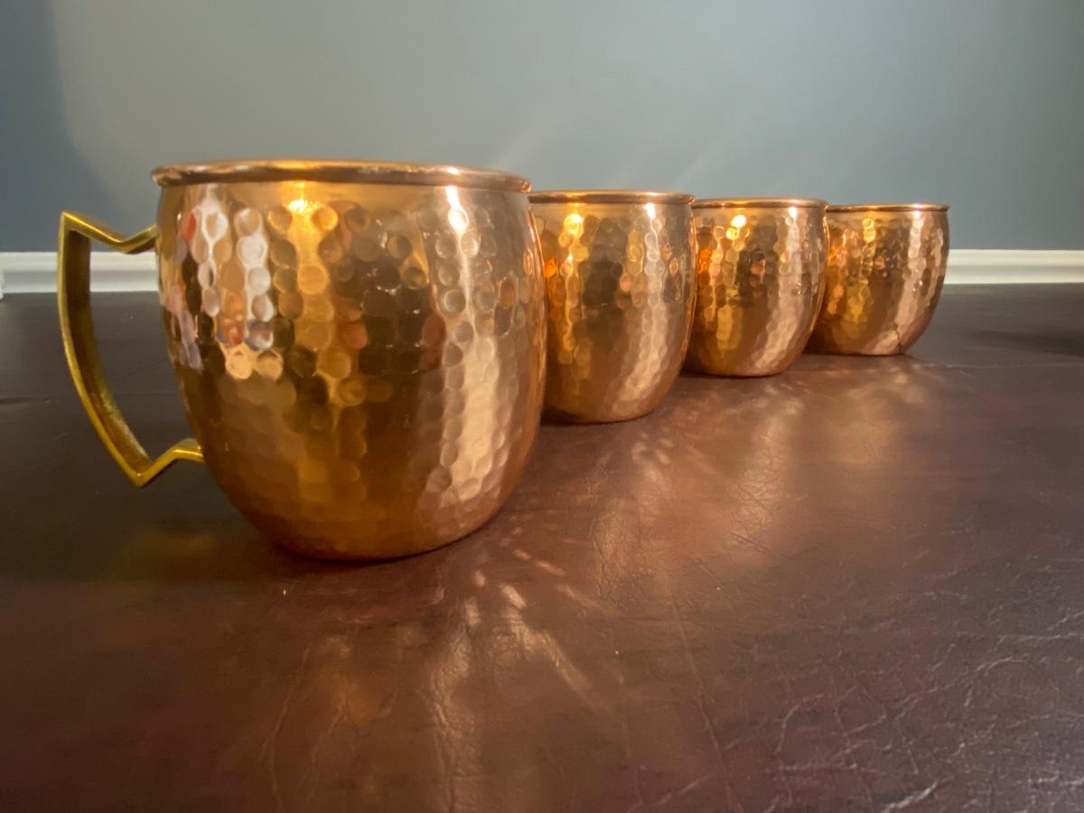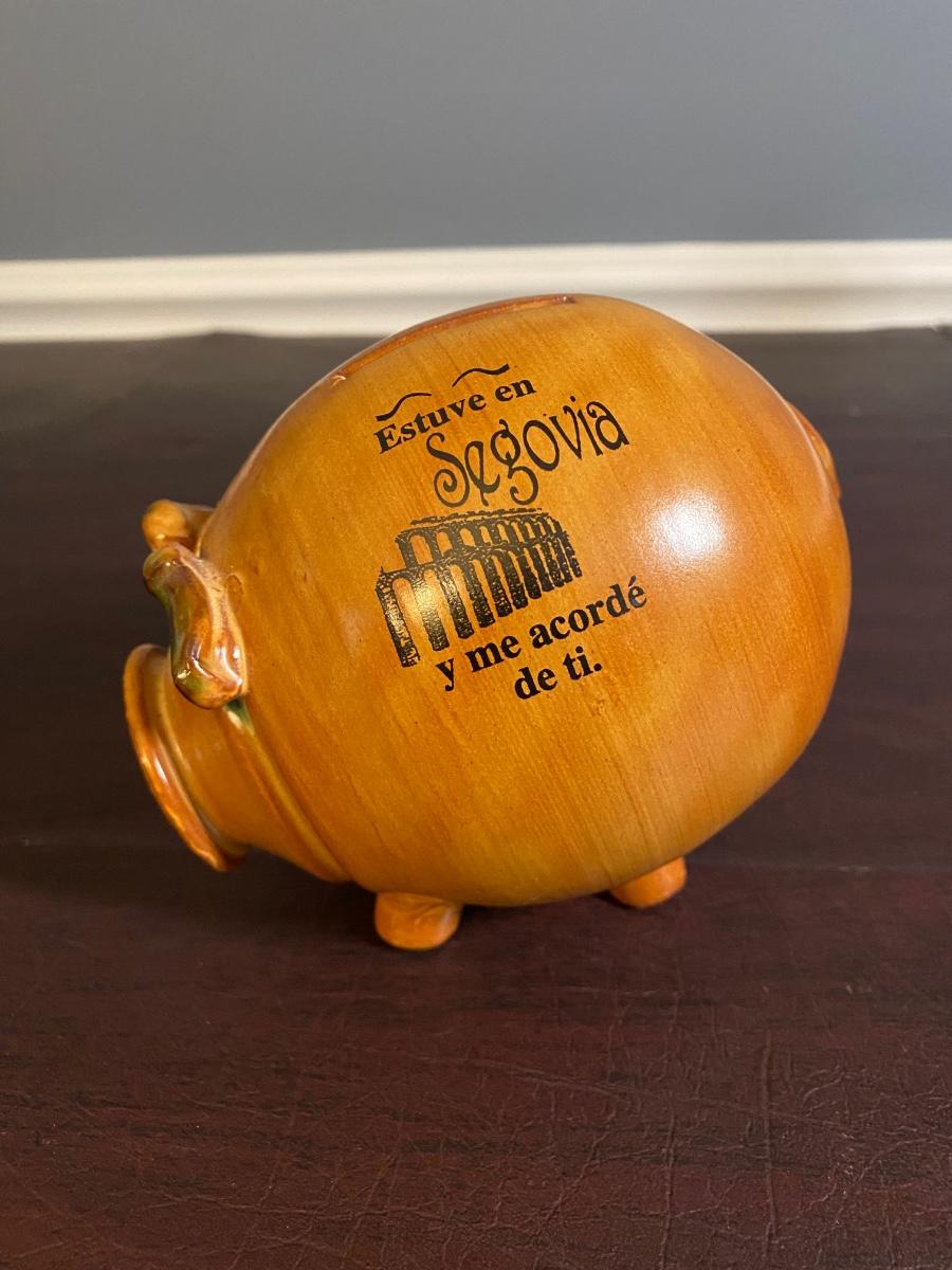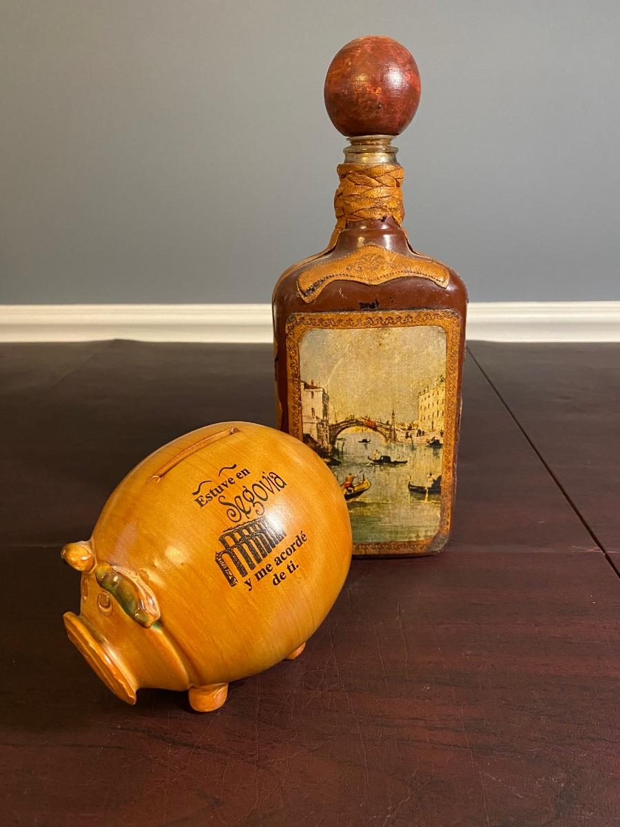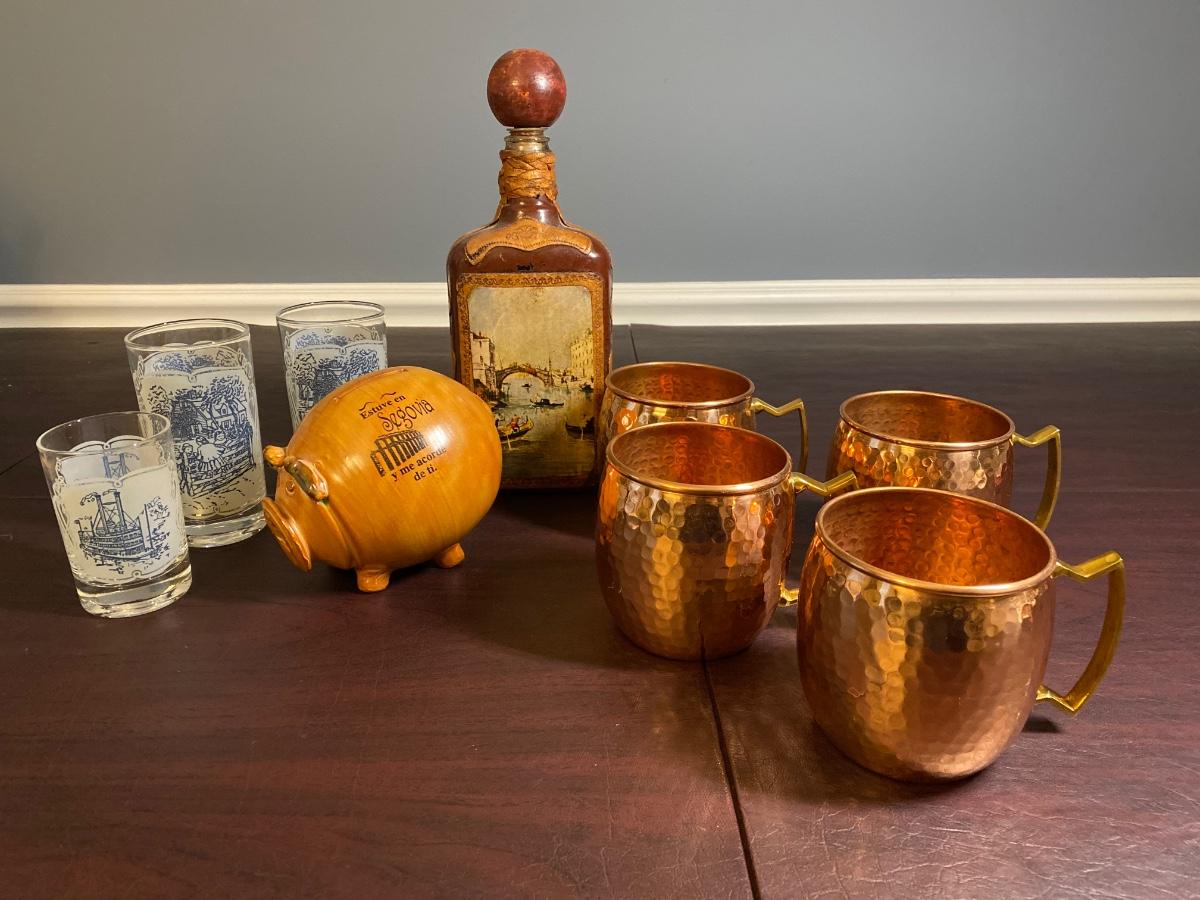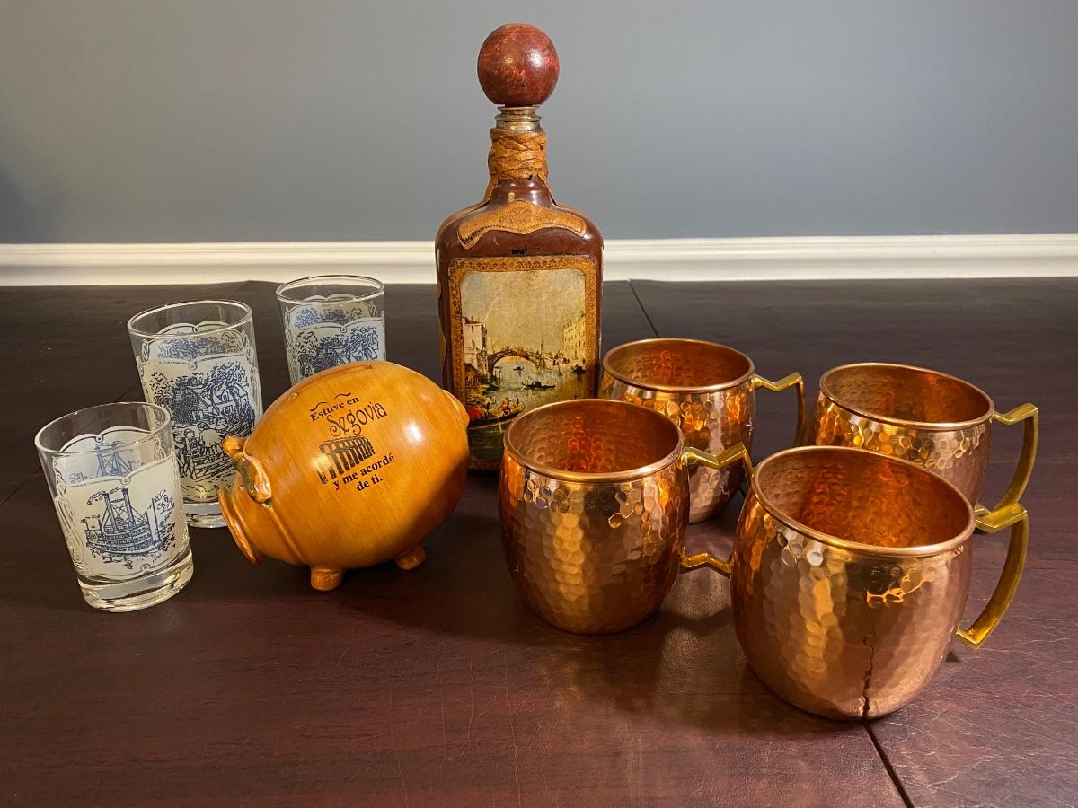 Includes four mule mugs, a wooden piggy bank from Segovia, Spain, three matching glasses, and a decanter bottle with intricate decoration.