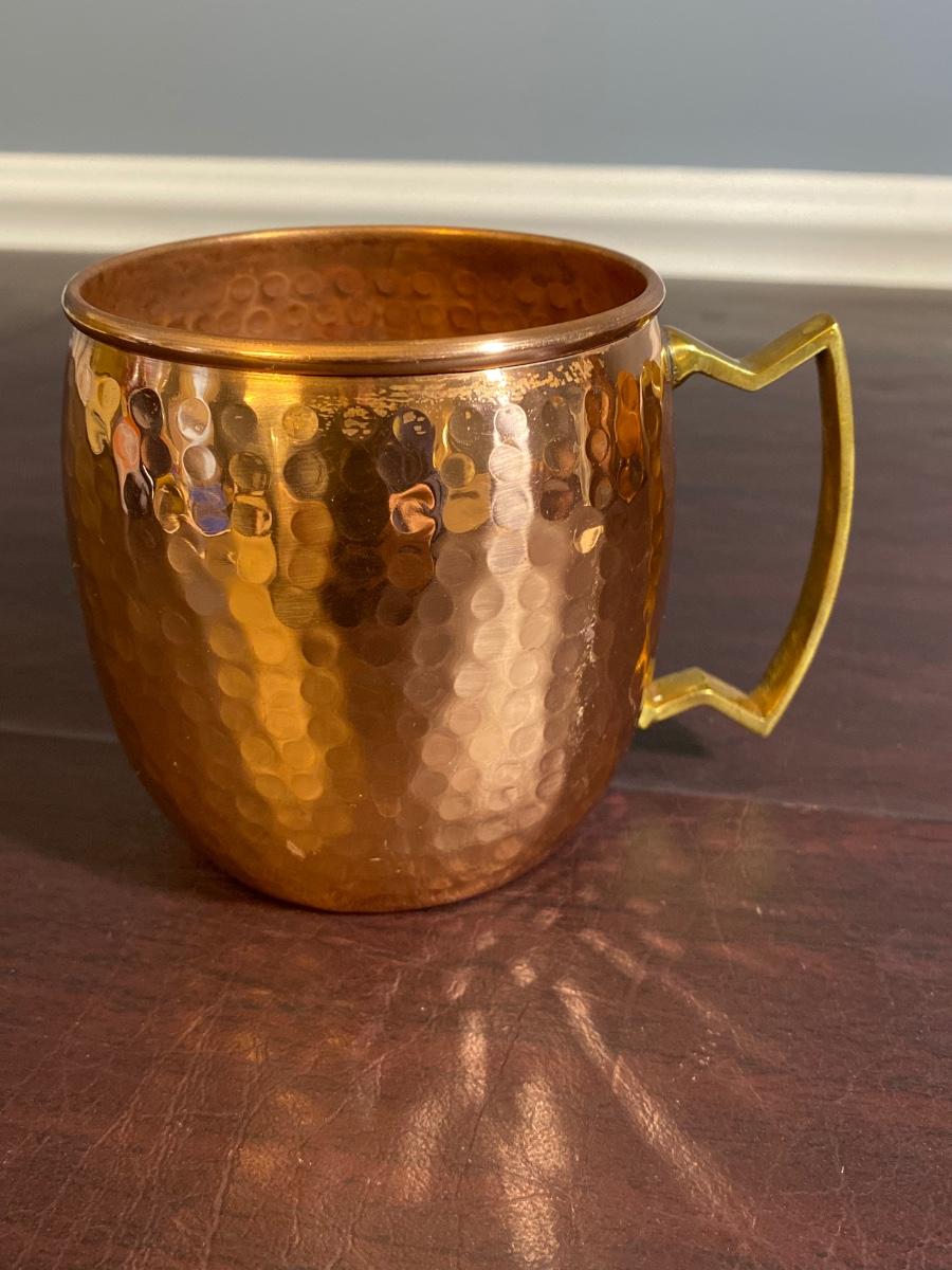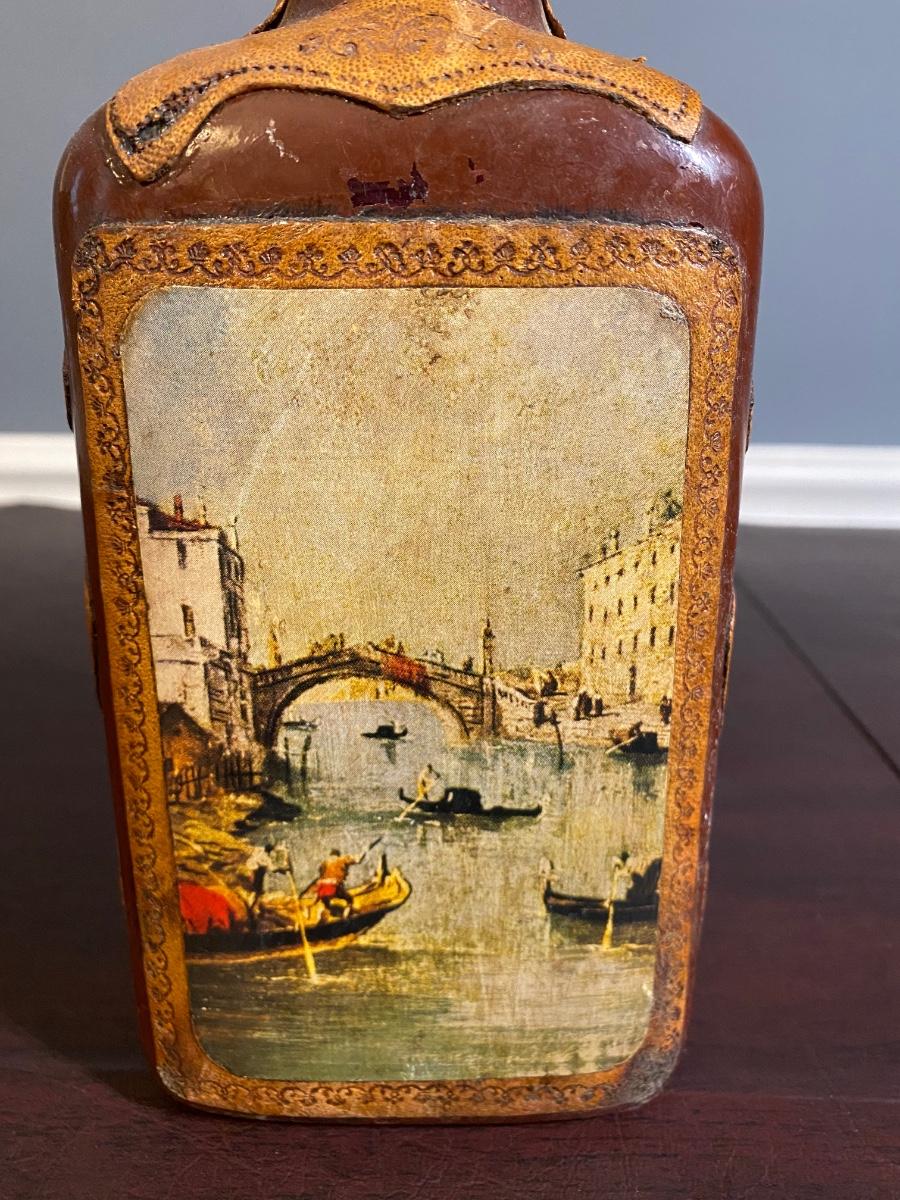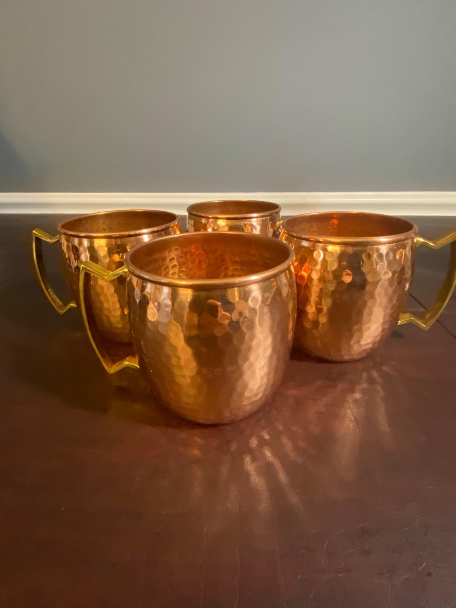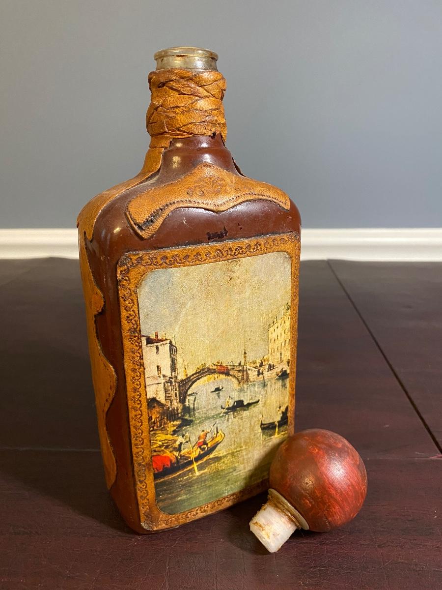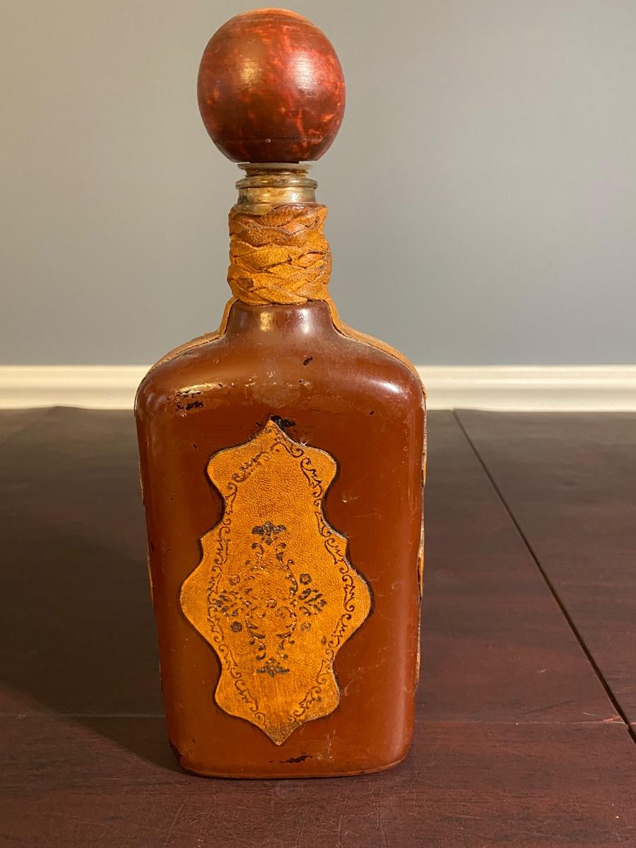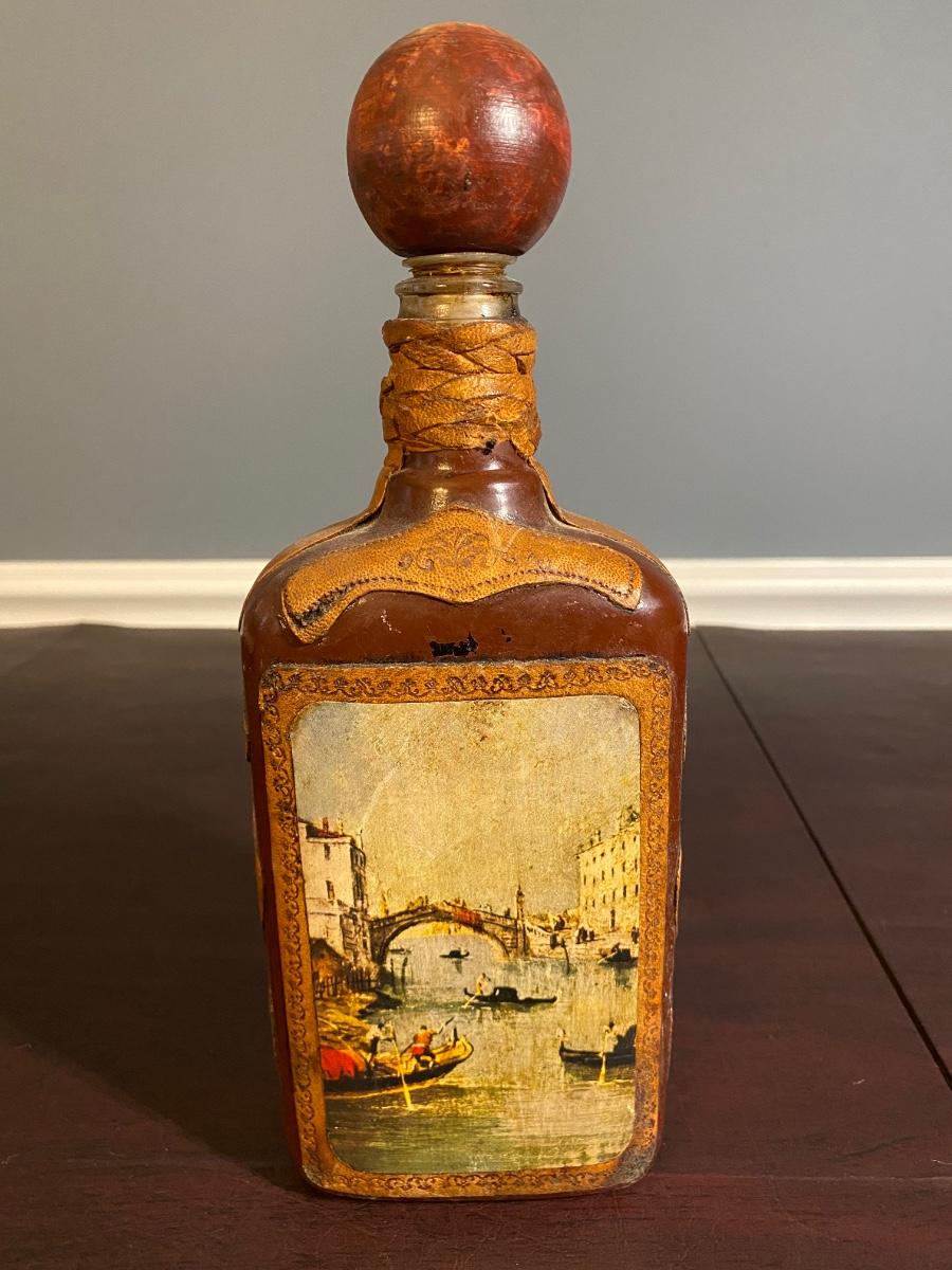 Includes four mule mugs, a wooden piggy bank from Segovia, Spain, three matching glasses, and a decanter bottle with intricate decoration.