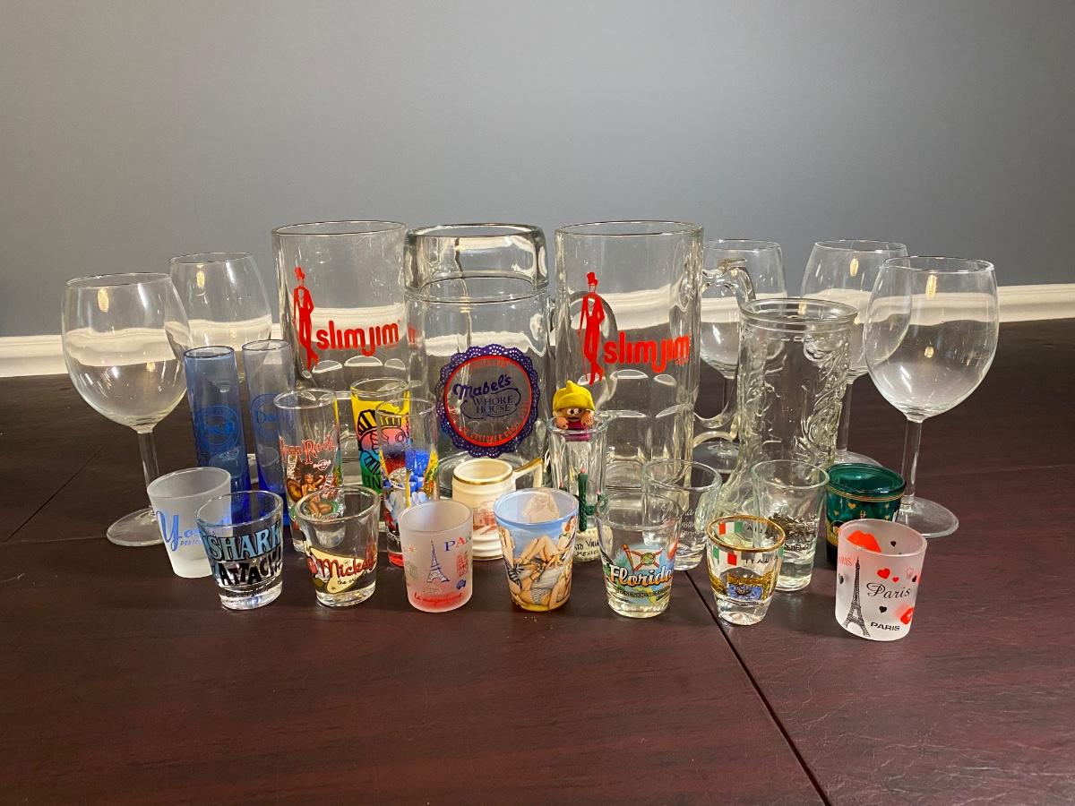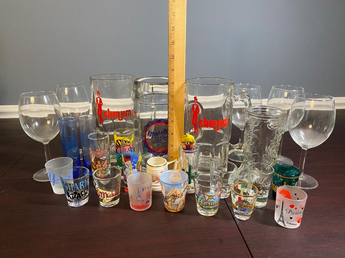 Includes two large Slim Jim branded glasses with handles. Also includes a variety of souvenir shot glasses, five wine glasses, and a glass shaped like a boot. Please see all pictures as they are the best representation of the items. The pictures show condition, measurements if taken, and what is included in the lot. Due to the large amount that we photograph and the time frame, we are not always able to take measurements. All items unless noted, are pre-owned and have been used. If you purchased furniture, you must bring help. We do not allow one person to carry large furniture out on their own. Bring help, tools and a truck for the safety of our client’s homes, and your personal safety. Any damages that result to the property including walls, and floors due to moving of the furniture will be charged to the buyer. Company policy. Thank you.