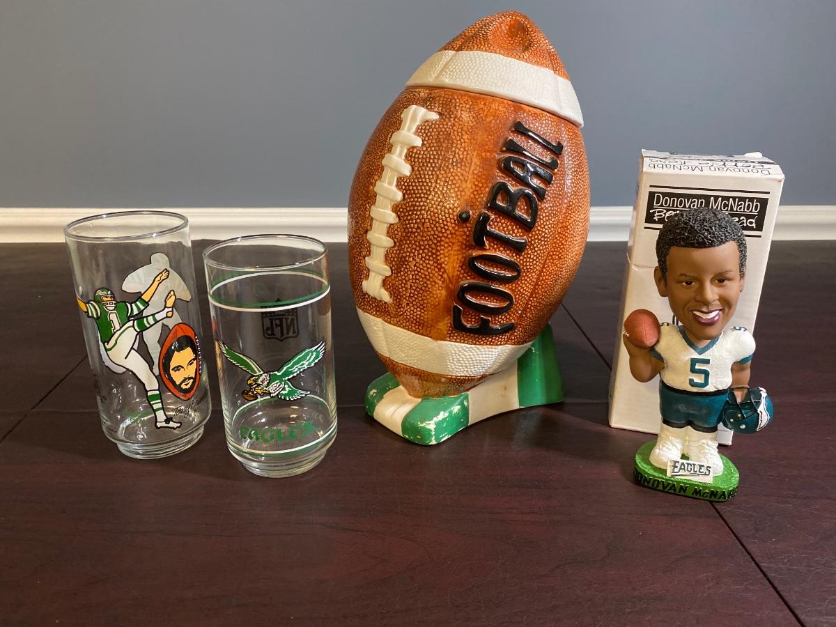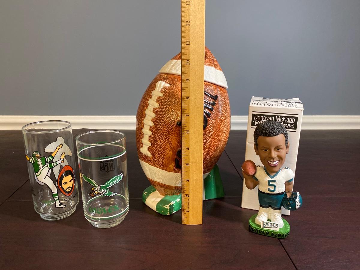 LOT81: 1980s Mcdonalds Eagles Glasses, Football Cookie Jar & Donovan McNabb Bobblehead
