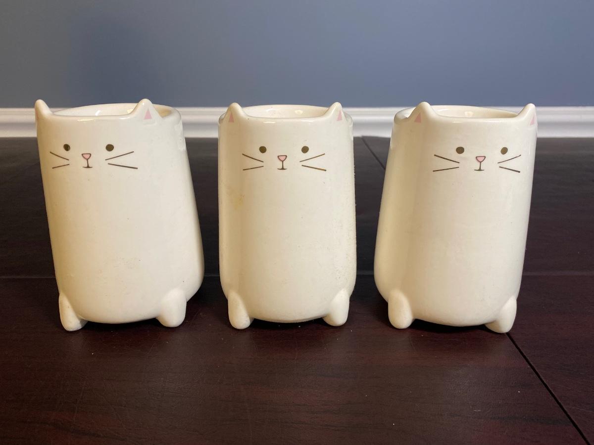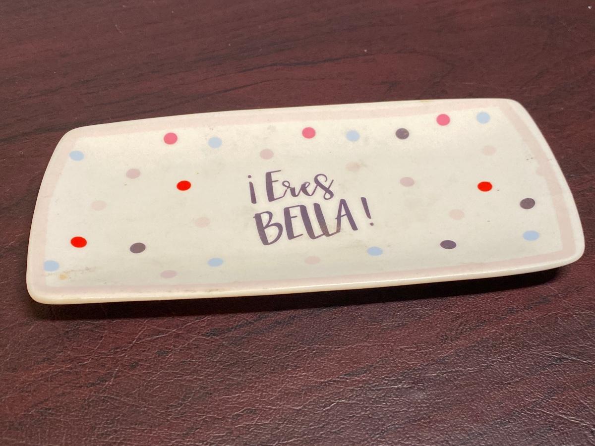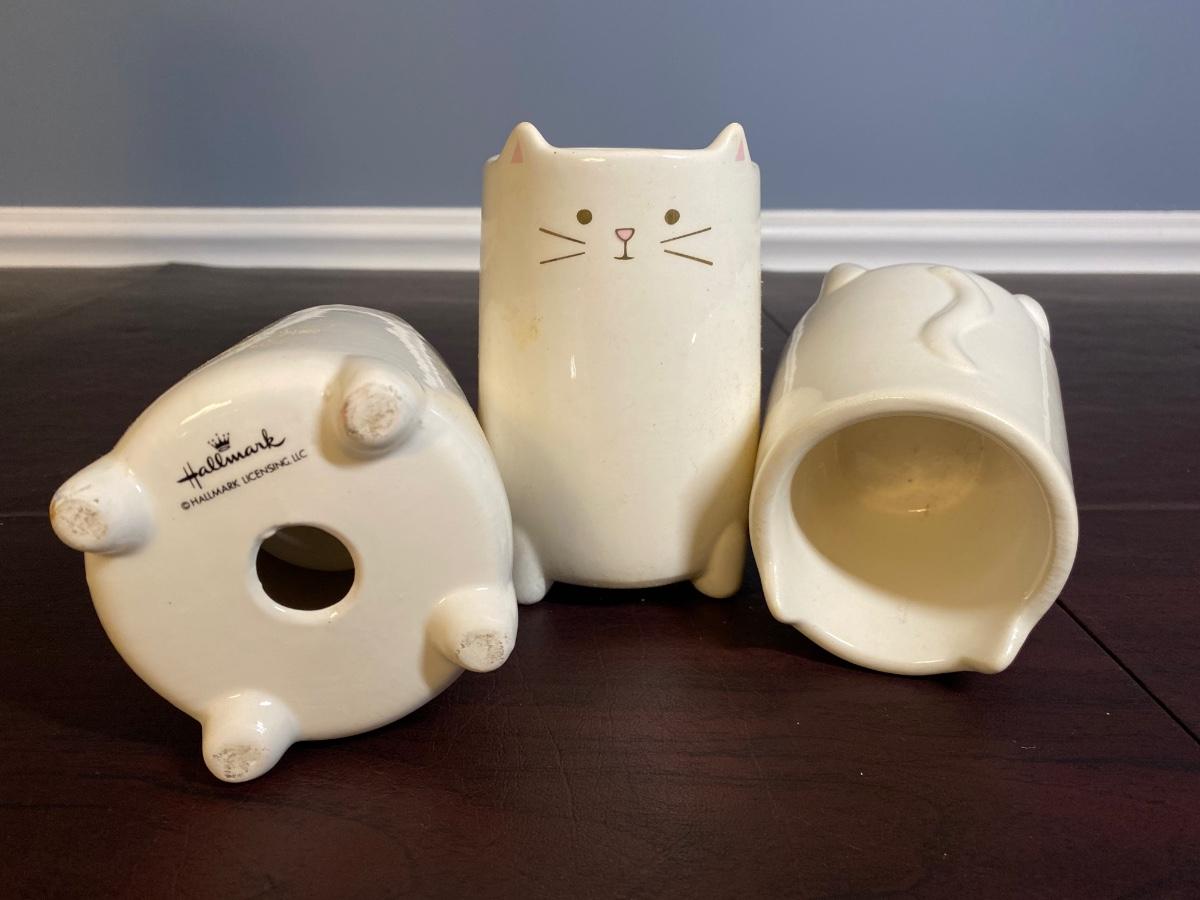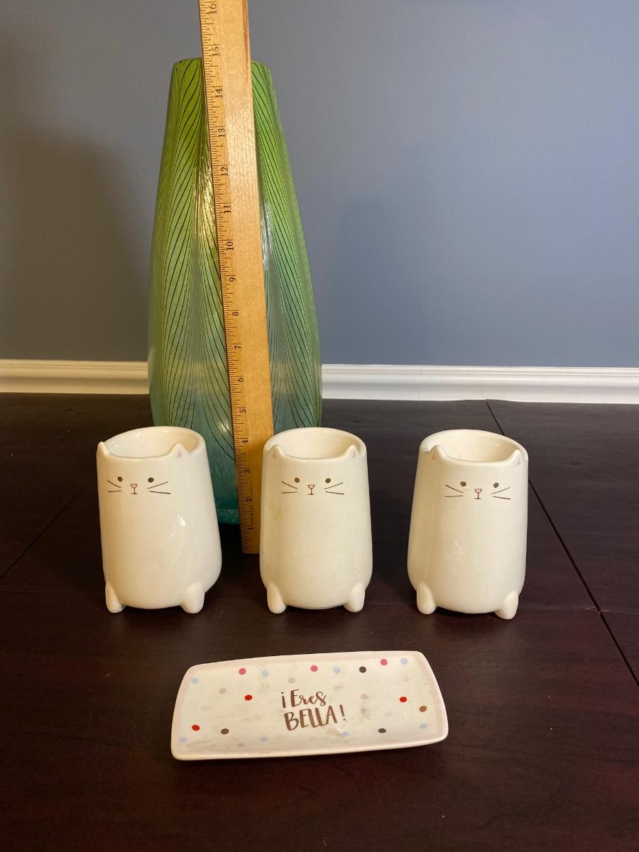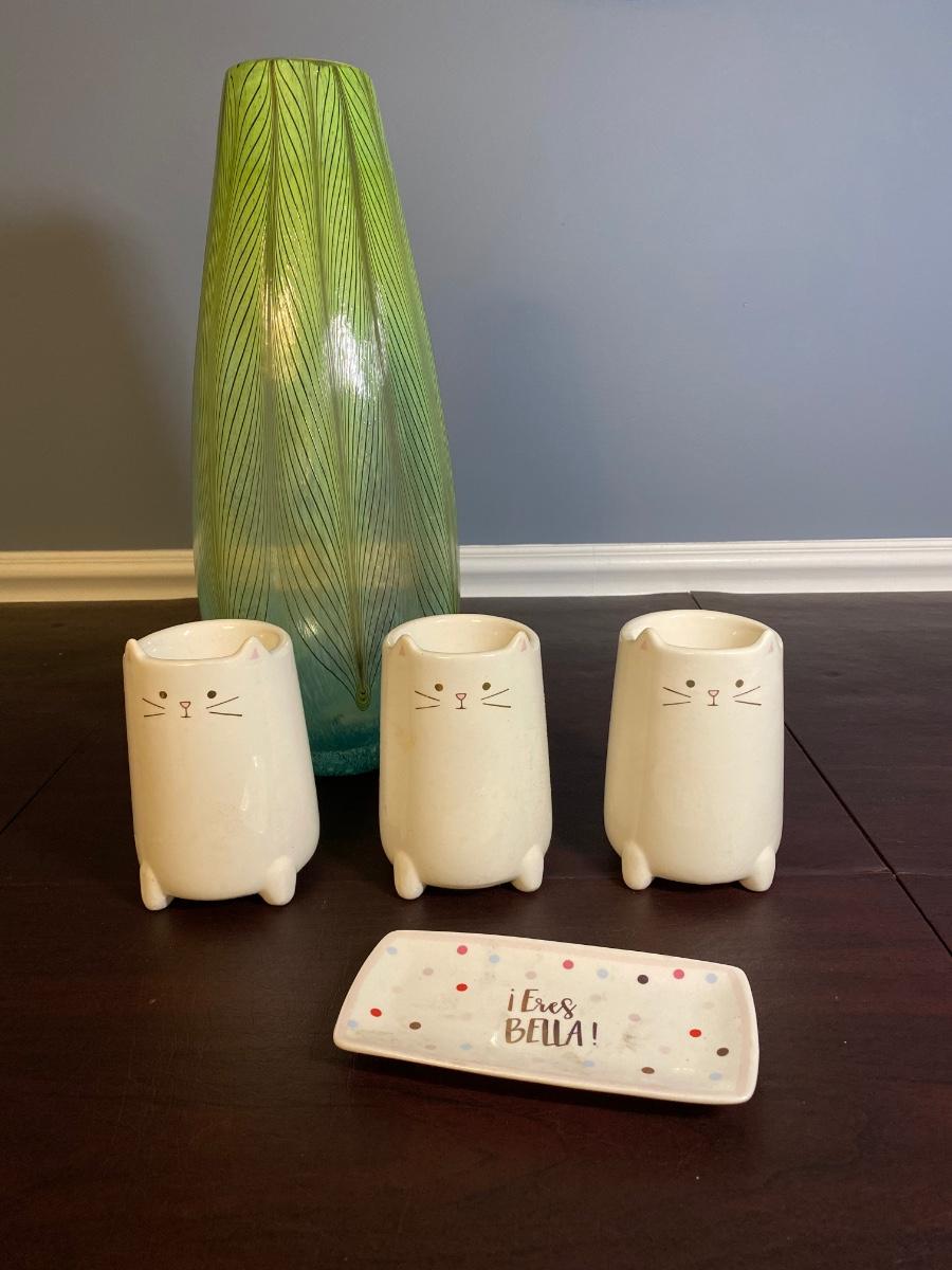 Includes 3 ceramic cats made by Hallmark, a green vase with leaf textures, and a trinket tray that says "eres bella" ("you're beautiful") on it.