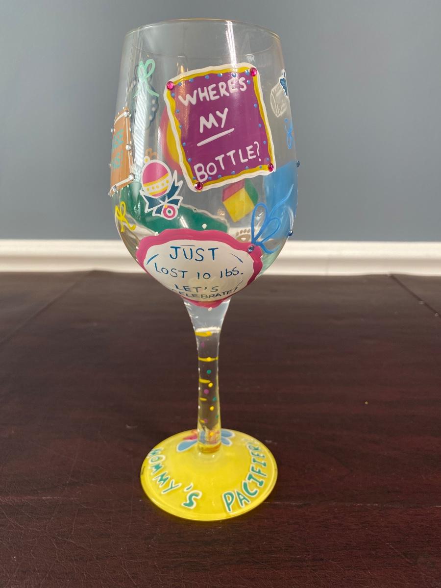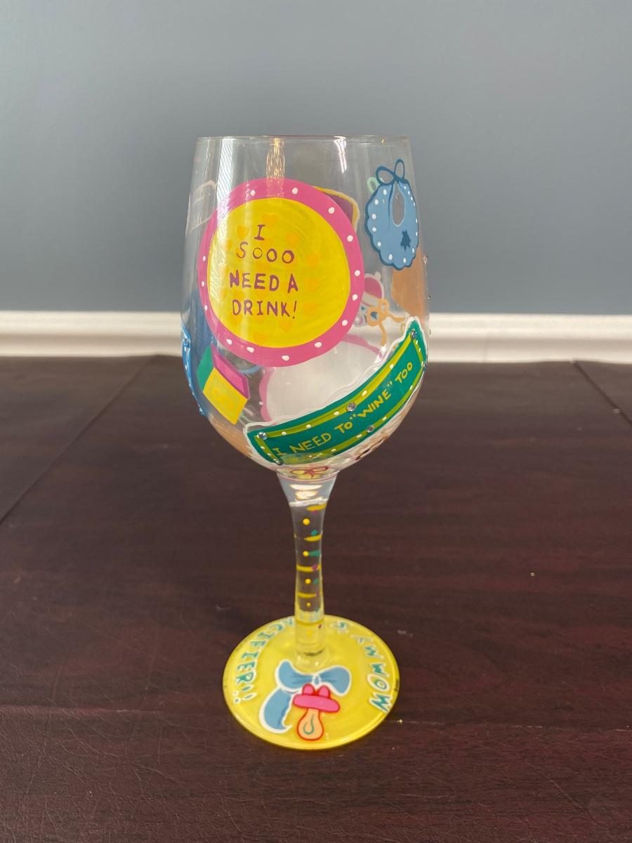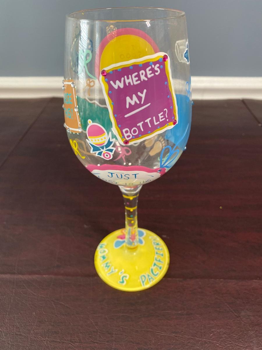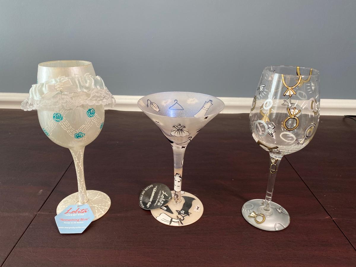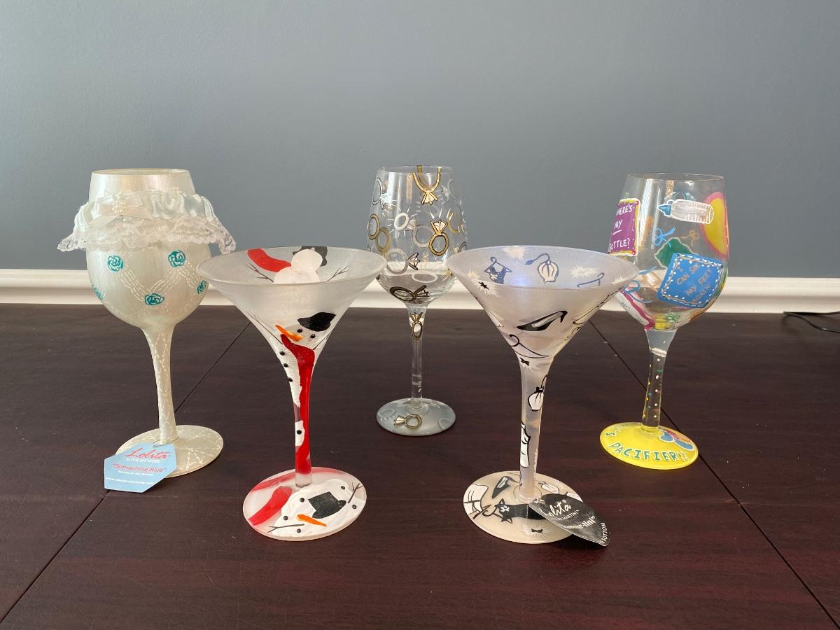 Includes two bridal wine glasses, a "Mommy's Pacifier" wine glass, and two painted martini glasses.