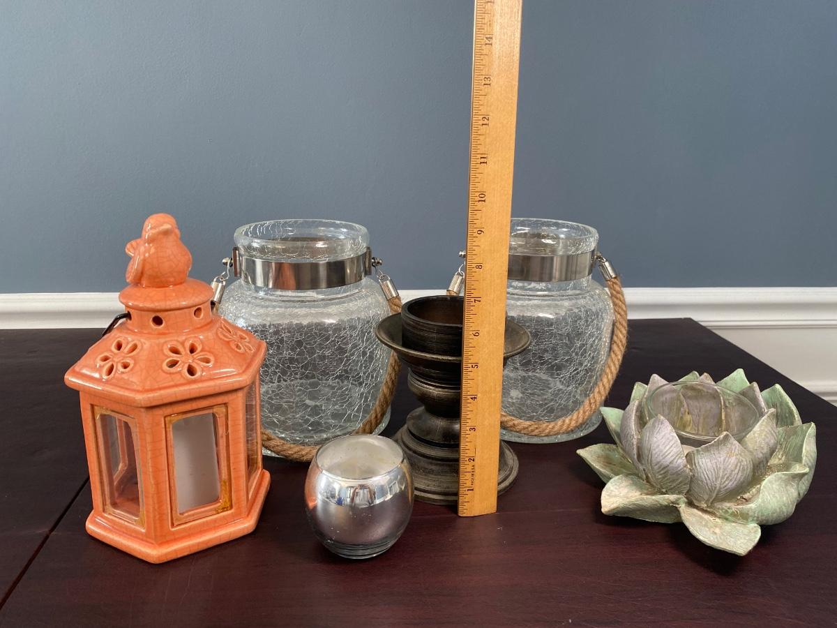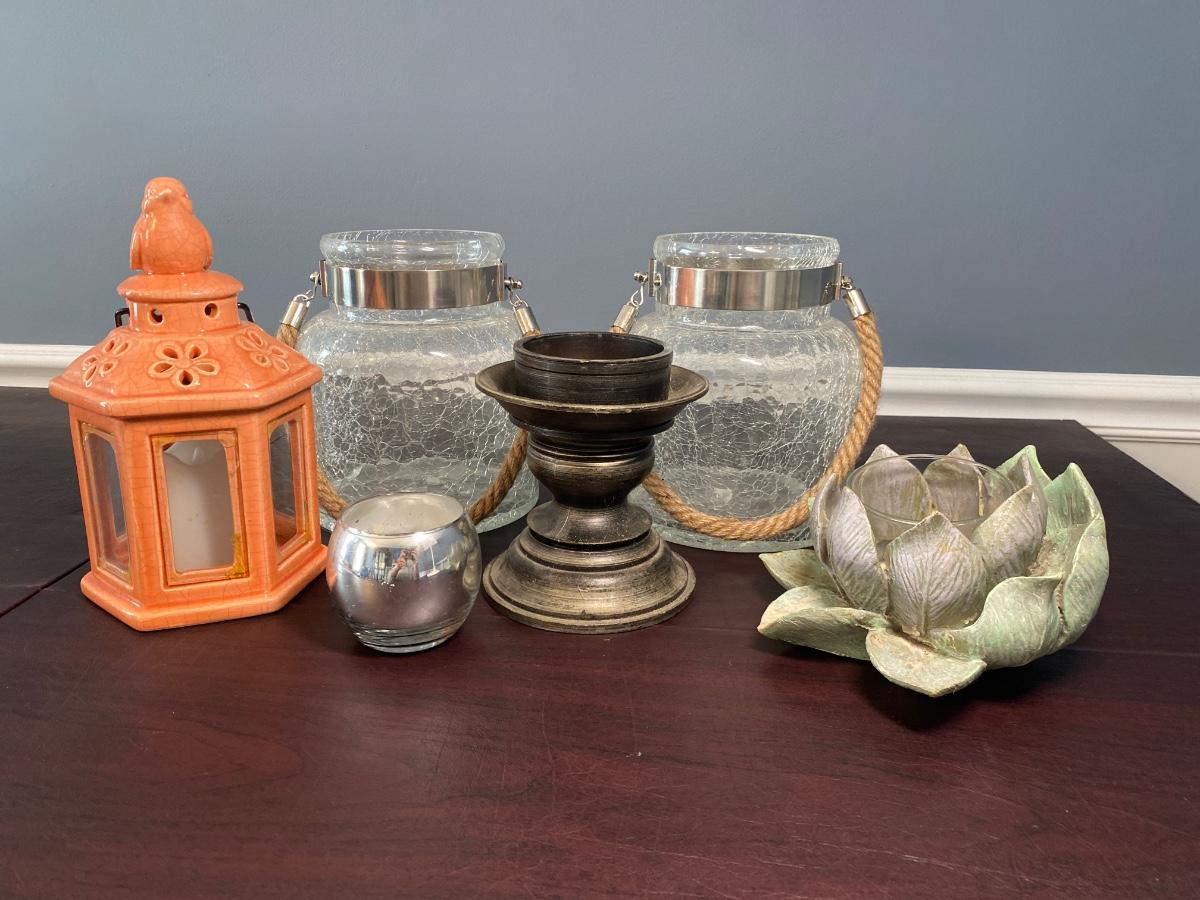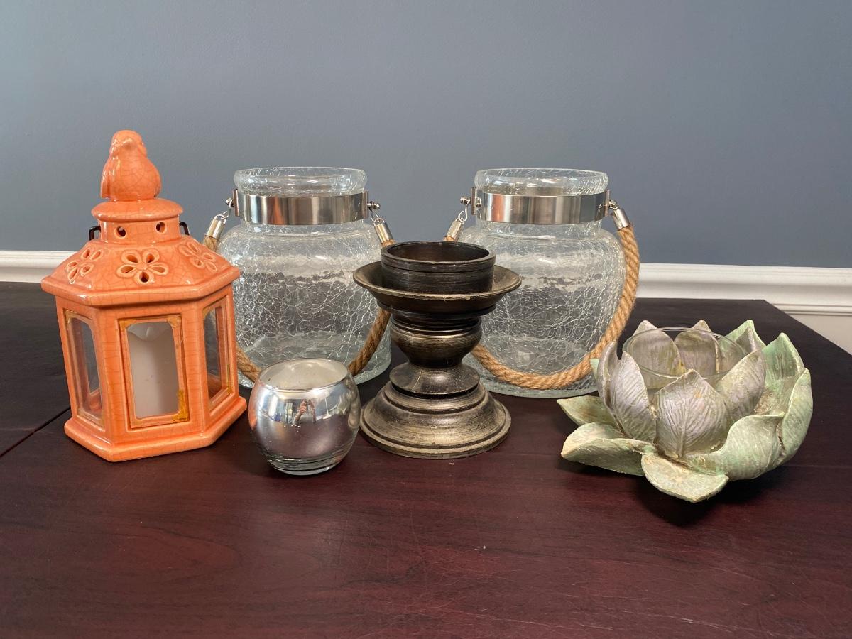 Includes a coral colored lantern with candle inside, two crackle texture jars with rope handles, a candle stand and a succulent shaped candle holder.