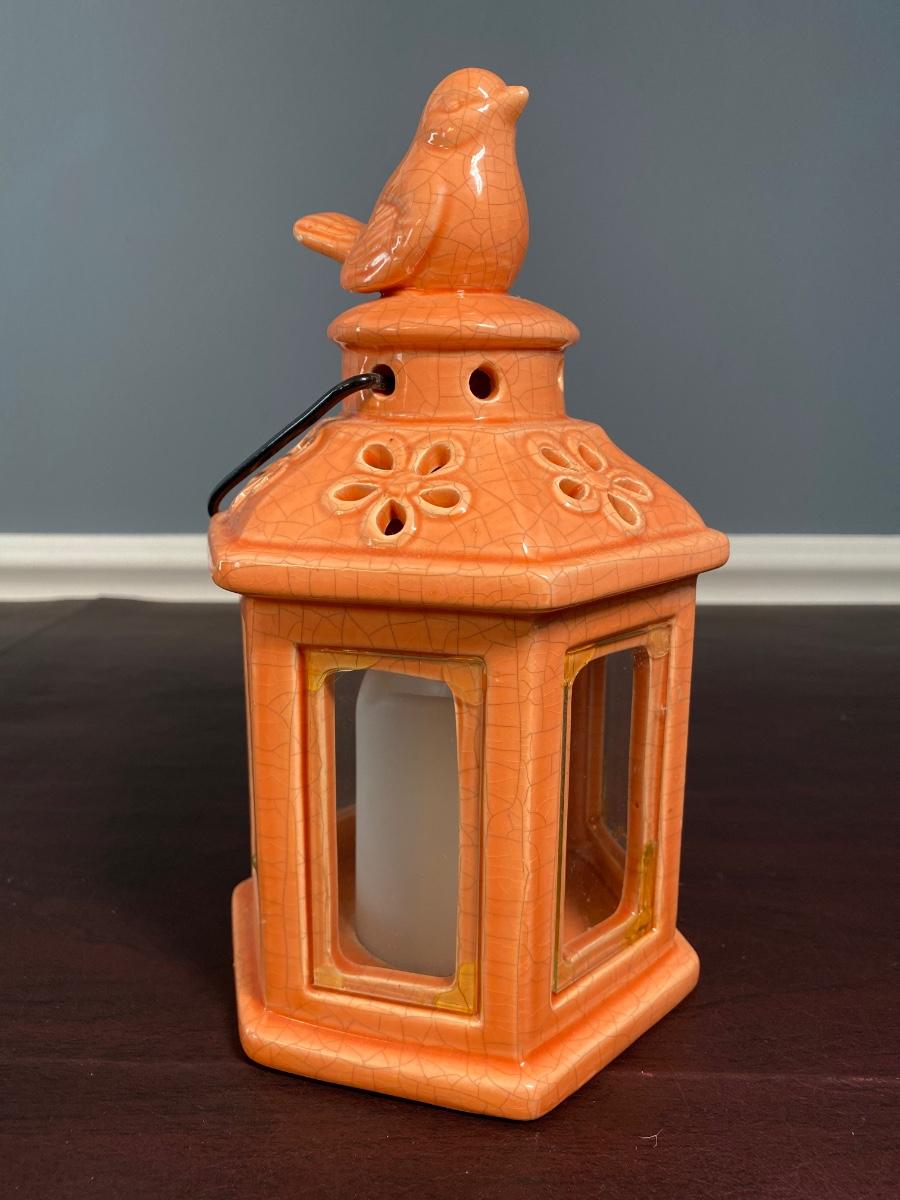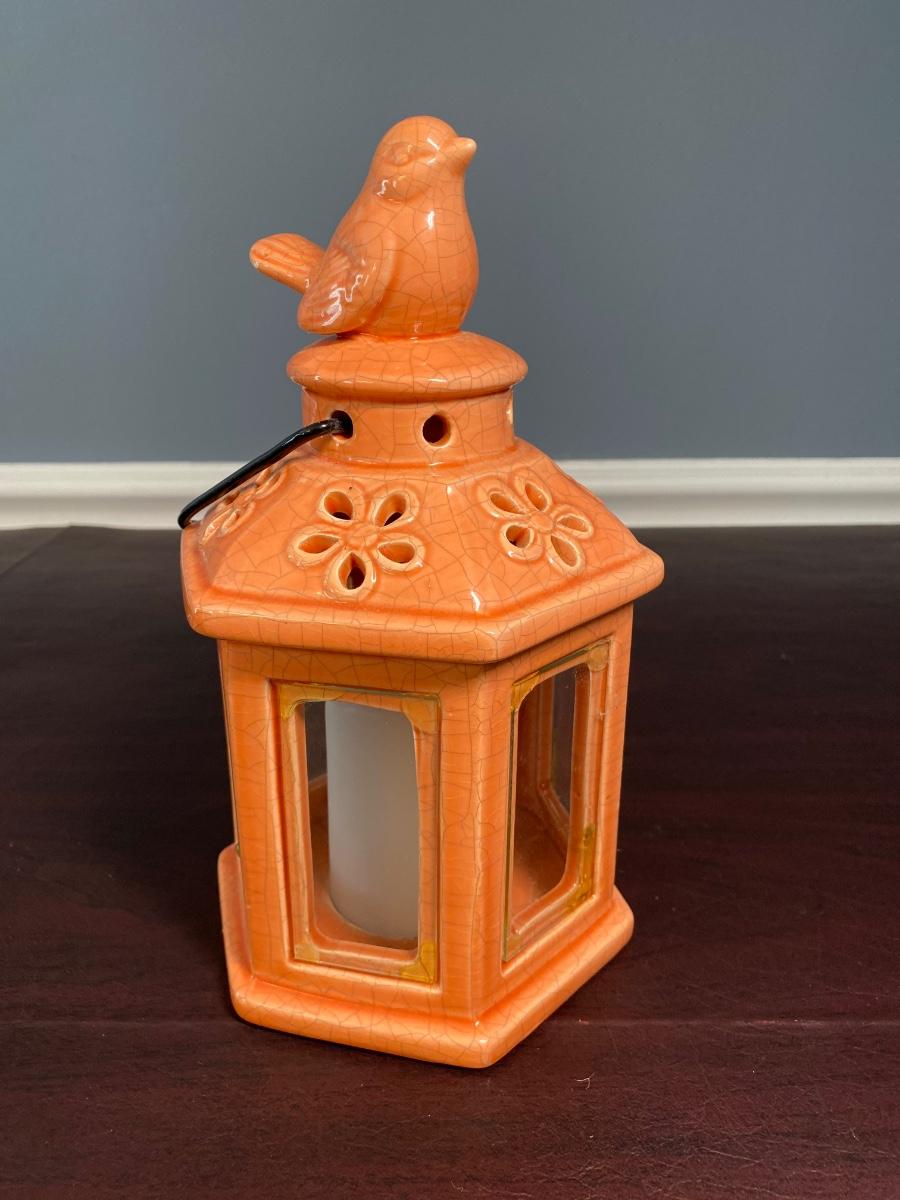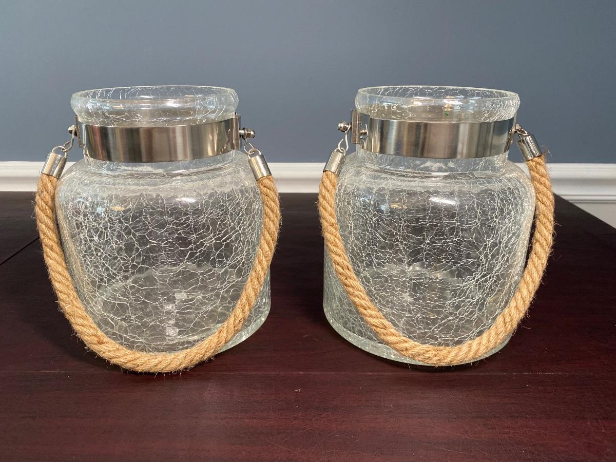 Includes a coral colored lantern with candle inside, two crackle texture jars with rope handles, a candle stand and a succulent shaped candle holder.