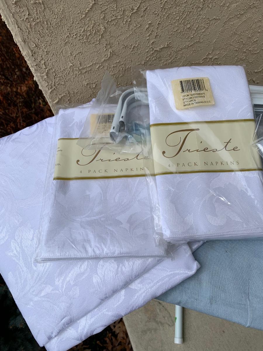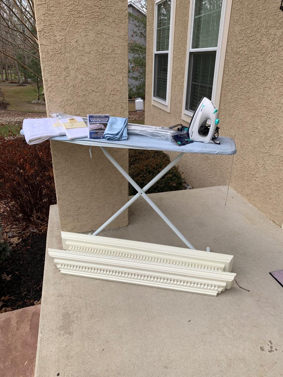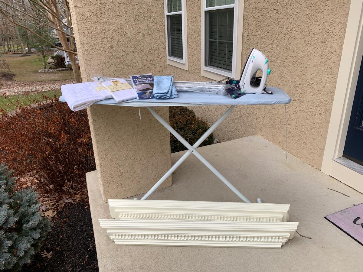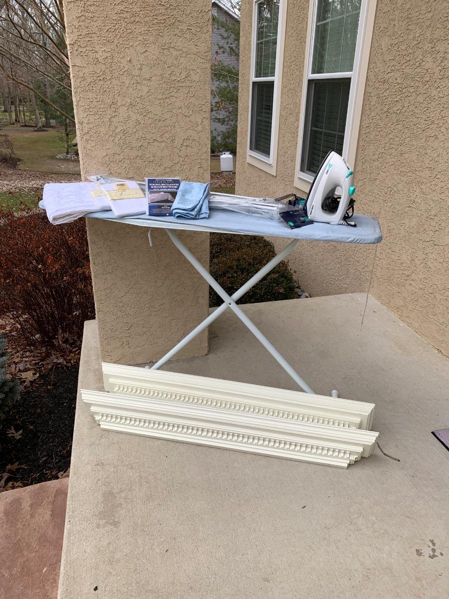 One ironing board with Black & Decker Iron, untested. Includes four Room Essentials white double curtain rods (28-48 inches), and two wall mounted shelves measuring 5 x 47 inches. Includes a variety of kitchen linens & a clear tablecloth protector with sewn edges.