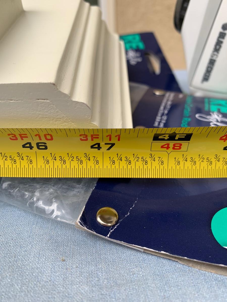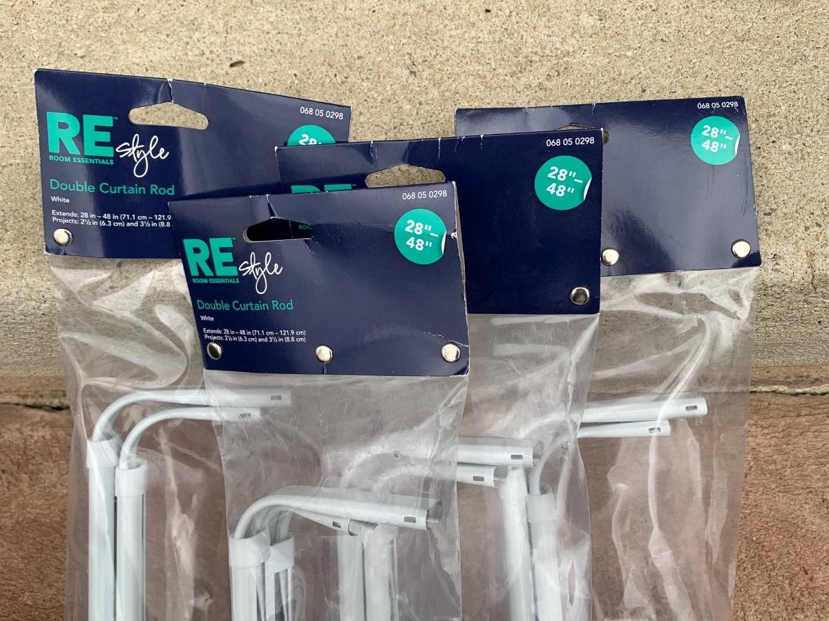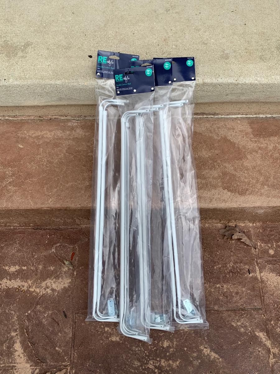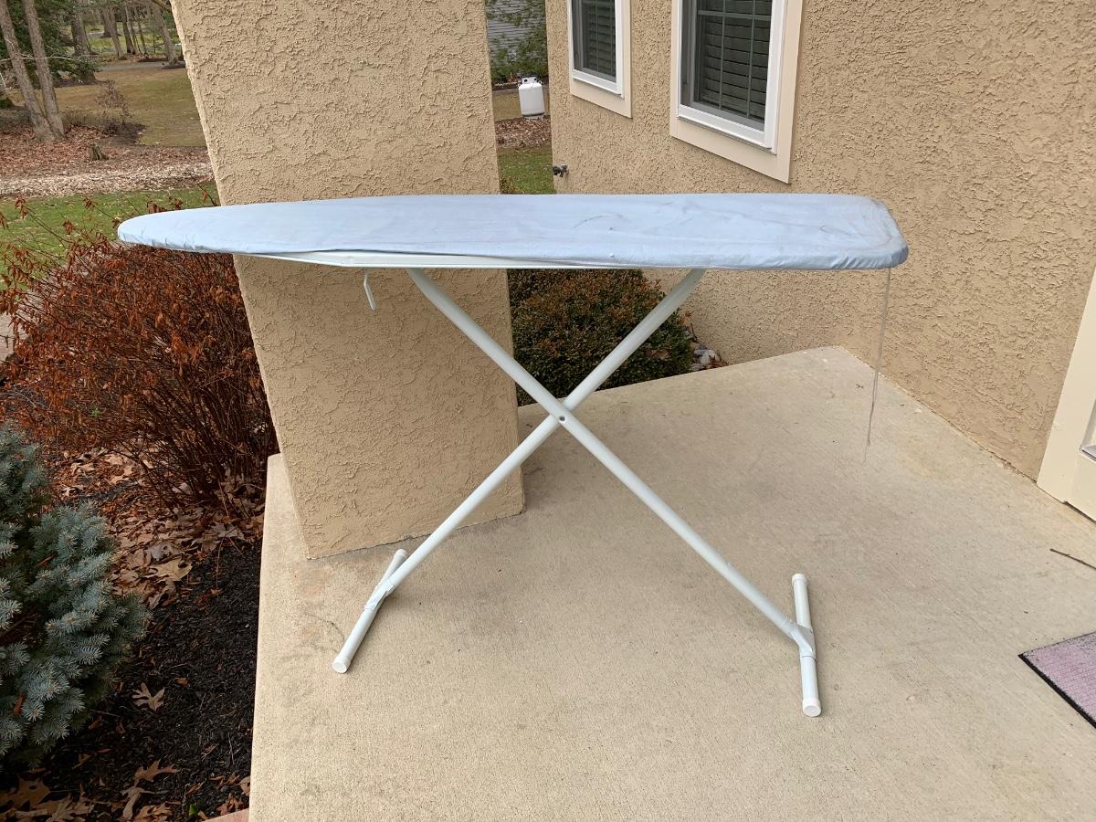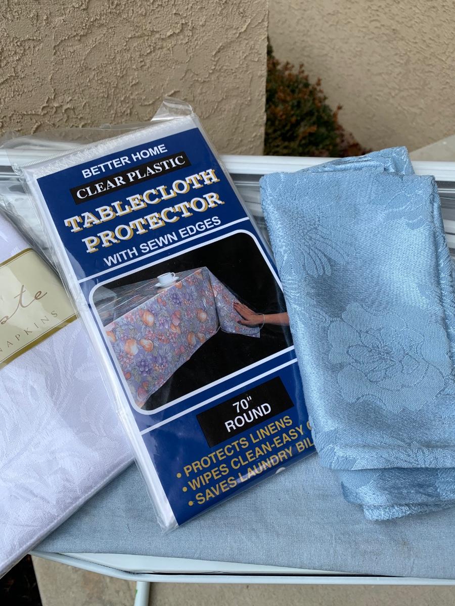 One ironing board with Black & Decker Iron, untested. Includes four Room Essentials white double curtain rods (28-48 inches), and two wall mounted shelves measuring 5 x 47 inches. Includes a variety of kitchen linens & a clear tablecloth protector with sewn edges.