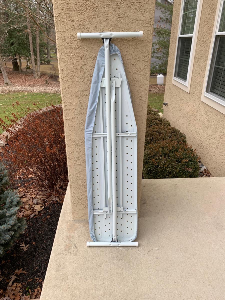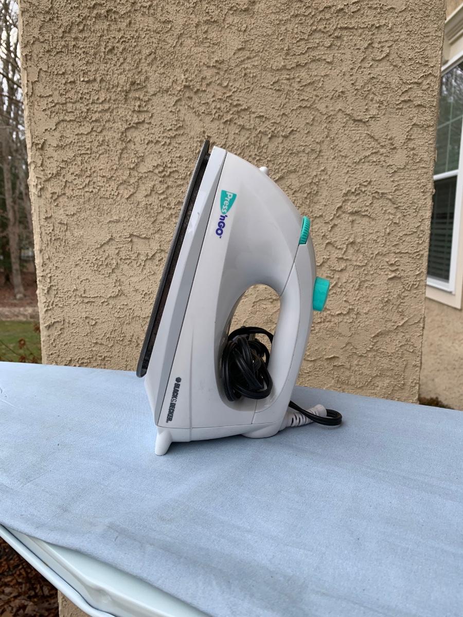 LOT 96R: Ironing Board, Black & Decker Press'n Go Iron, Curtain Rods & Shelves