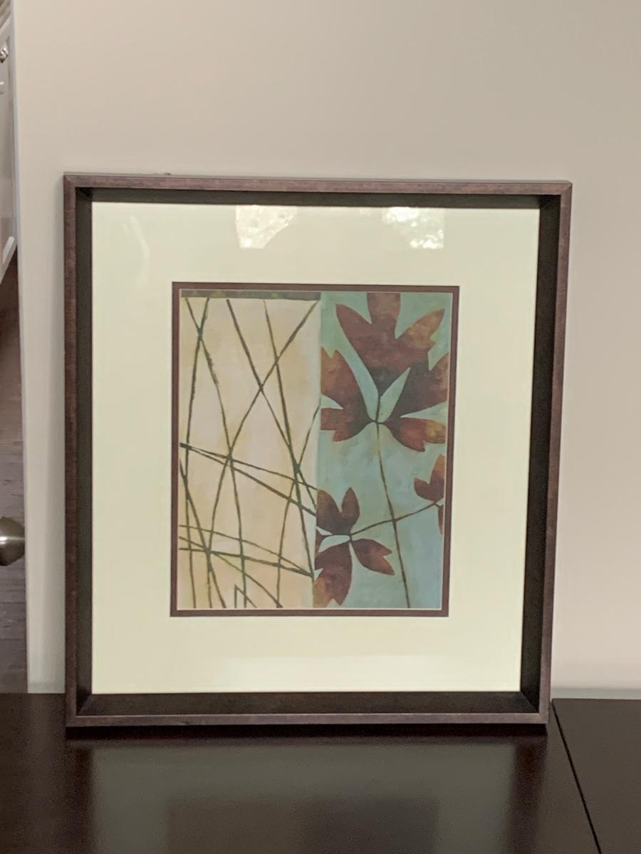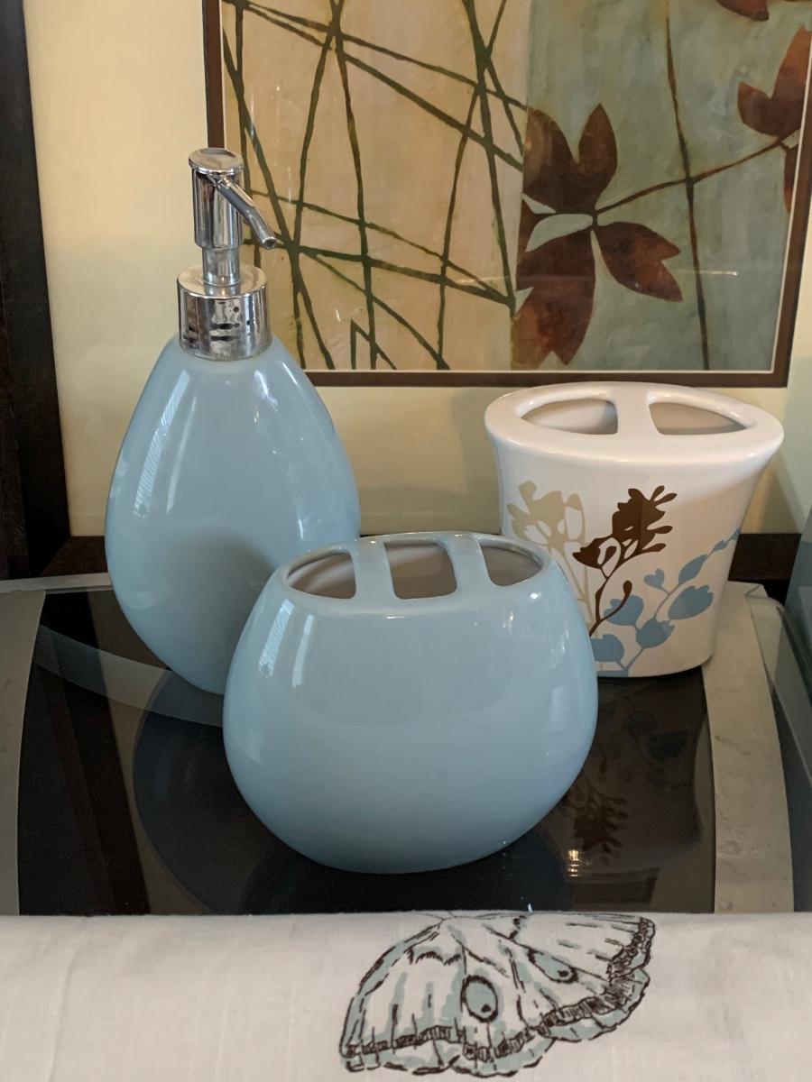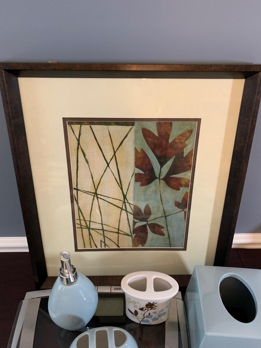 Includes a curtain with birds and flowers on it, two toothbrush holders, a soap dispenser, tissue box cover, and a framed print of leaves measuring 18 x 19.5 inches. Scale appears to be working.