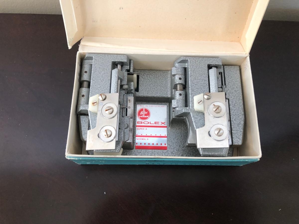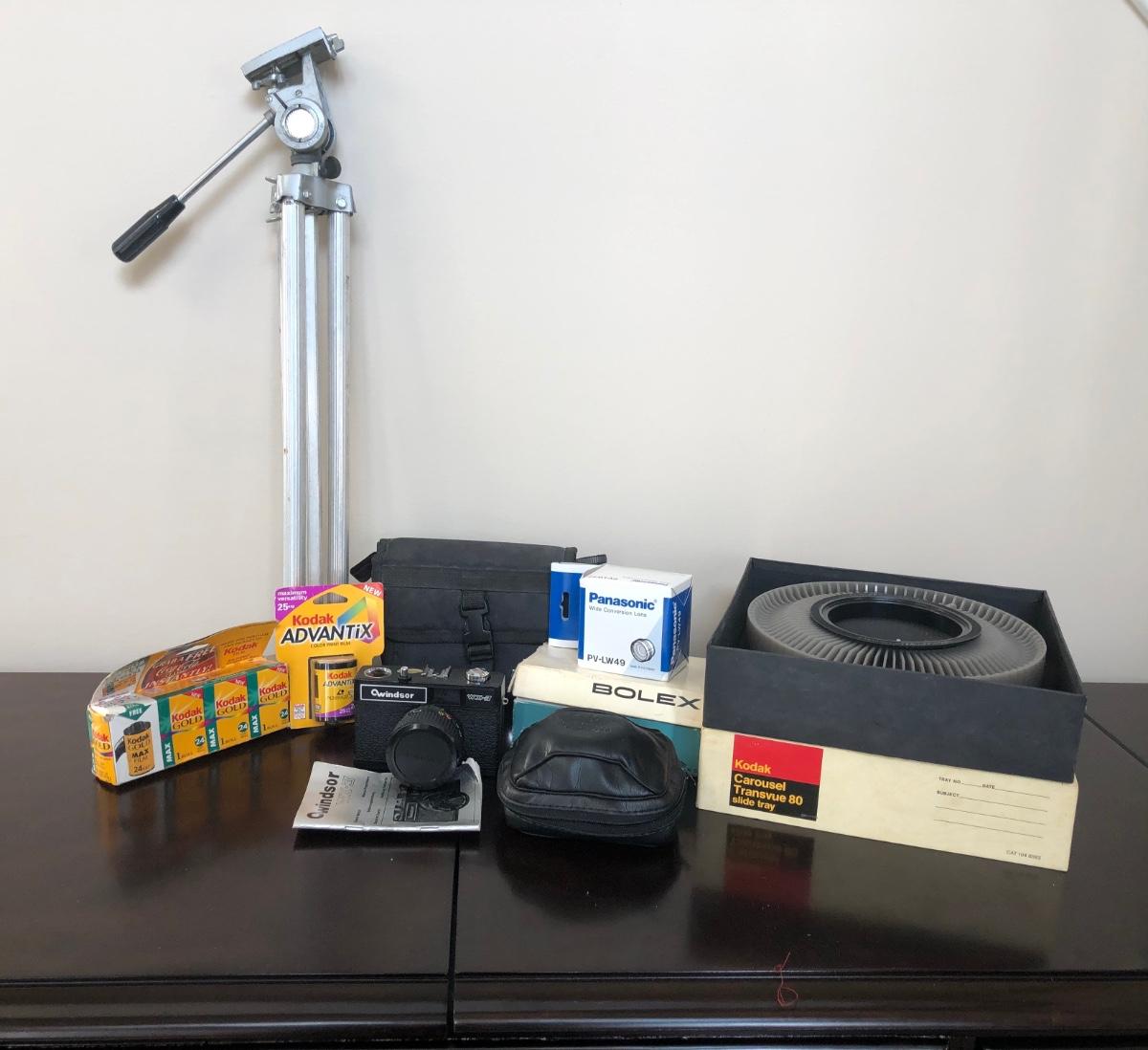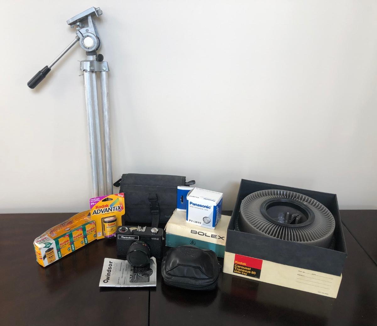 Includes Windsor WX-3 with manual and case, a Panasonic wide conversion lens with a case and original box, a Bolex film splicer, a pack of Kodak Advantix 200 Color Print Film (expired March 2001), four rolls of Kodak Gold Max 35mm Film (expired June 1999), a Kodak slide carousel, a Pentax Zoom 70-X 35mm point-and shoot camera, and a small silver tripod.