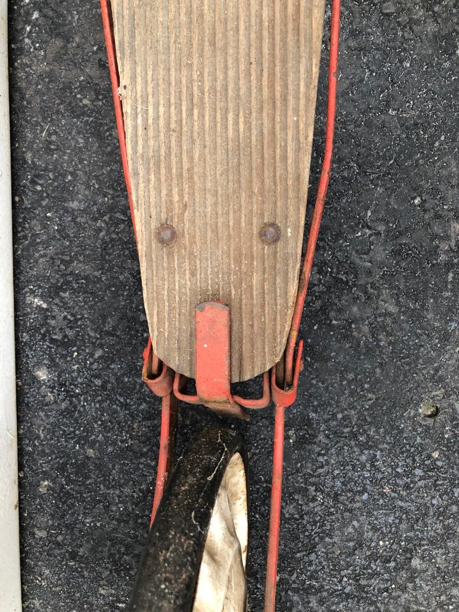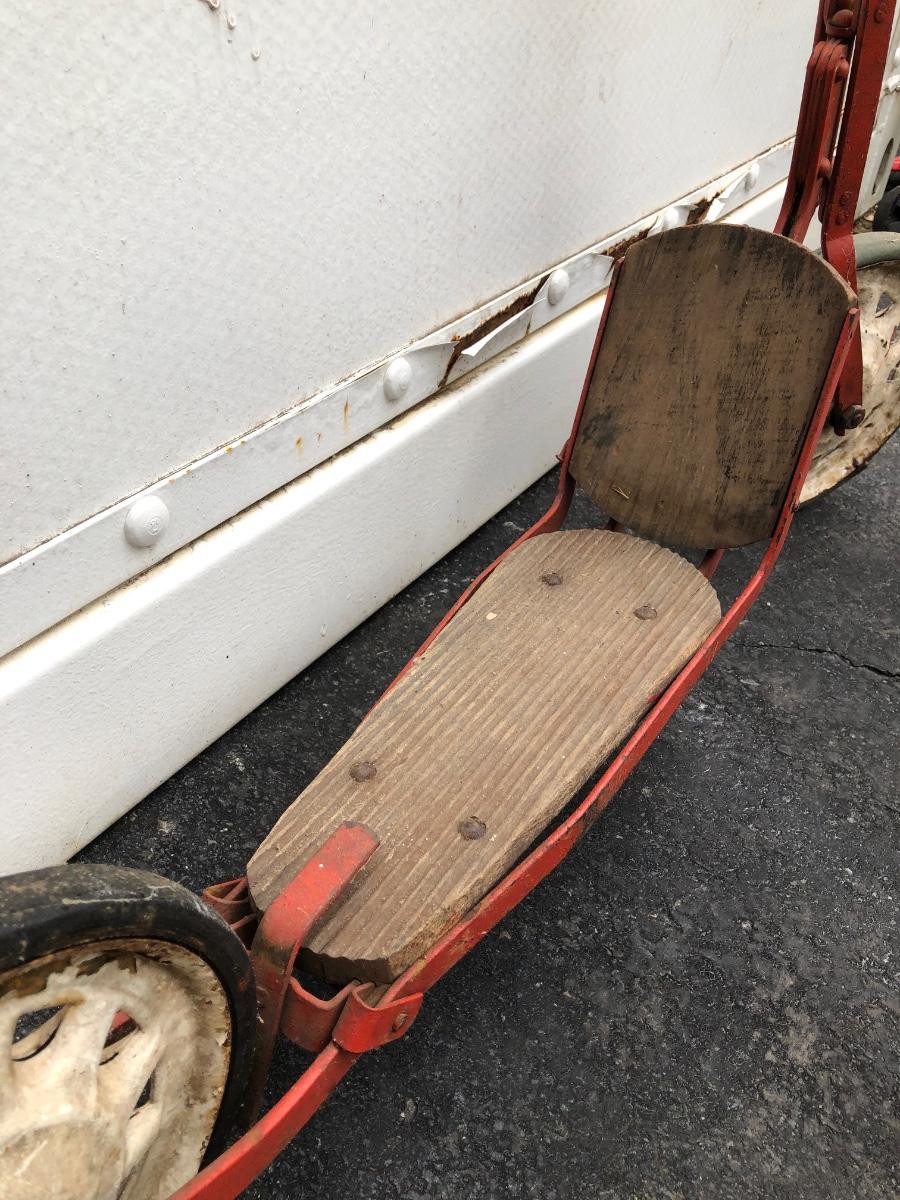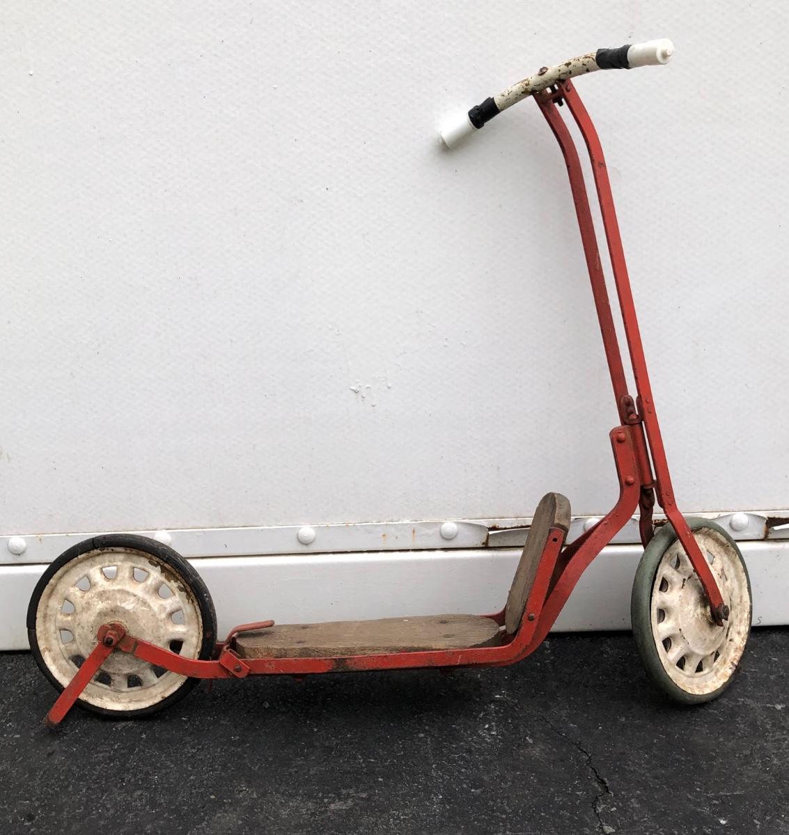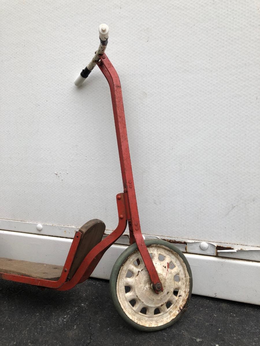 Scooter is made of metal with a wooden foot pad. Scooter is heavily worn, taped at the handles, and has damage on the back wheel.