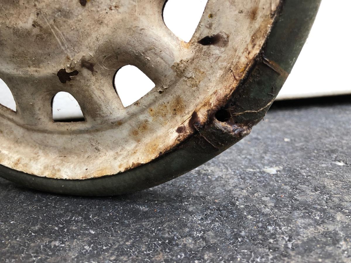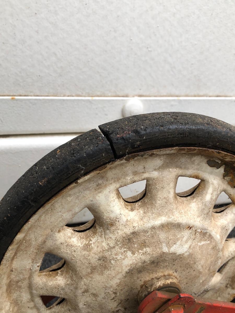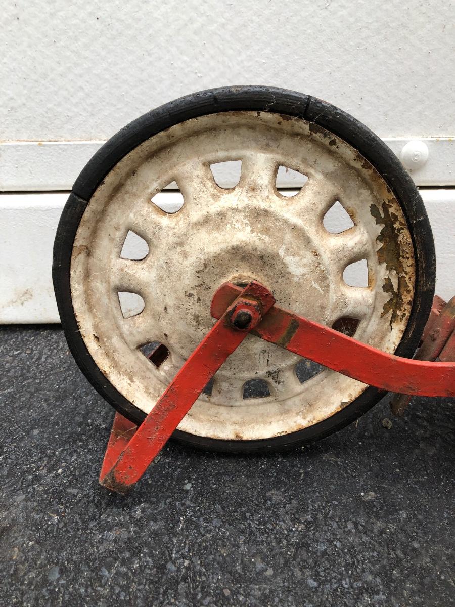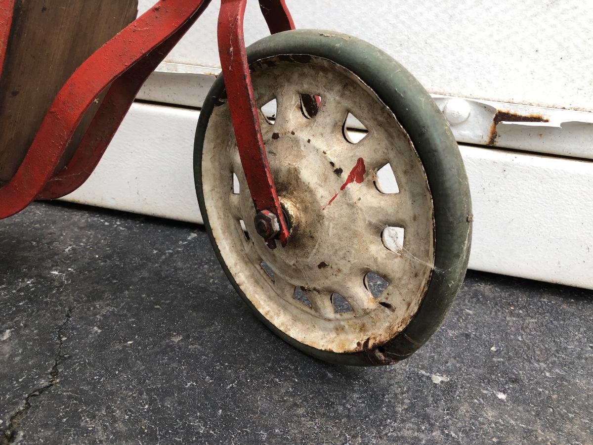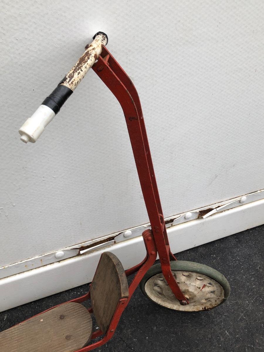 Scooter is made of metal with a wooden foot pad. Scooter is heavily worn, taped at the handles, and has damage on the back wheel.