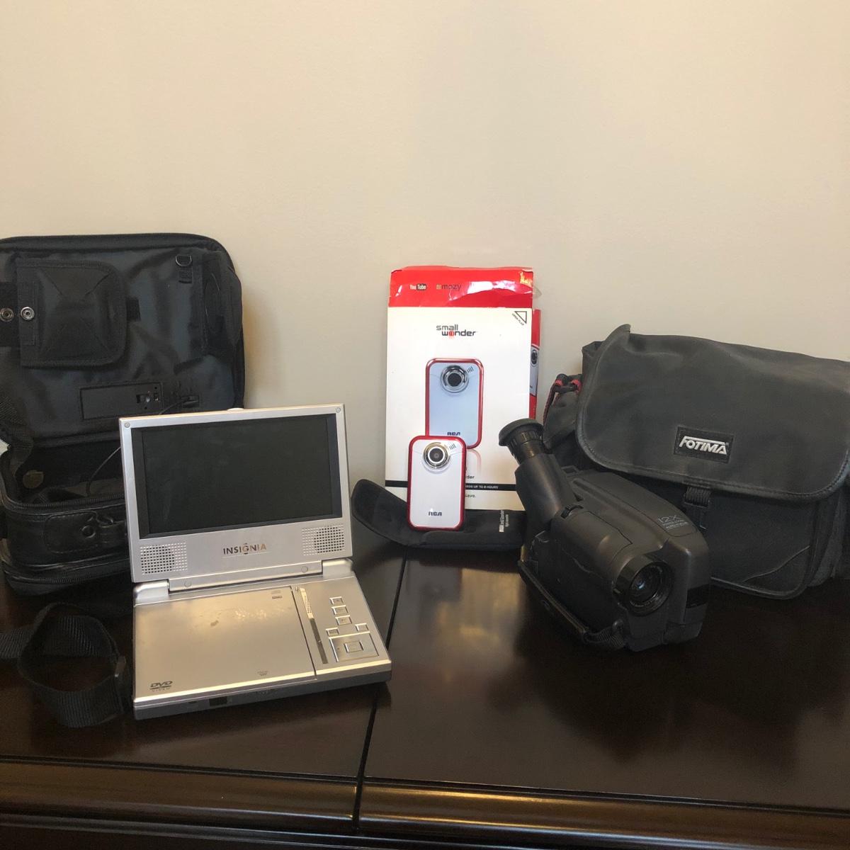 LOT127M: Insignia Portable DVD Player w/ Sound FM Speaker Case, GE VHS-C Camcorder, & RCA Small Wonder Digital Camcorder