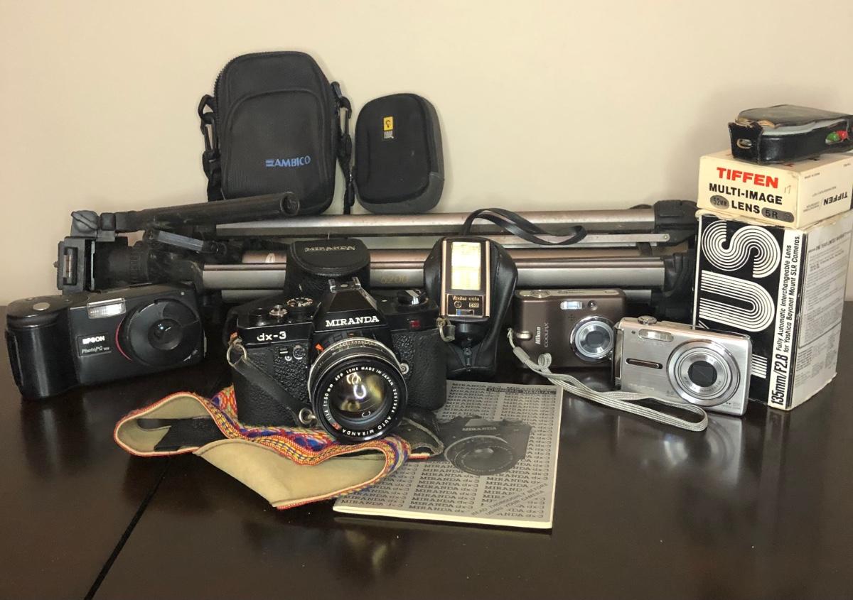 Miranda is in good condition, untested. Includes a 2-part cover that snaps over the camera and lens. Collection of camera accessories include a vintage Cavalier Selector light meter, a Vivitar auto 252 Flash, a YUS 55mm f2.8 lens for Yashica Bayonet Mount SLR cameras, a Tiffen multi-image screw-in lens/filter for 52mm lenses, a tripod and two small camera cases.