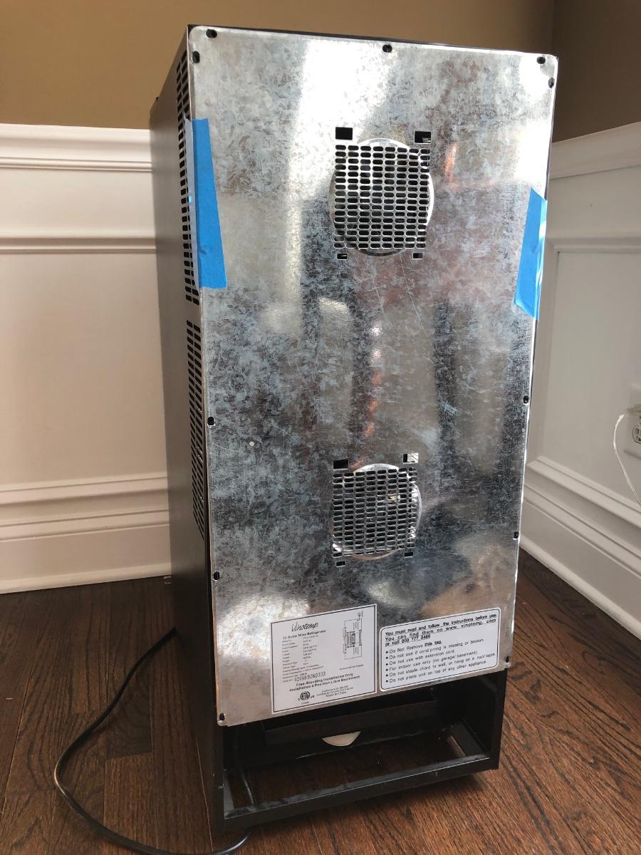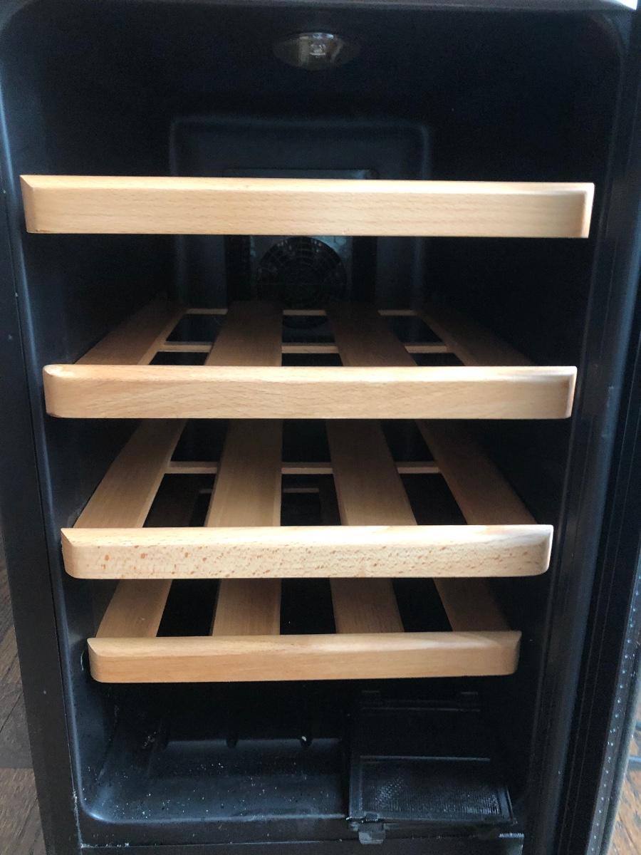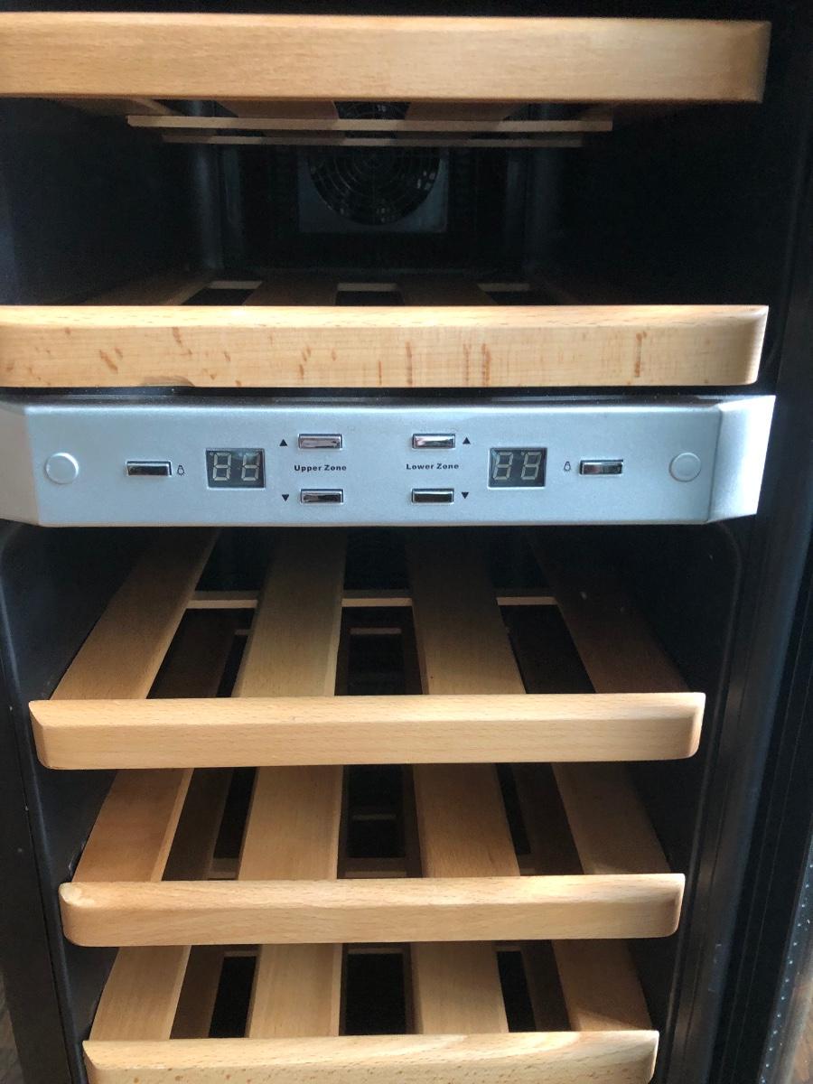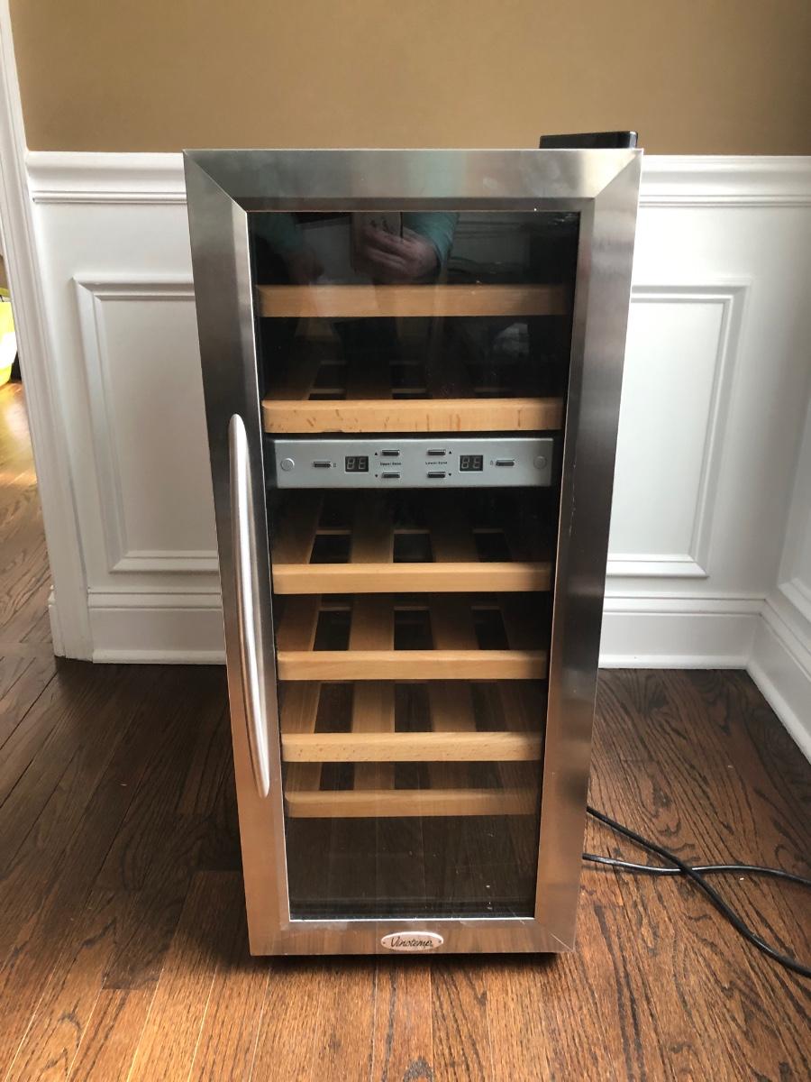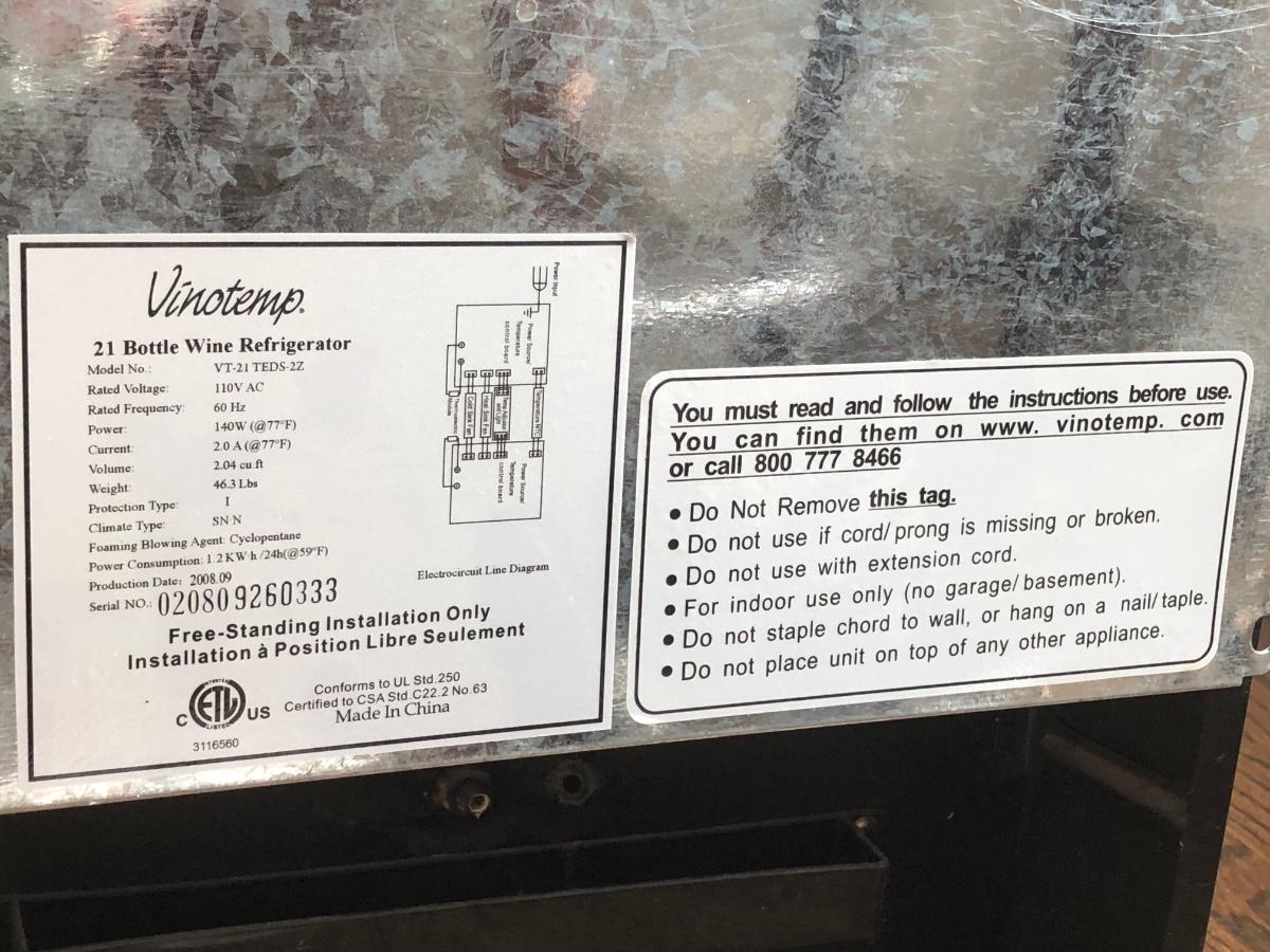 Includes owner's manual and can hold 21 bottles. Back of the wine refrigerator needs to be screwed on (see photos - affixed with tape). Untested and believed to have a temperature control issue.