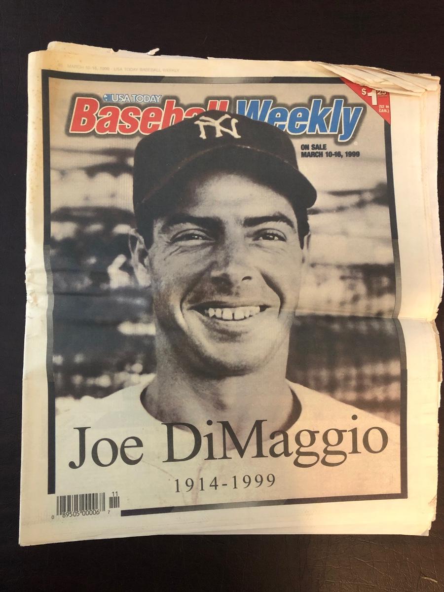 This collection of memorabilia includes the Baseball Weekly paper announcing the death of legendary Hall of Famer Joe DiMaggio (1914-1999). Dated March 1999.