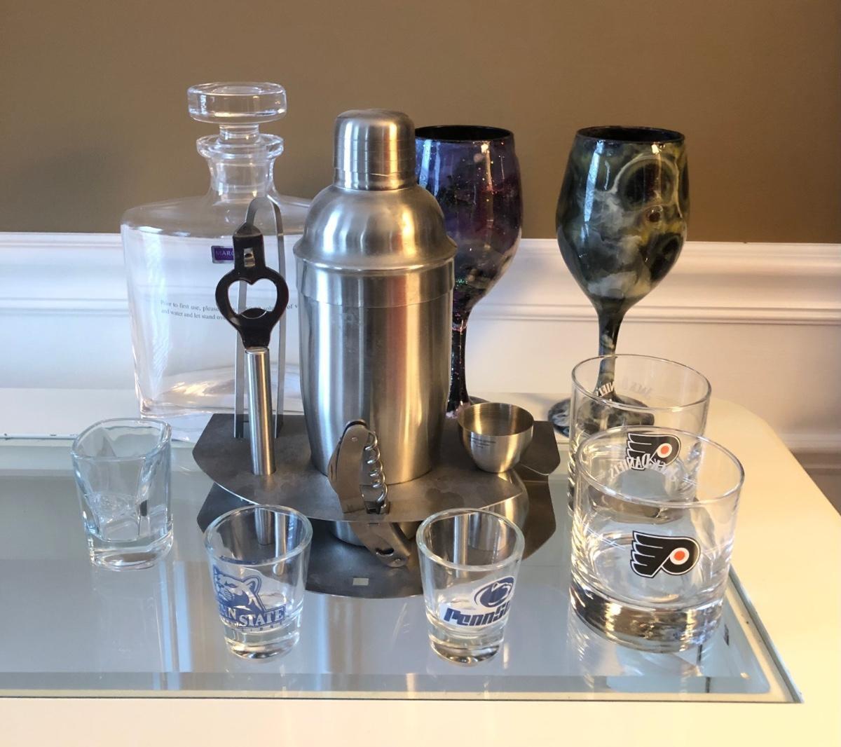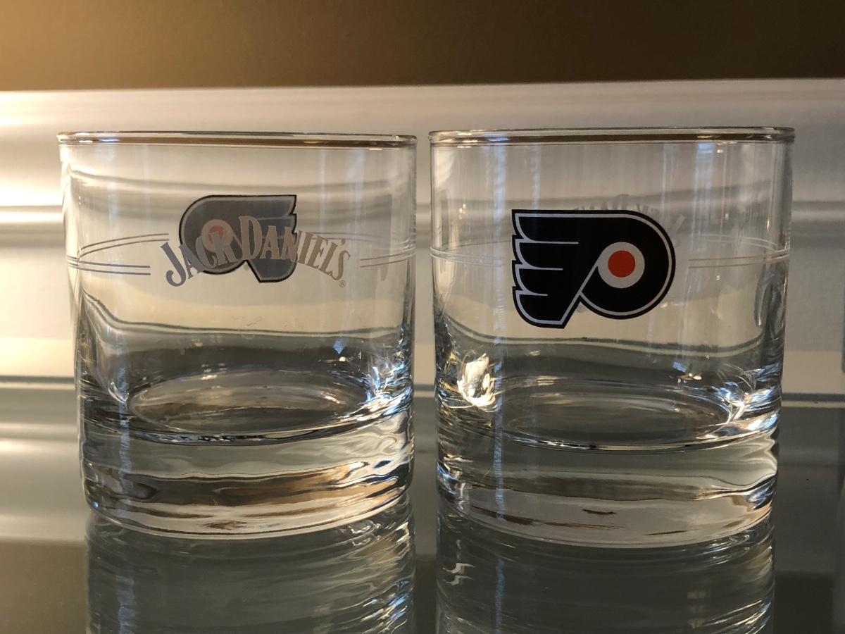 Includes a stainless steel set of bar tools, a glass decanter, three shot glasses and two Jack Daniel's/Flyers glasses. Also includes two galaxy wine glasses.