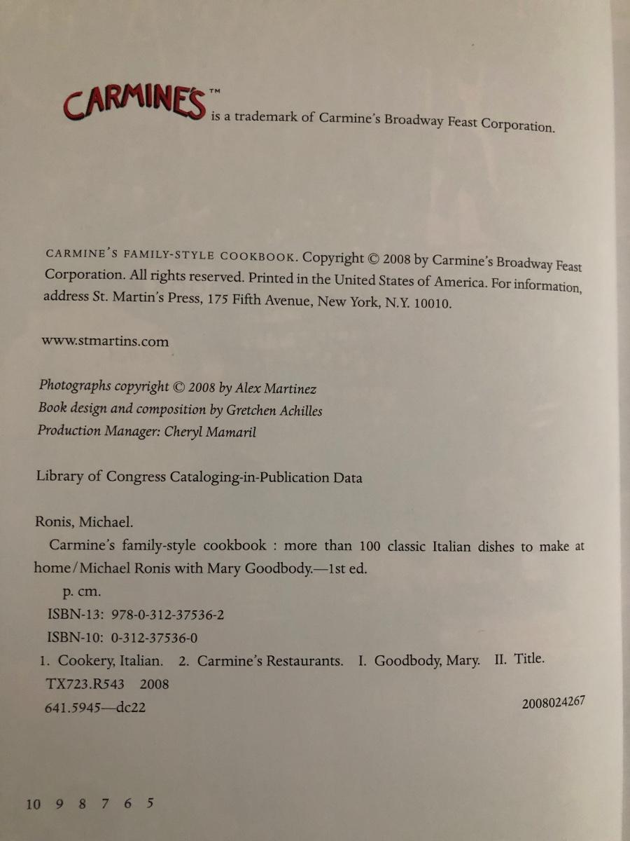 - Carmine's Family-Style Cookbook by Michael Ronis w/ Mary Goodbody