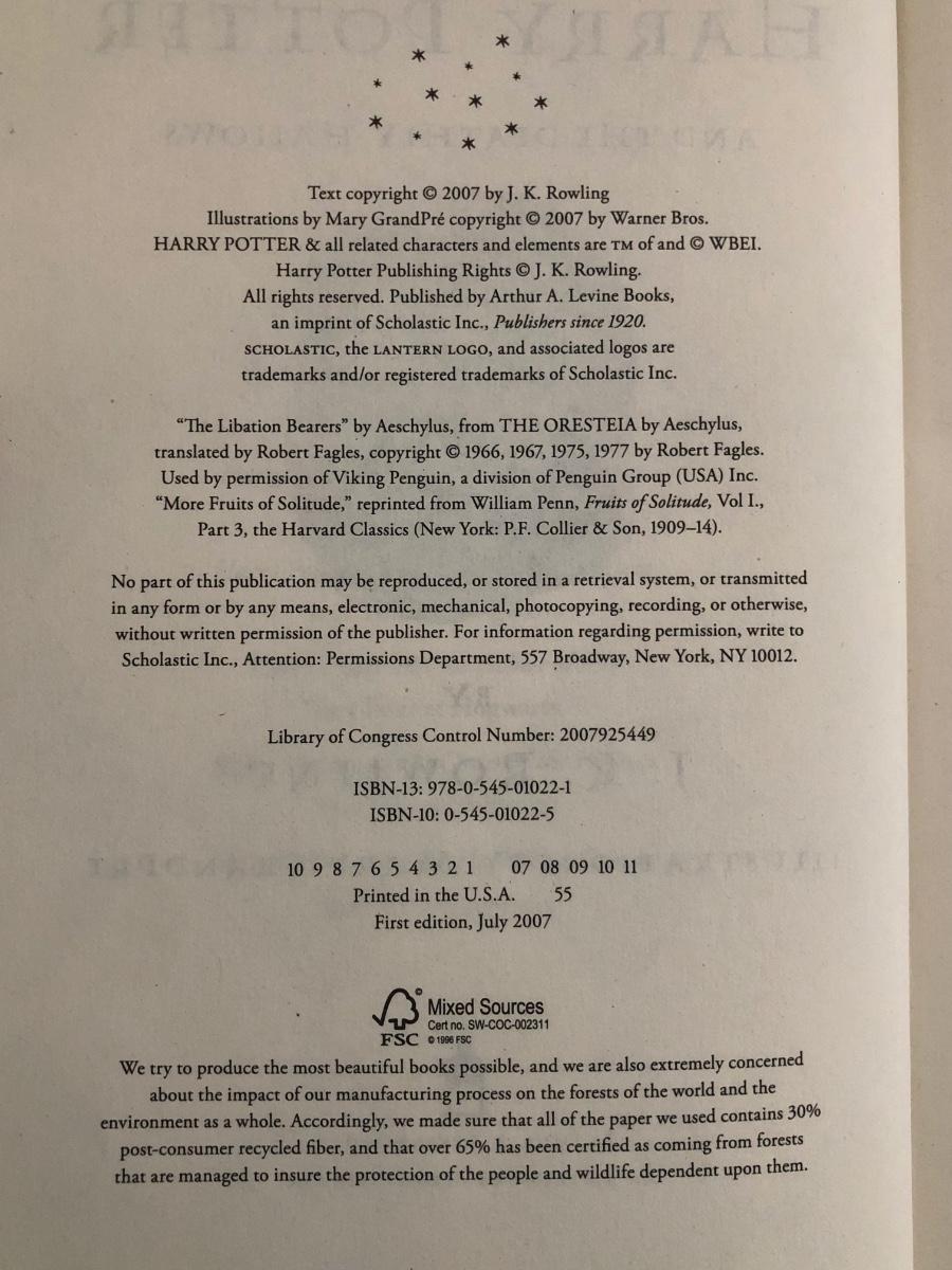 - Harry Potter & the Deathly Hallows by J.K. Rowling (hardback)