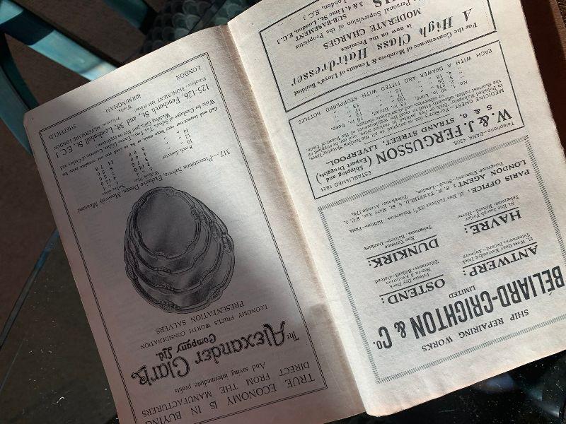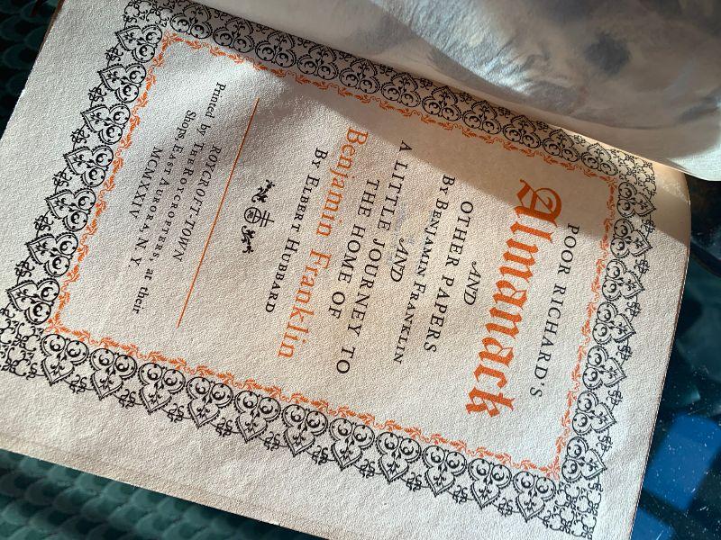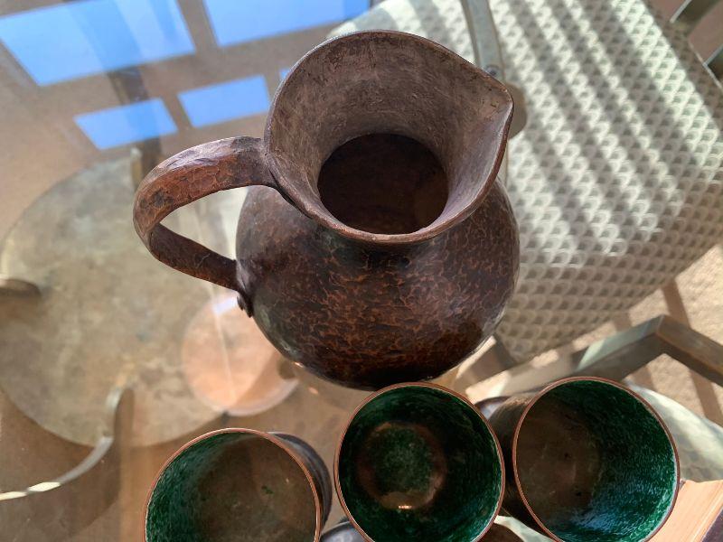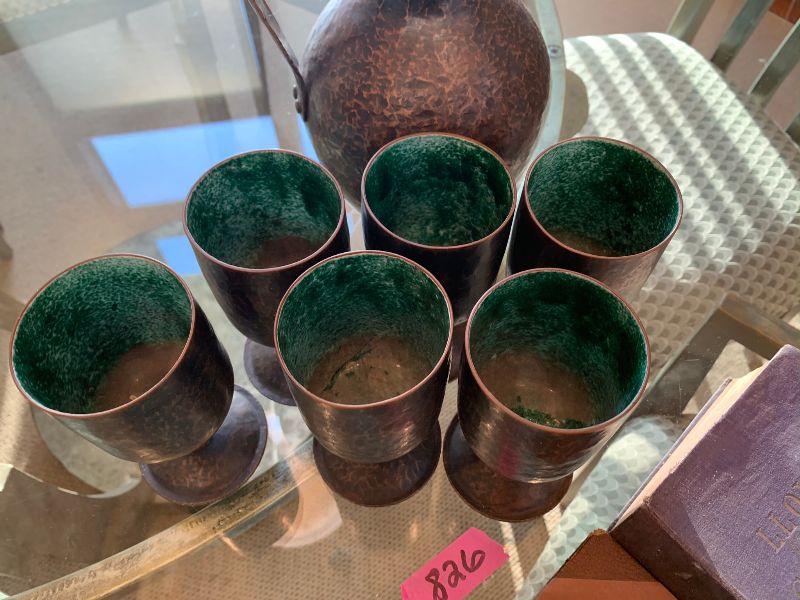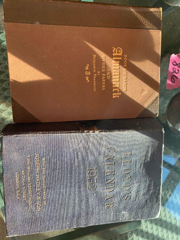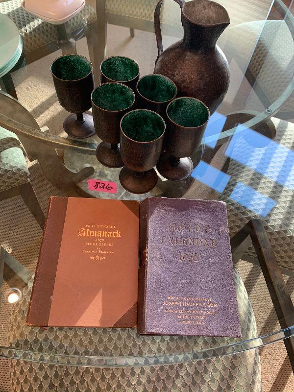 Pitcher and 6 glasses metal and 1 book Poor Richards Almanack and 1 book Lloyd's Calendar 1932