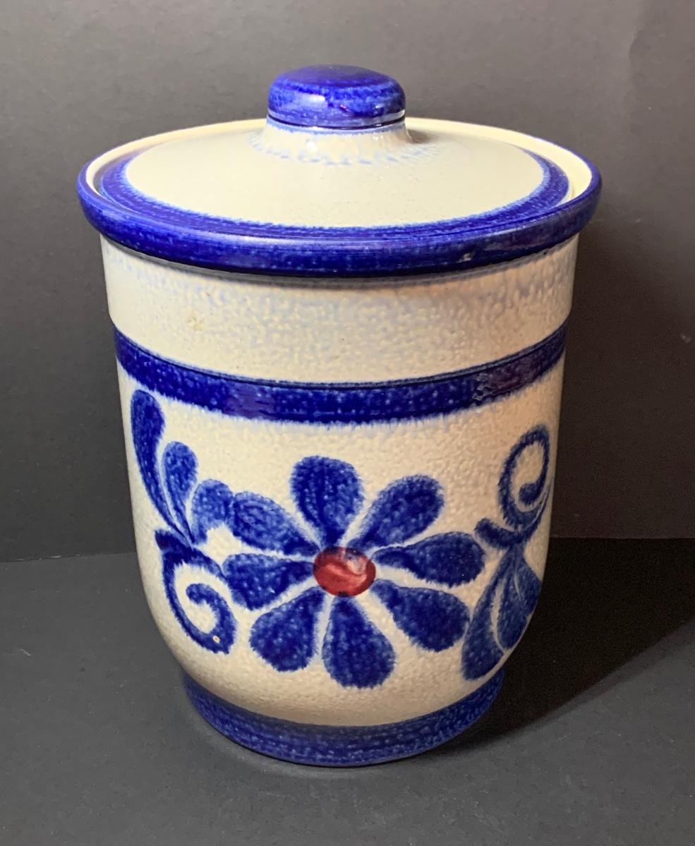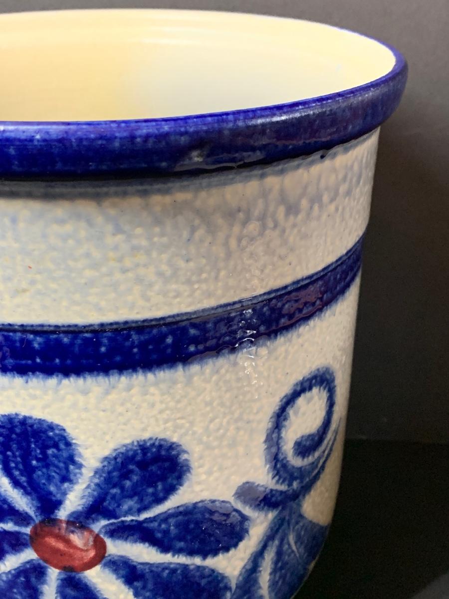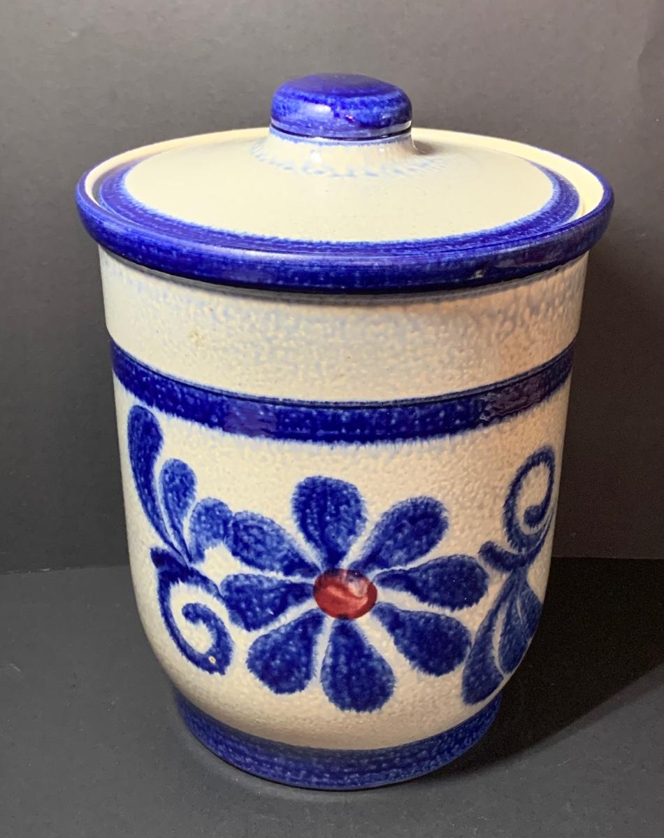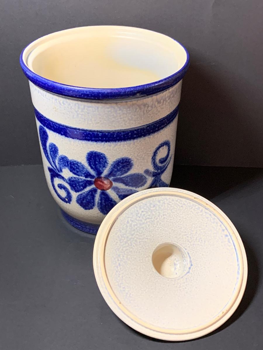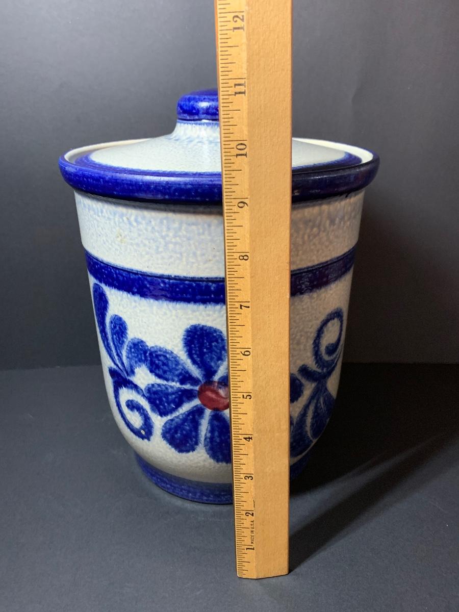 Vintage salt glaze lidded crock with cobalt and red floral design. Pre-owned with minimal wear from age and use. Please see all pictures as they are the best representation of the items. The pictures show condition, measurements if taken, and what is included in the lot. Due to the large amount that we photograph and the time frame, we are not always able to take measurements. All items unless noted, are pre-owned and have been used. If you purchased furniture, you must bring help. We do not allow one person to carry large furniture out on their own. Bring help, tools and a truck for the safety of our client’s homes, and your personal safety. Any damages that result to the property including walls, and floors due to moving of the furniture will be charged to the buyer. Company policy. Thank you.