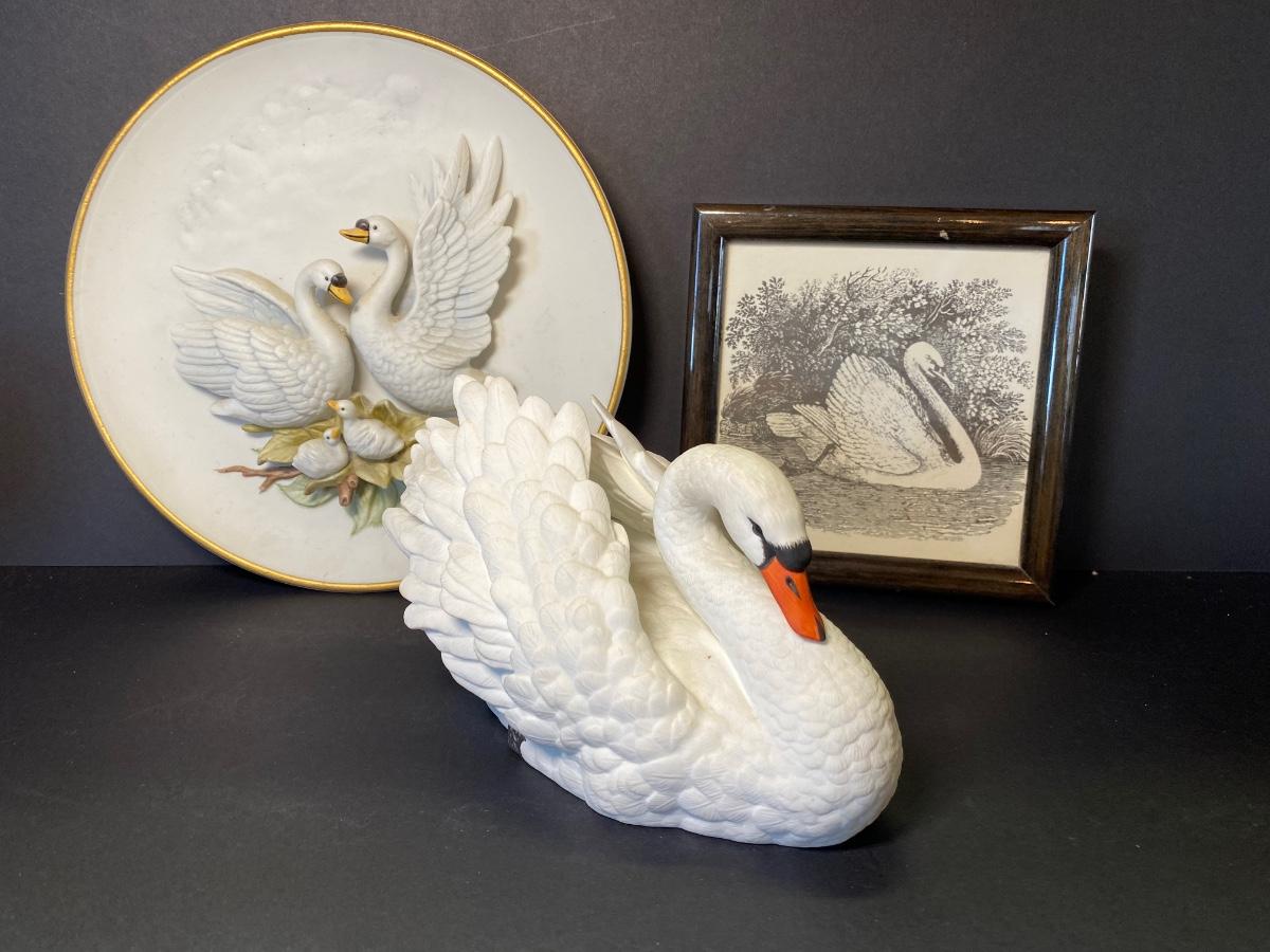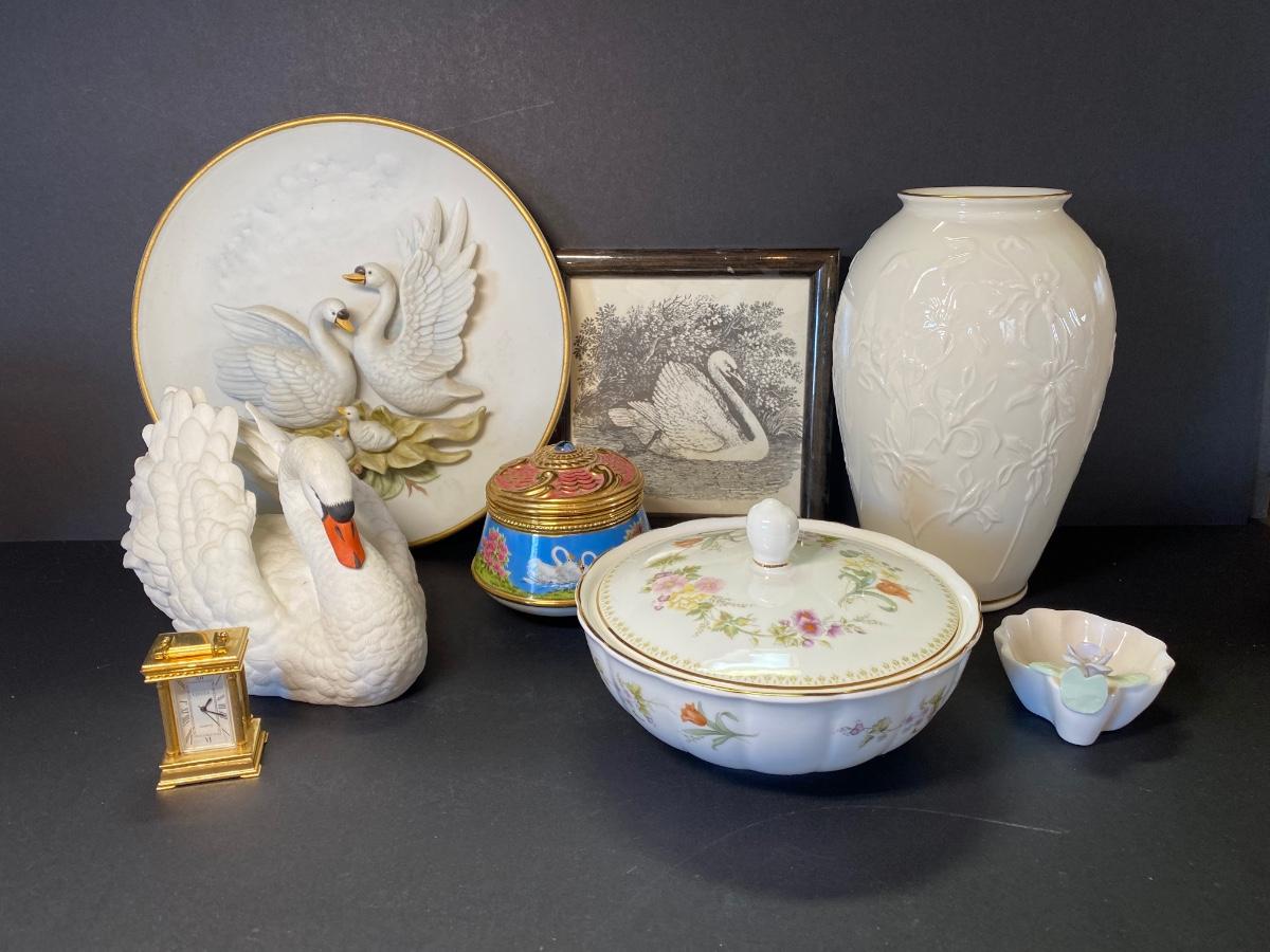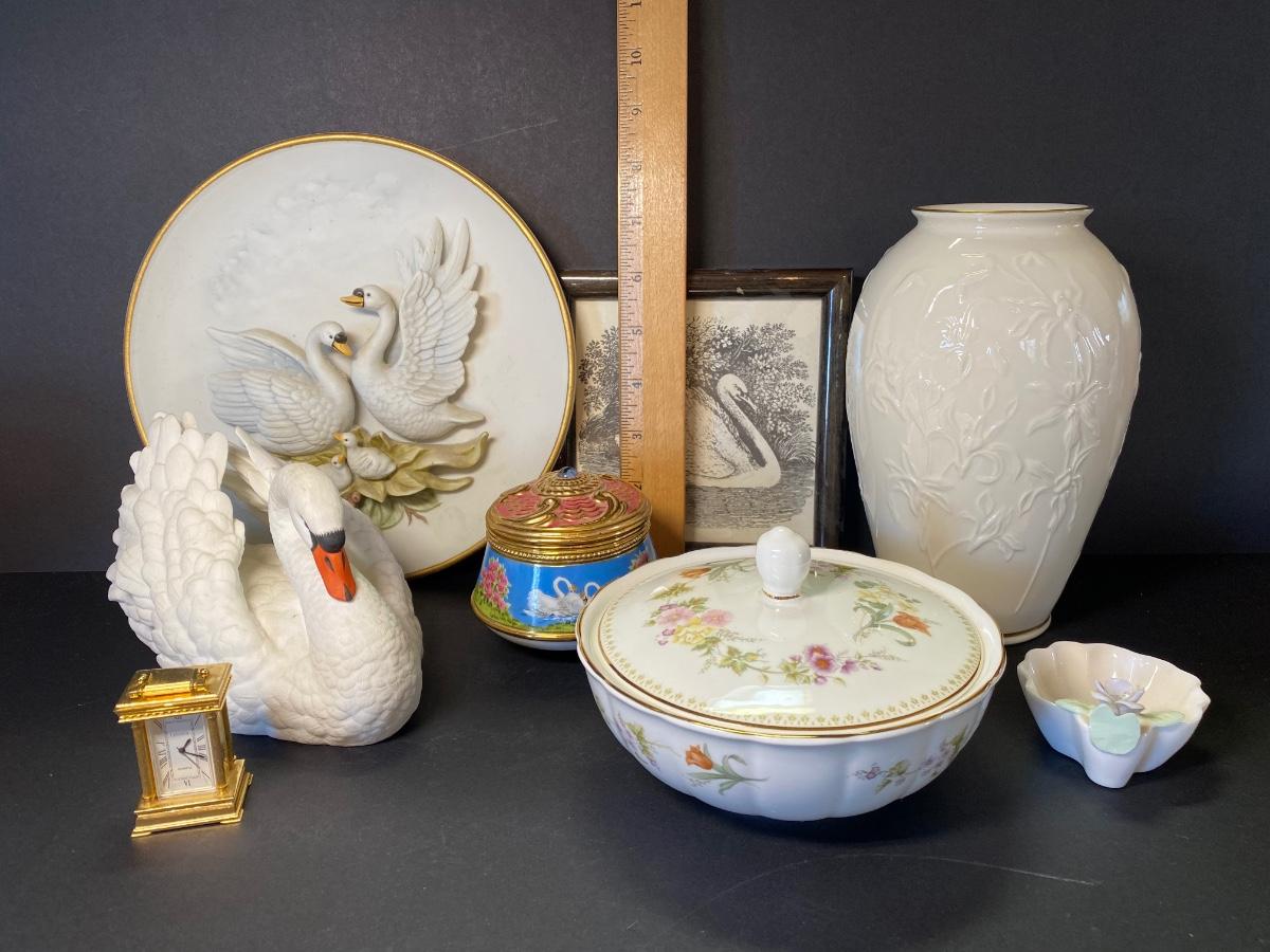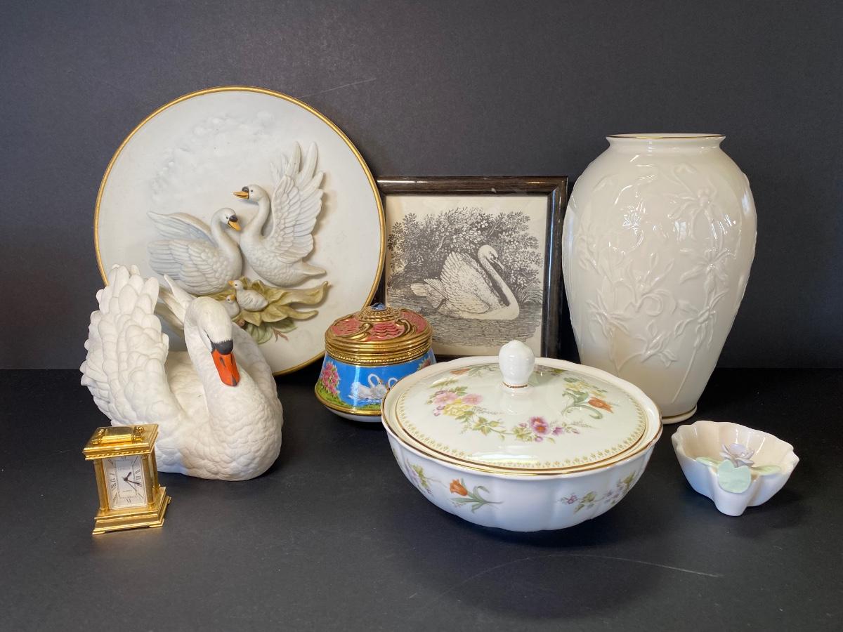 Collection includes Ardalt 3-D Swan Plate, Lenox Swan, Wedgewood's "Mirabelle" lidded bowl, Lenox small vase hand decorated w/24k and