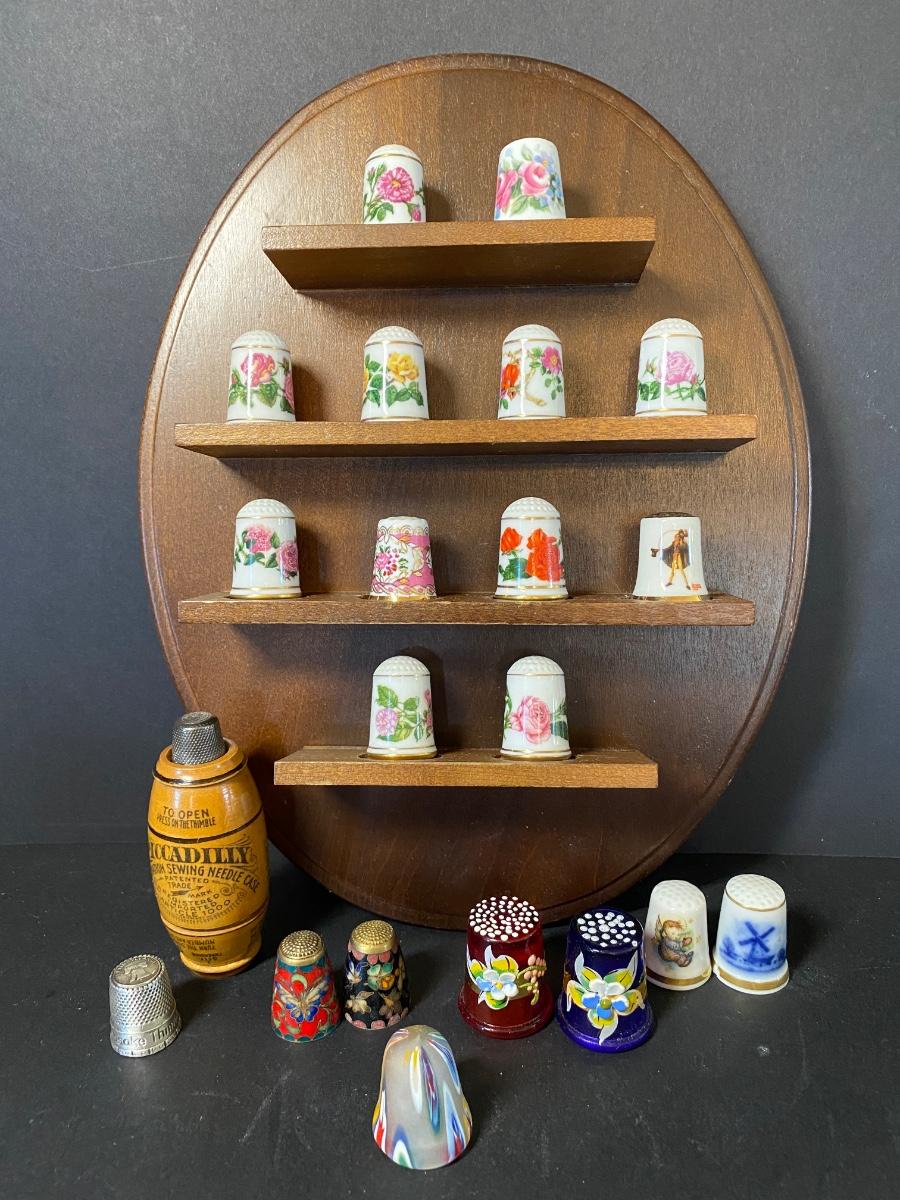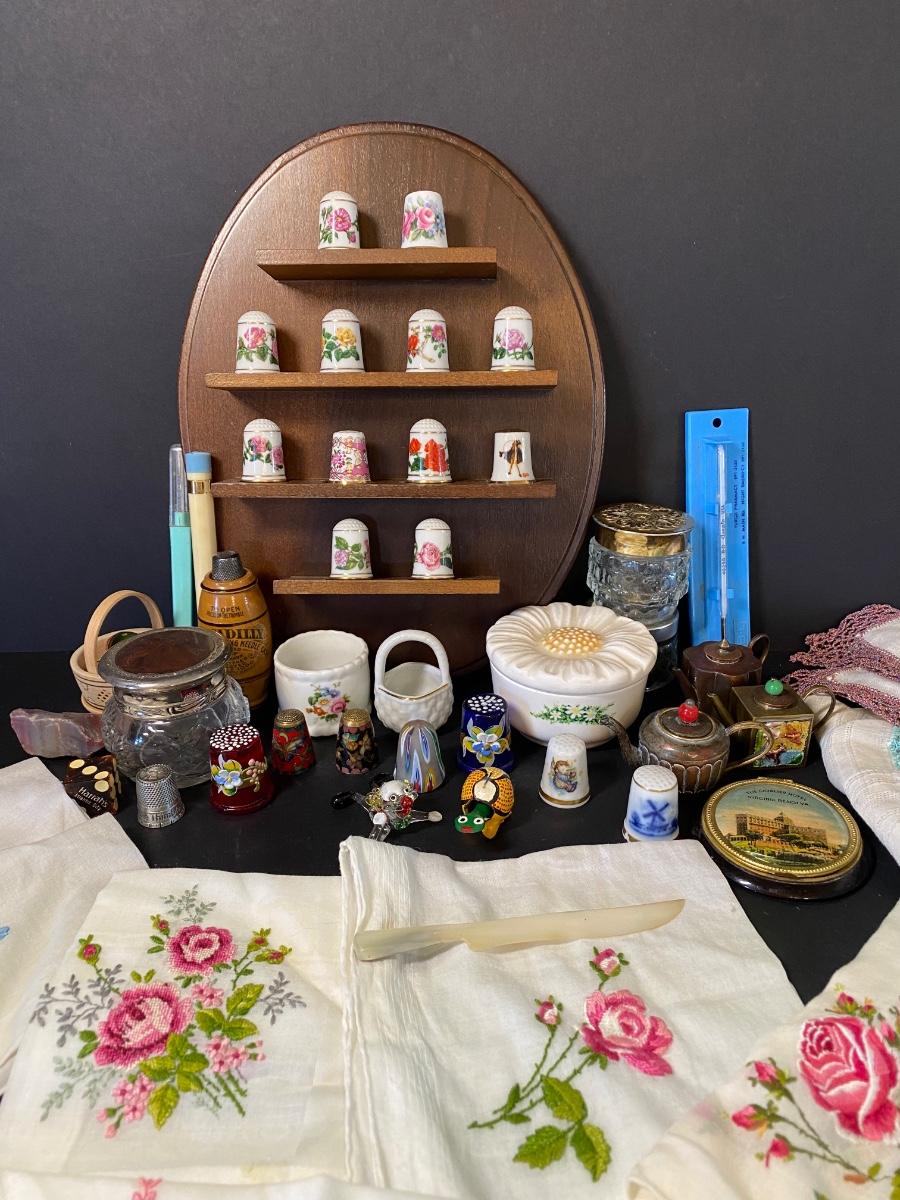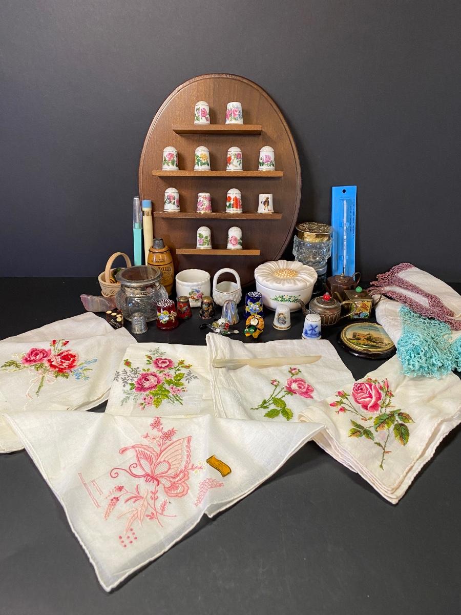 Vintage thimble collection. trinket boxes,perfume jars and ladies handkerchiefs.