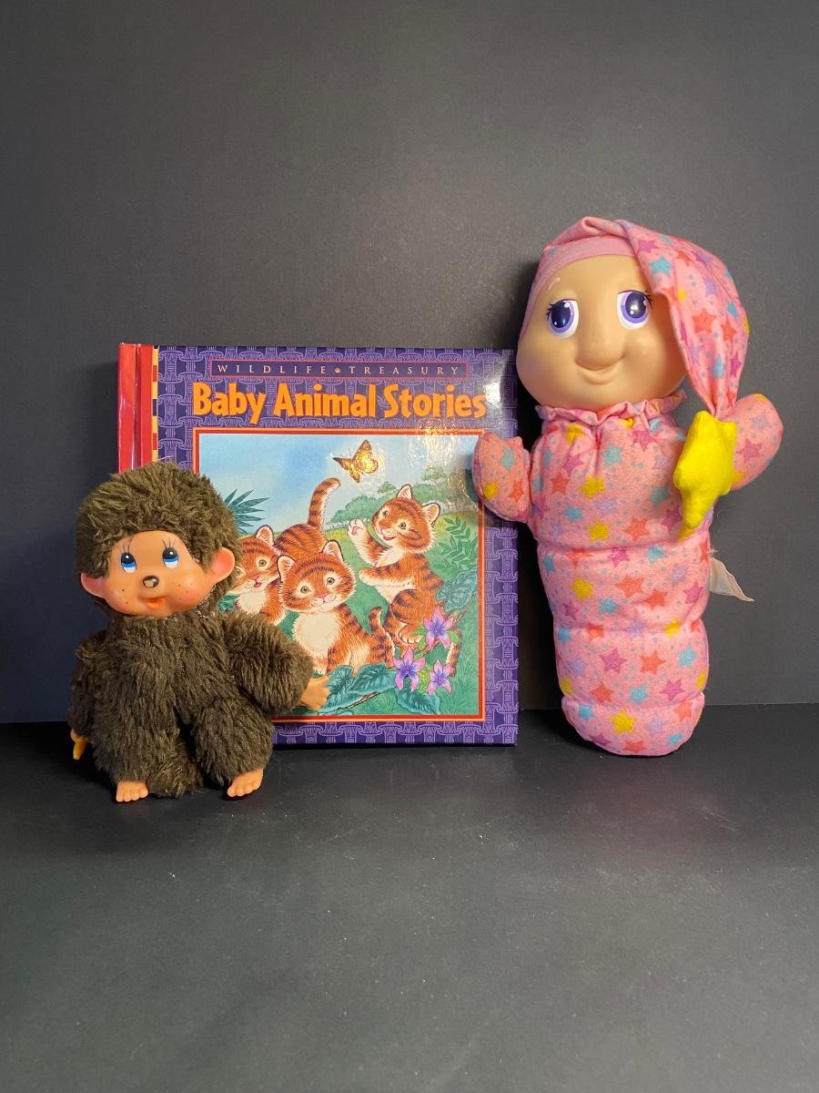 LOT 47C: Vintage Monchichi Thumb Sucking Plush Baby Doll Monkey , Playskool Gloworm & Childrens Book